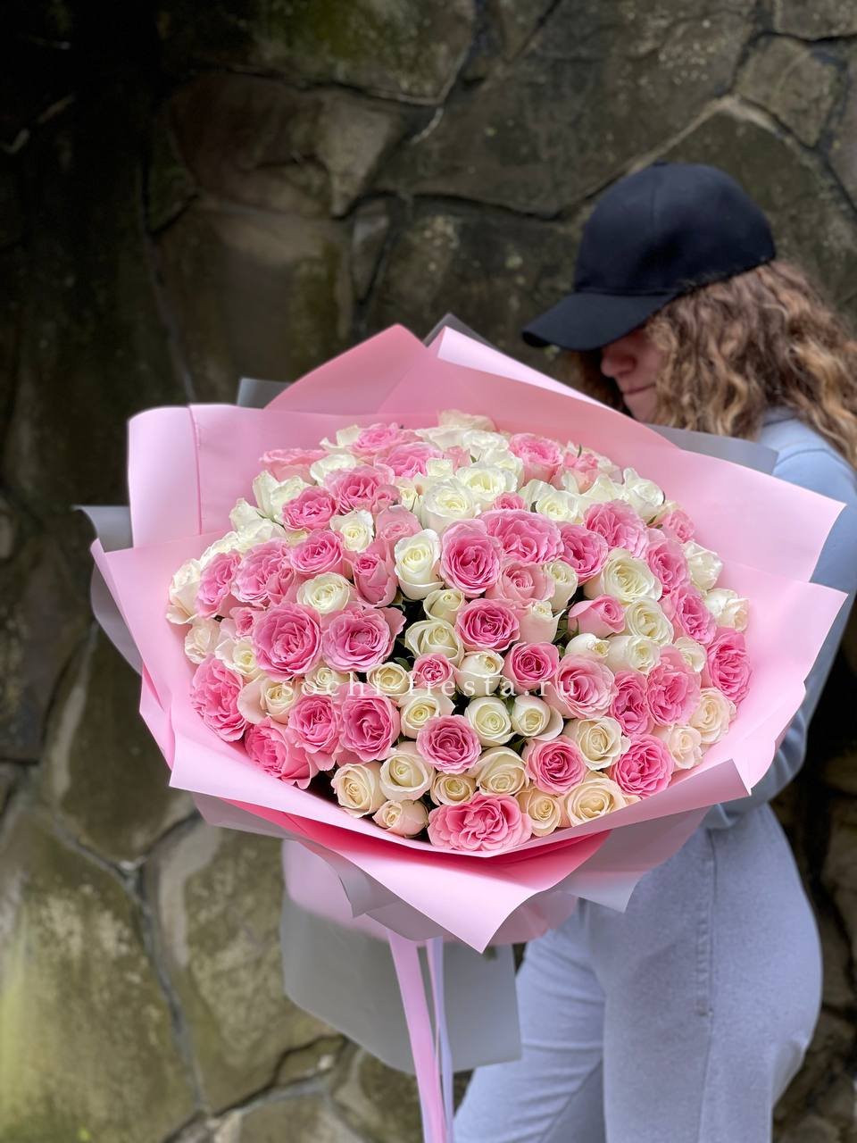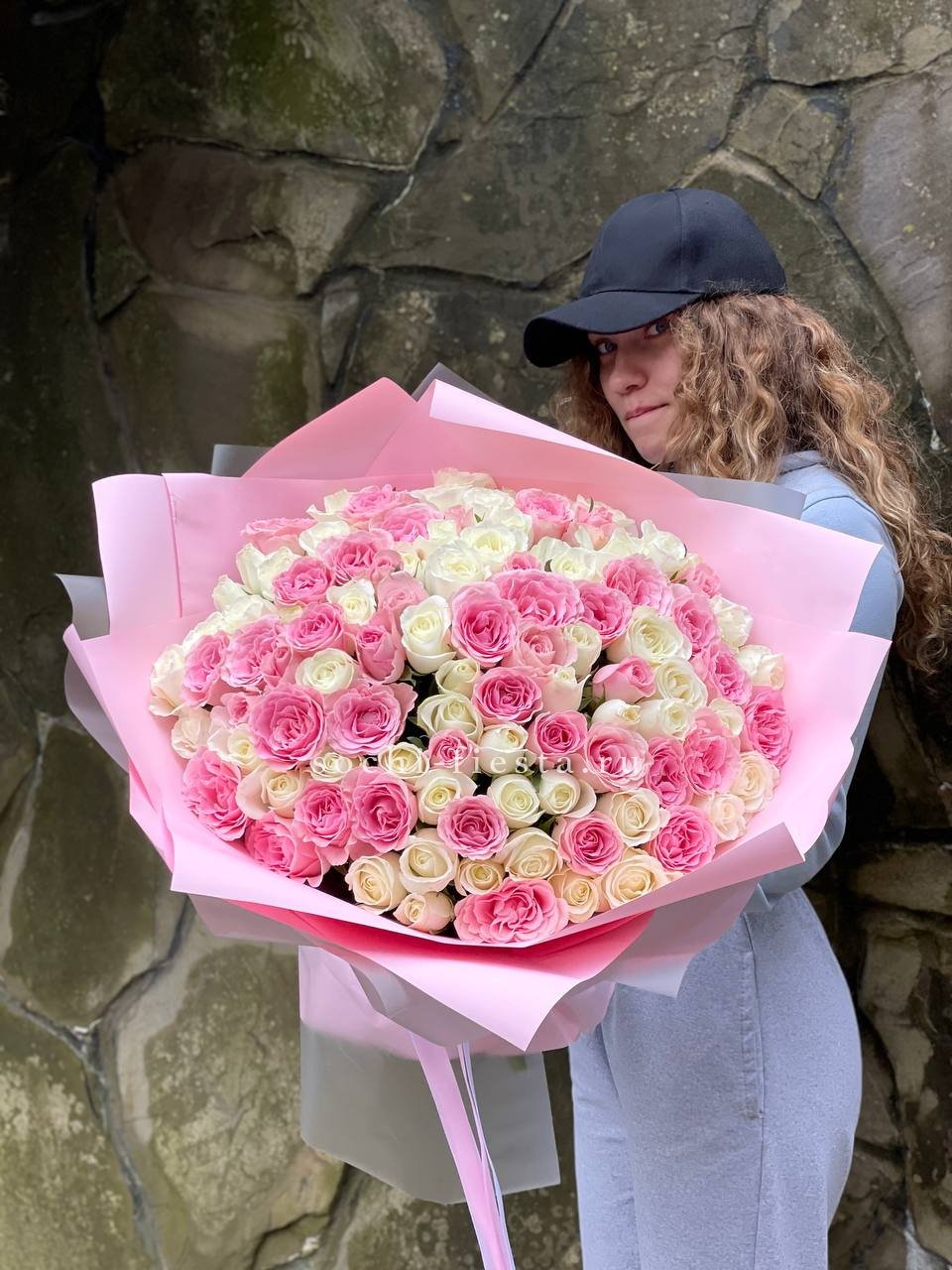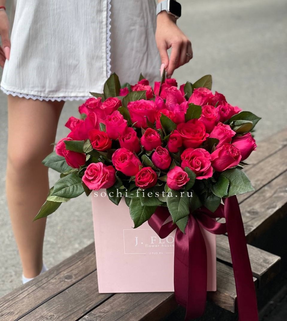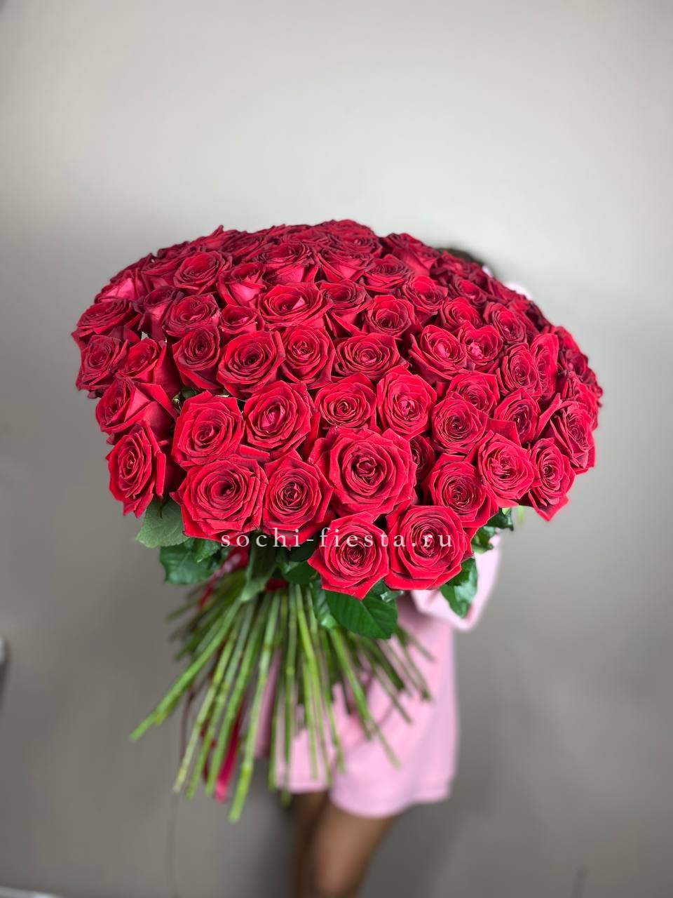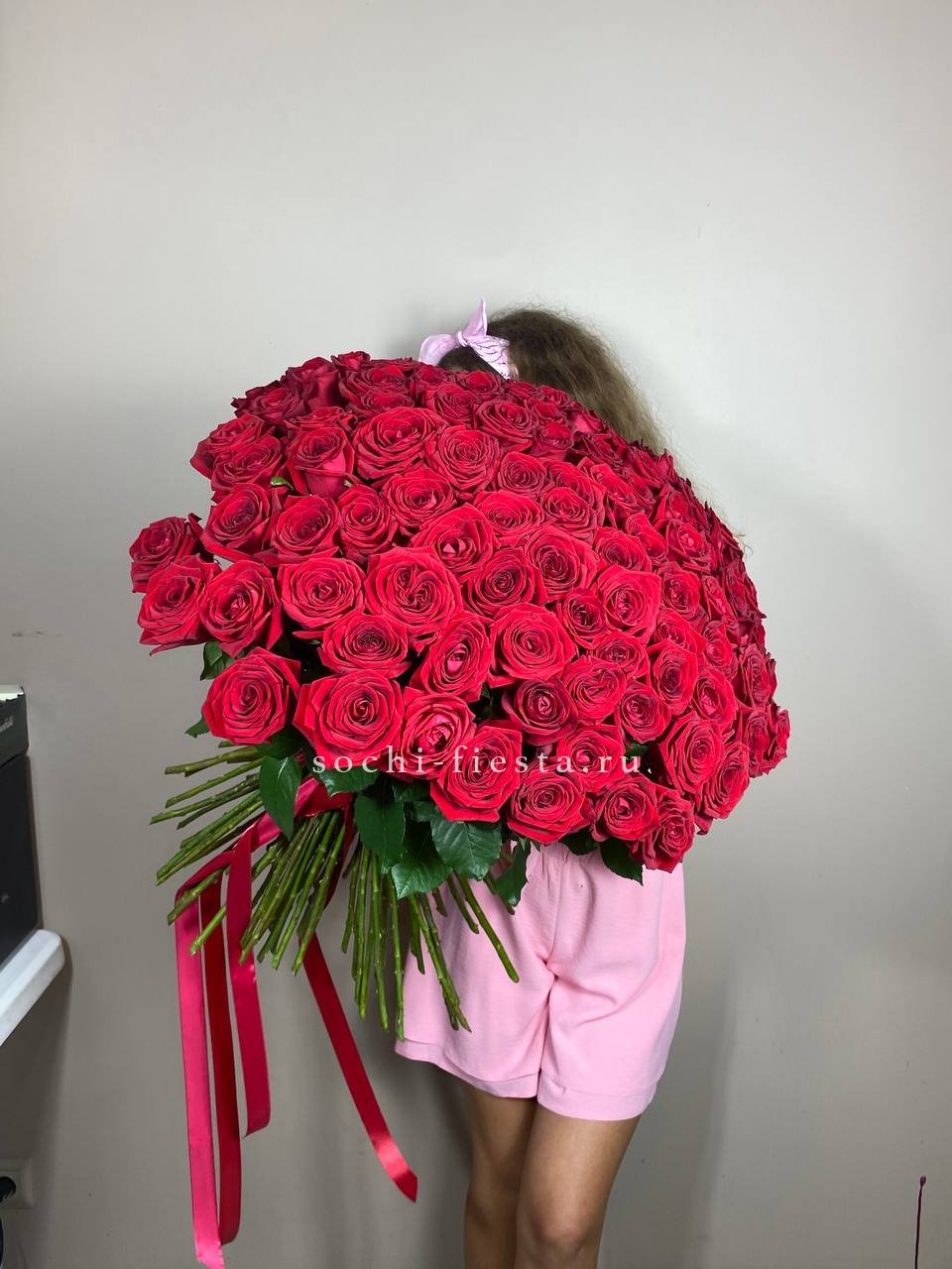 Сто одна кенийская роза в едином цилиндре — это впечатляющий масштаб и безупречная симметрия. Плотный силуэт и насыщенный цвет создают мощное визуальное присутствие. Композиция звучит сама за себя.