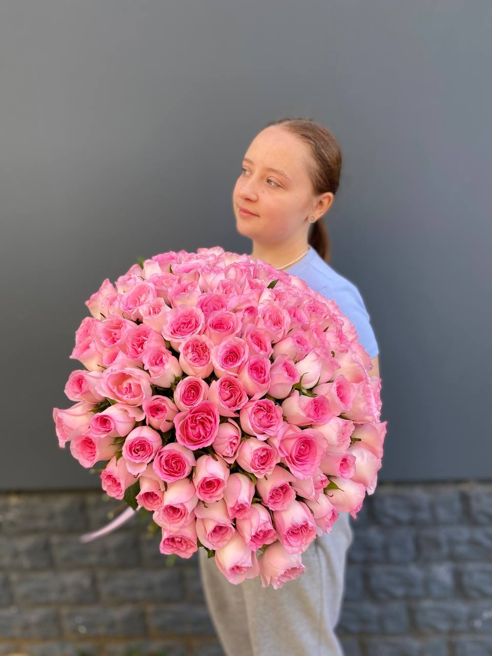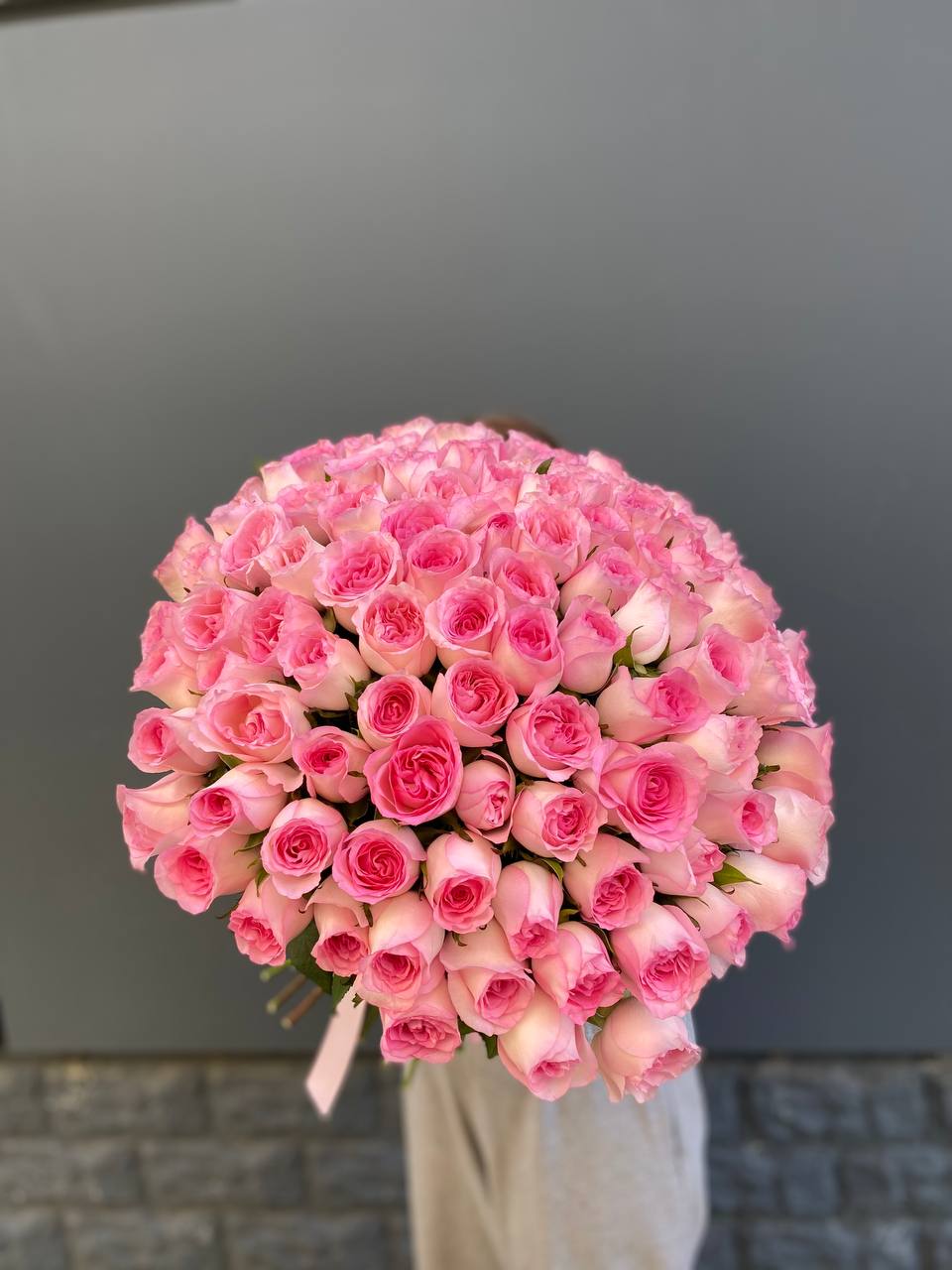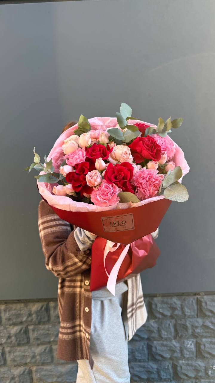 Вывернутые розы раскрывают пышную внутреннюю структуру лепестков и задают фактурный ритм композиции. Гортензия и диантусы дополняют объём воздушными соцветиями в лаконичном боксе.