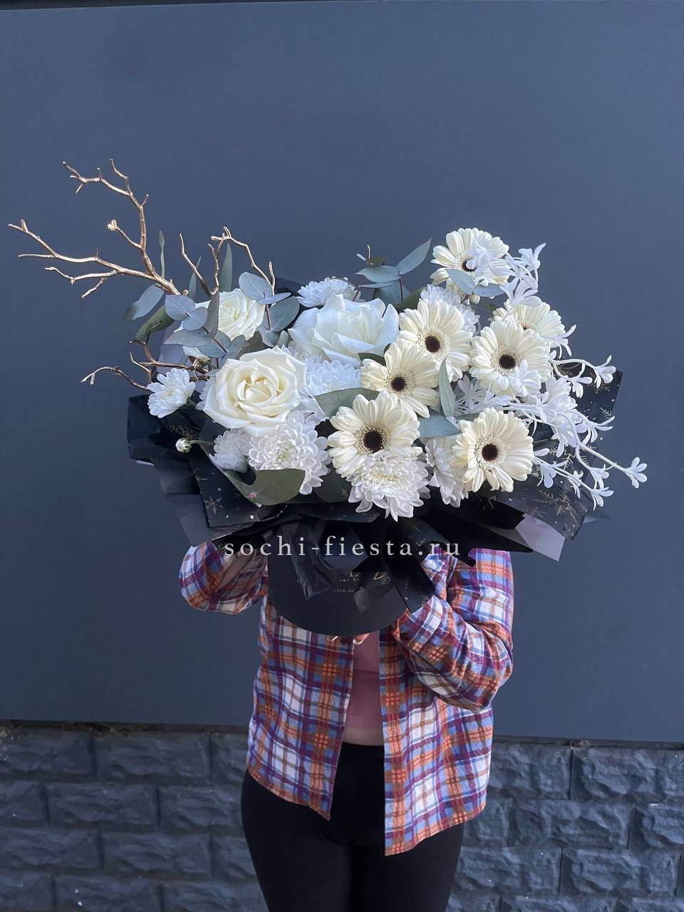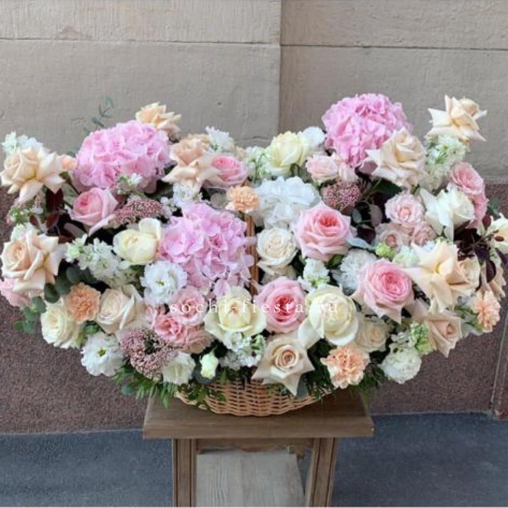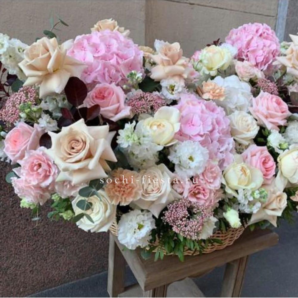 гортензия, вывернутые розы, диантус, кустовая роза, диантусы, оформление в боксе.