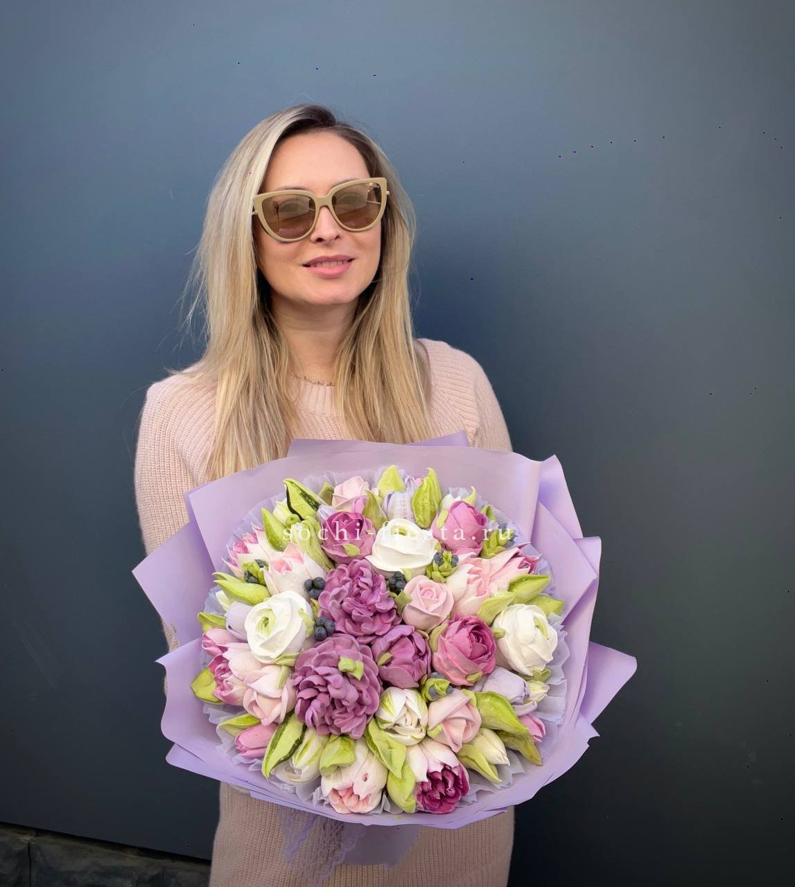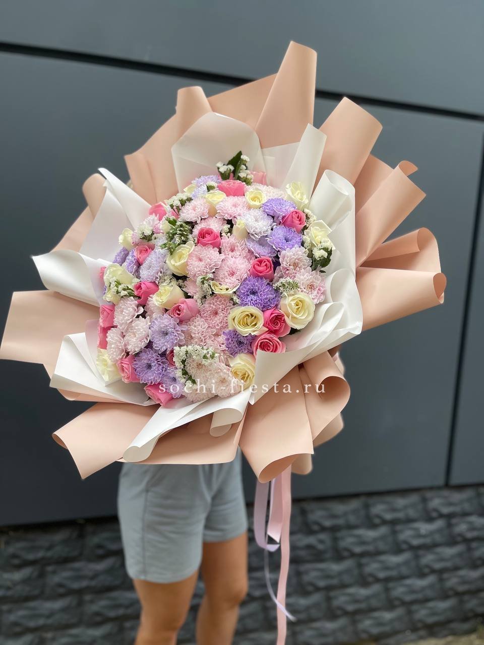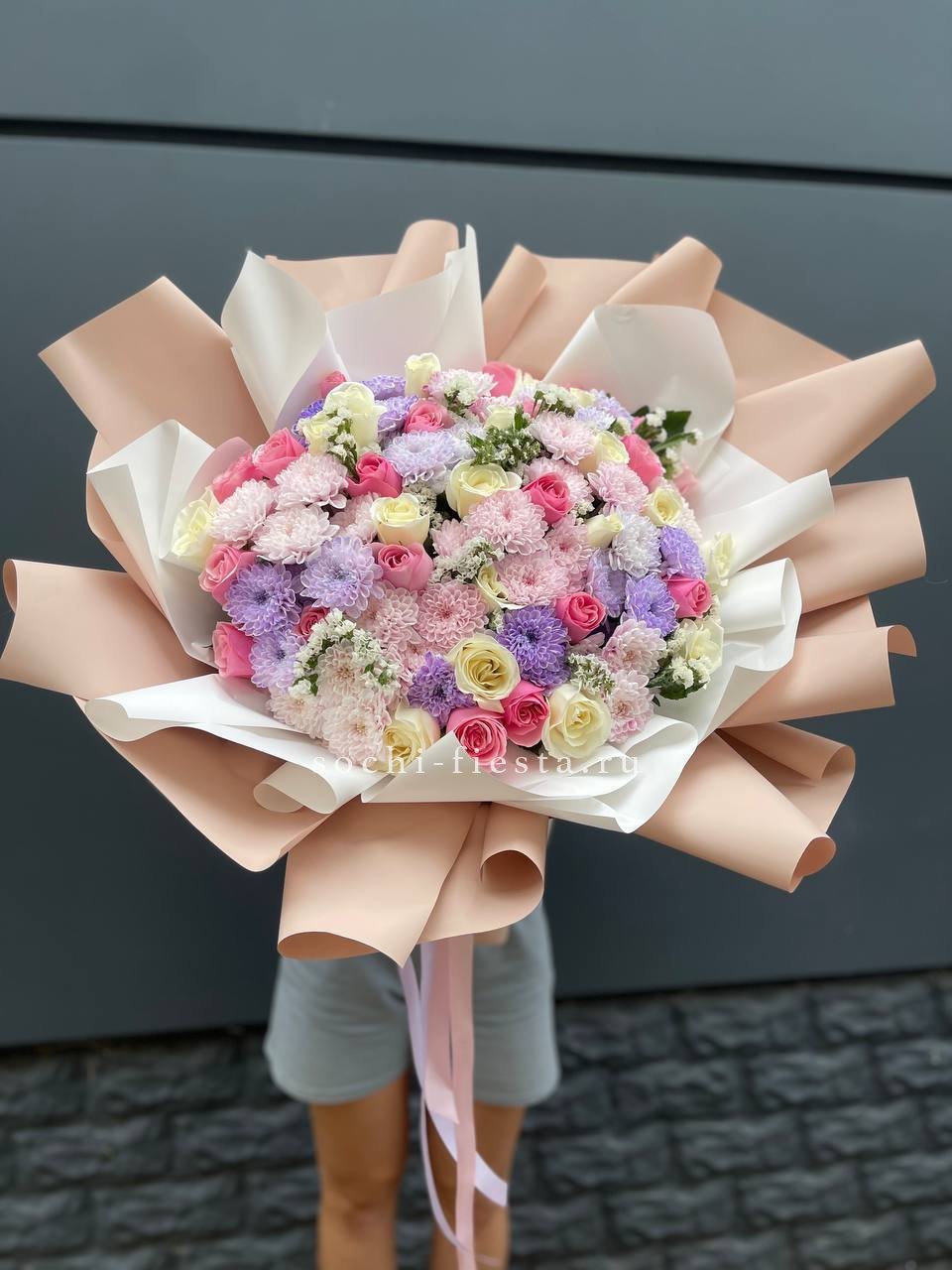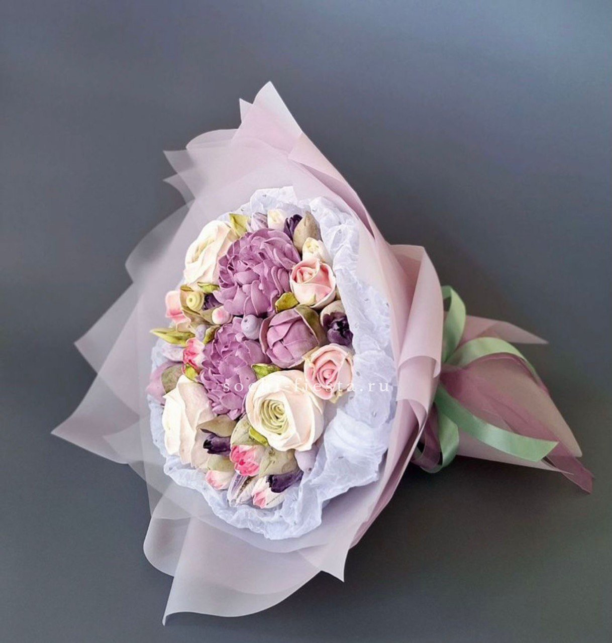 Пудровые розы и кустовые соцветия собраны с диантусами и озотамнусом в округлую форму. Шесть макаронс завершают композицию и создают ощущение домашнего уюта.