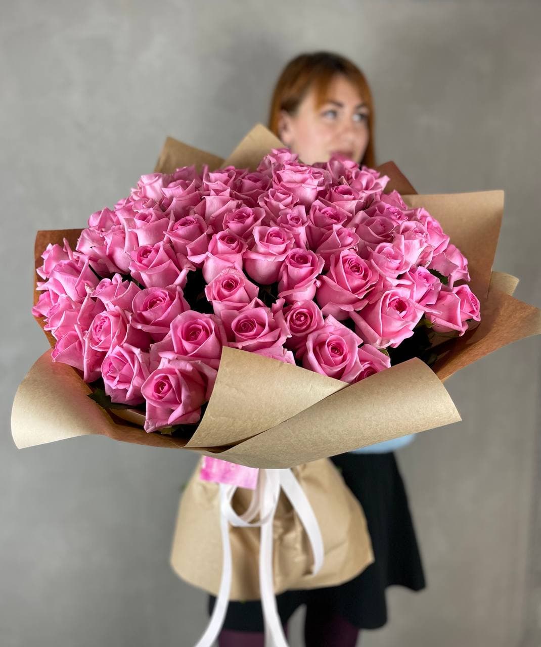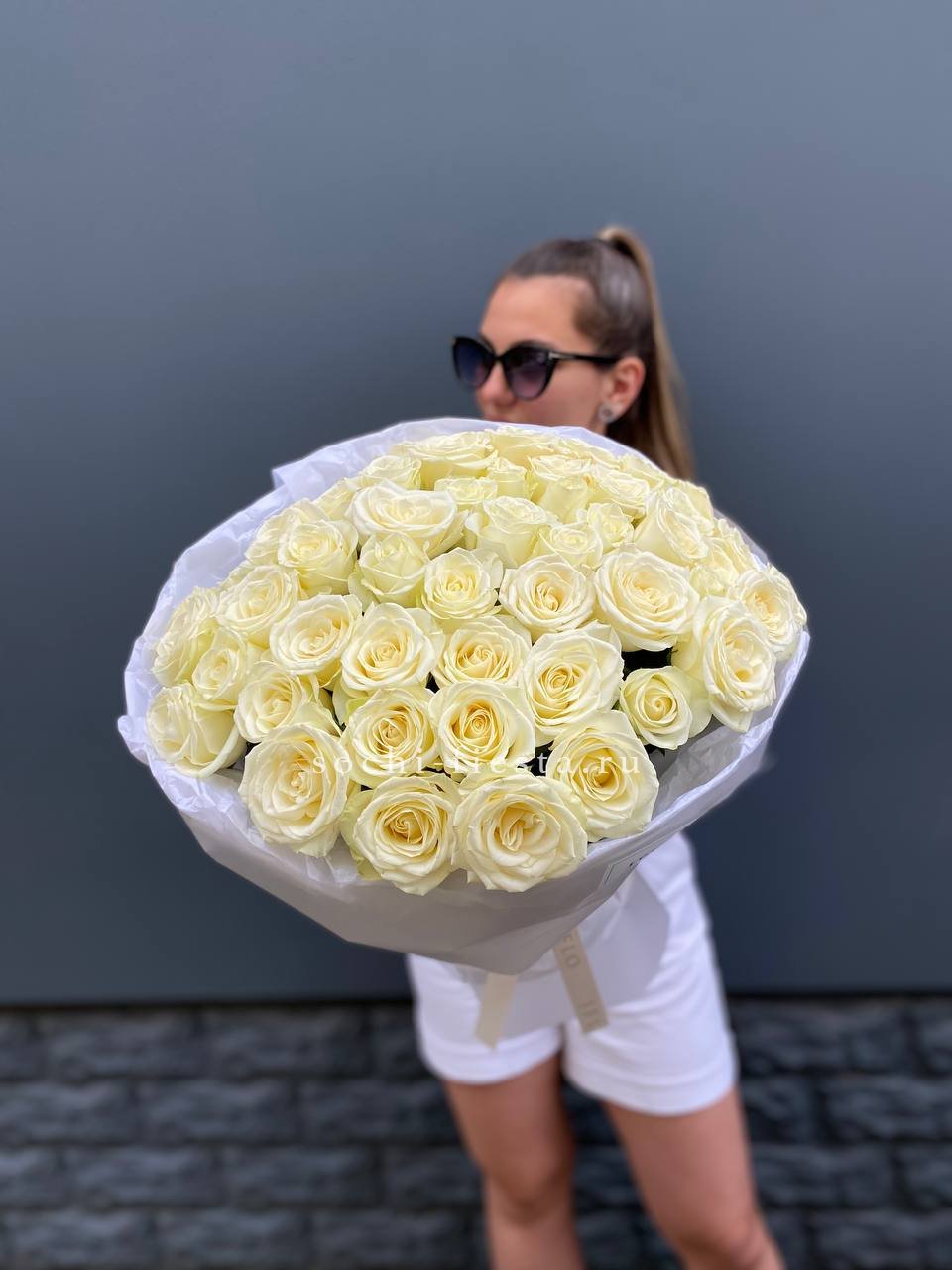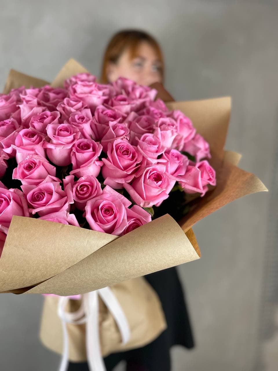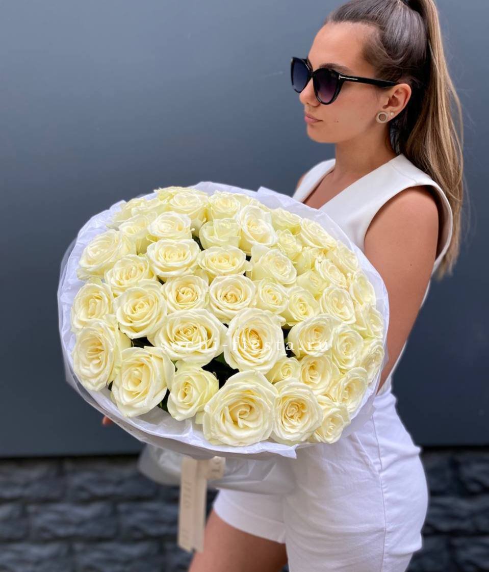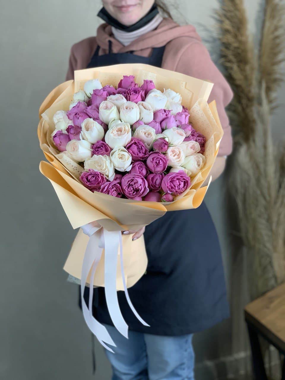 Пудровые розы и кустовые соцветия собраны с диантусами и озотамнусом в округлую форму. Шесть макаронс завершают композицию и создают ощущение домашнего уюта.
