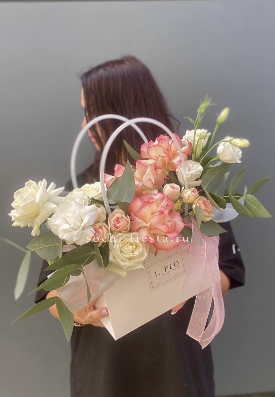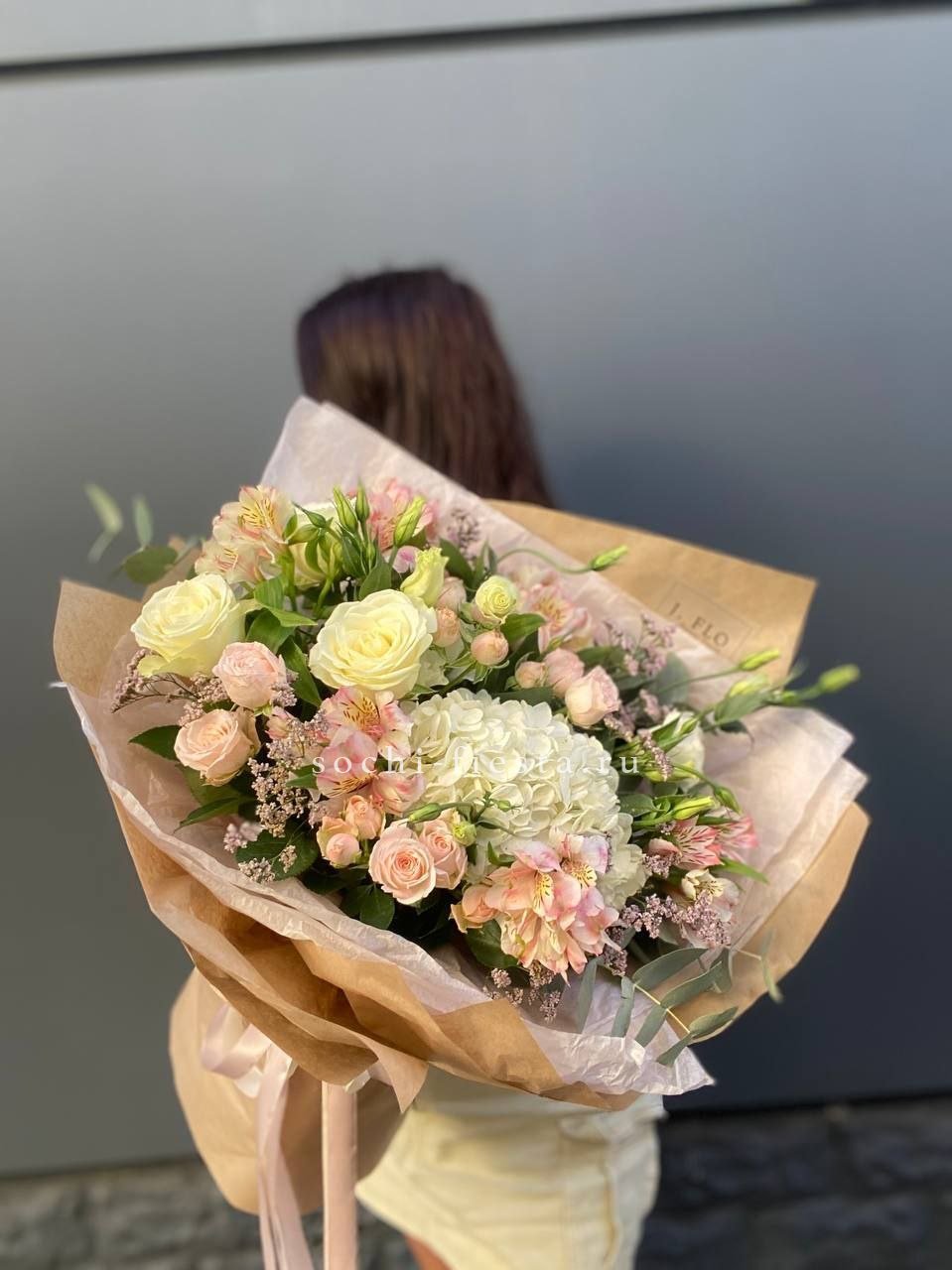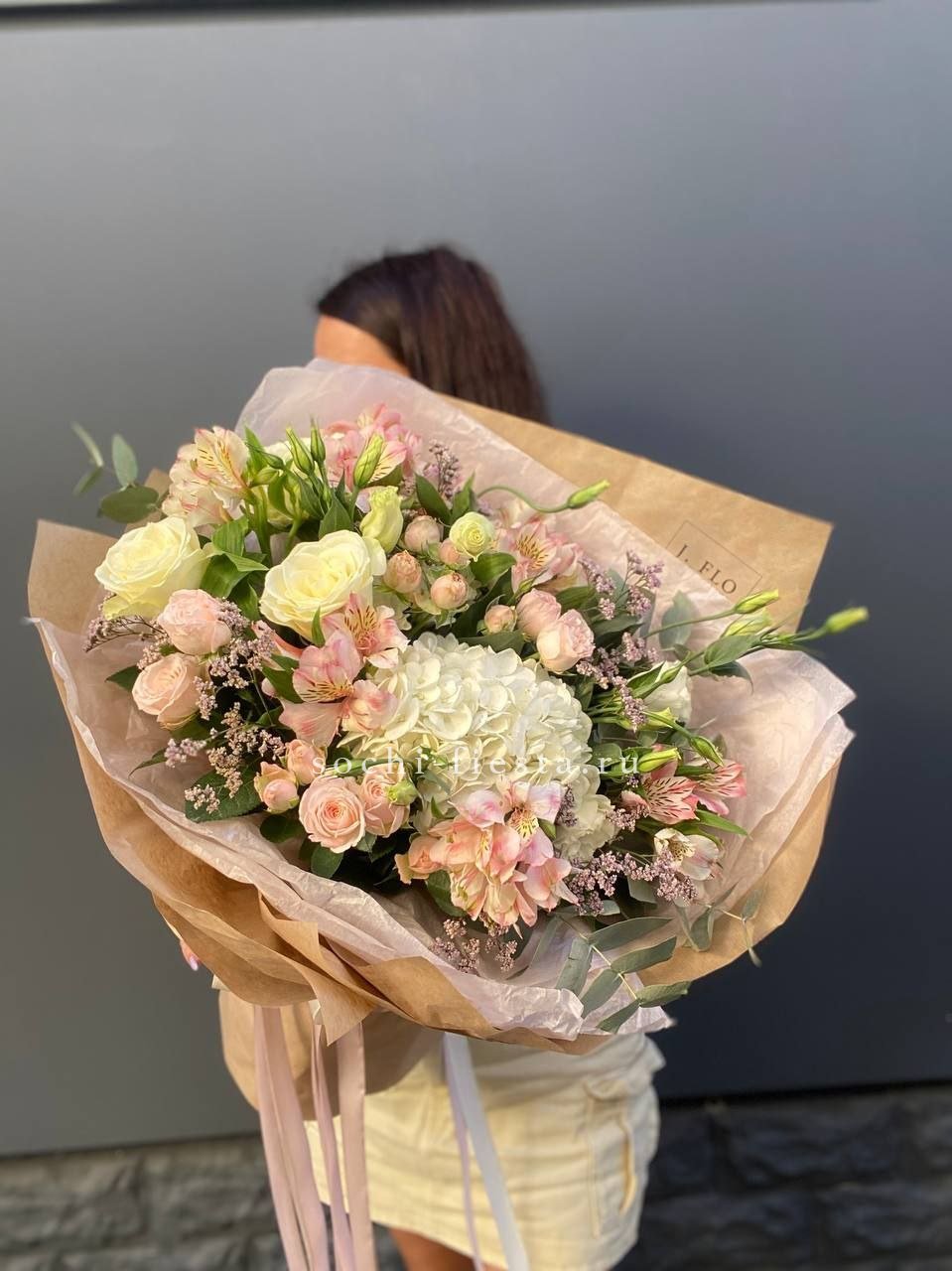 гортензия, хлопок, бомбастик, белая роза, маттиола- может меняться от сезона на диантус, ковыль, упаковка.