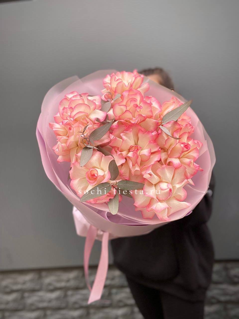 Девять вывернутых роз с насыщенными лепестками создают объёмную композицию. Эвкалипт добавляет свежести и визуальной лёгкости между бутонами.