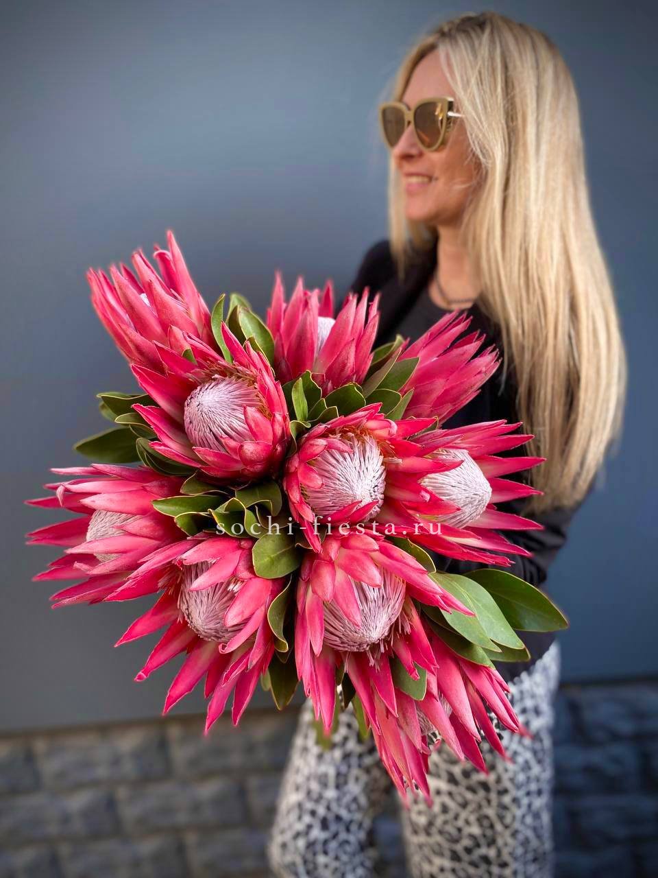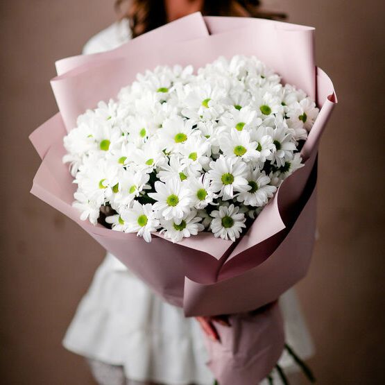 Махровые бутоны Бомбастик с множеством лепестков соседствуют с воздушной эустомой. Разная плотность цветков создаёт визуальную глубину и объём композиции.