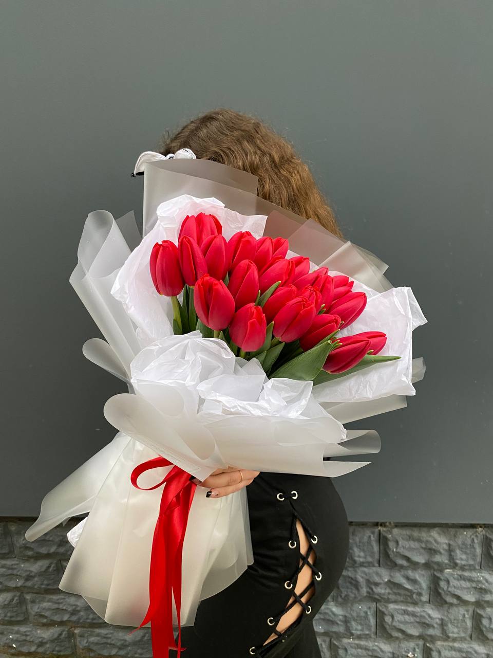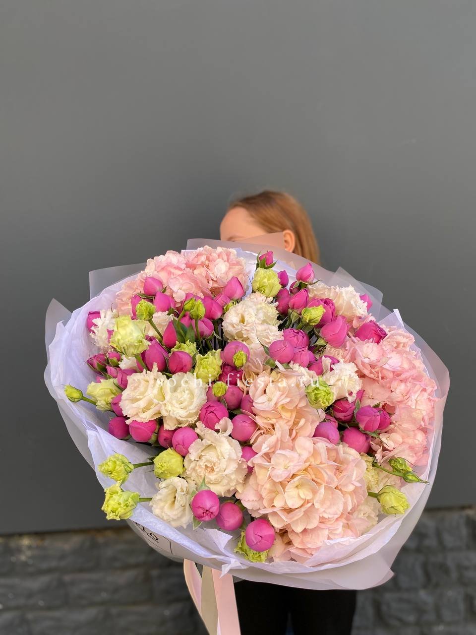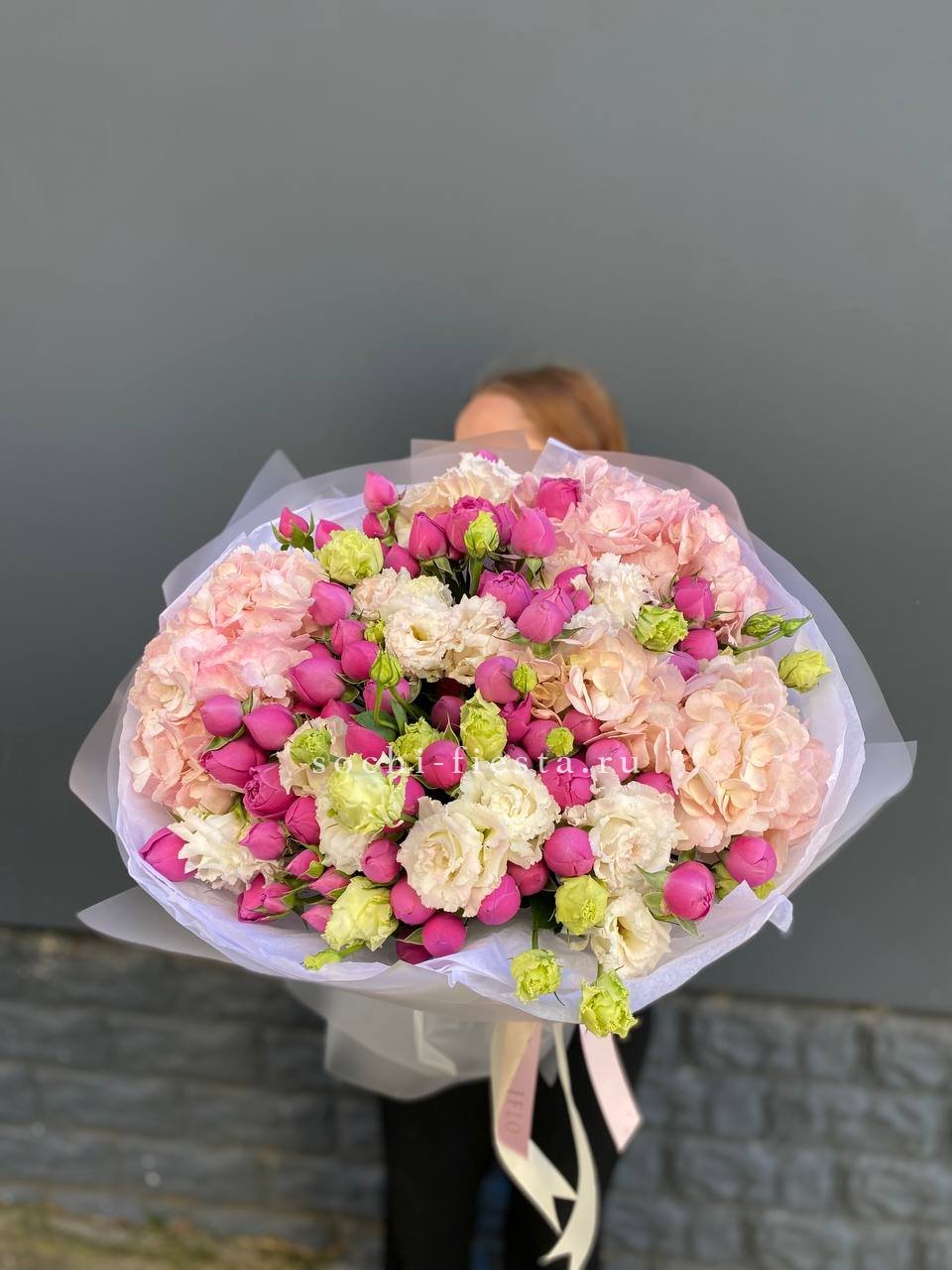 кустовые розы, эустома, хлопок, лента и дизайнерская пленка.