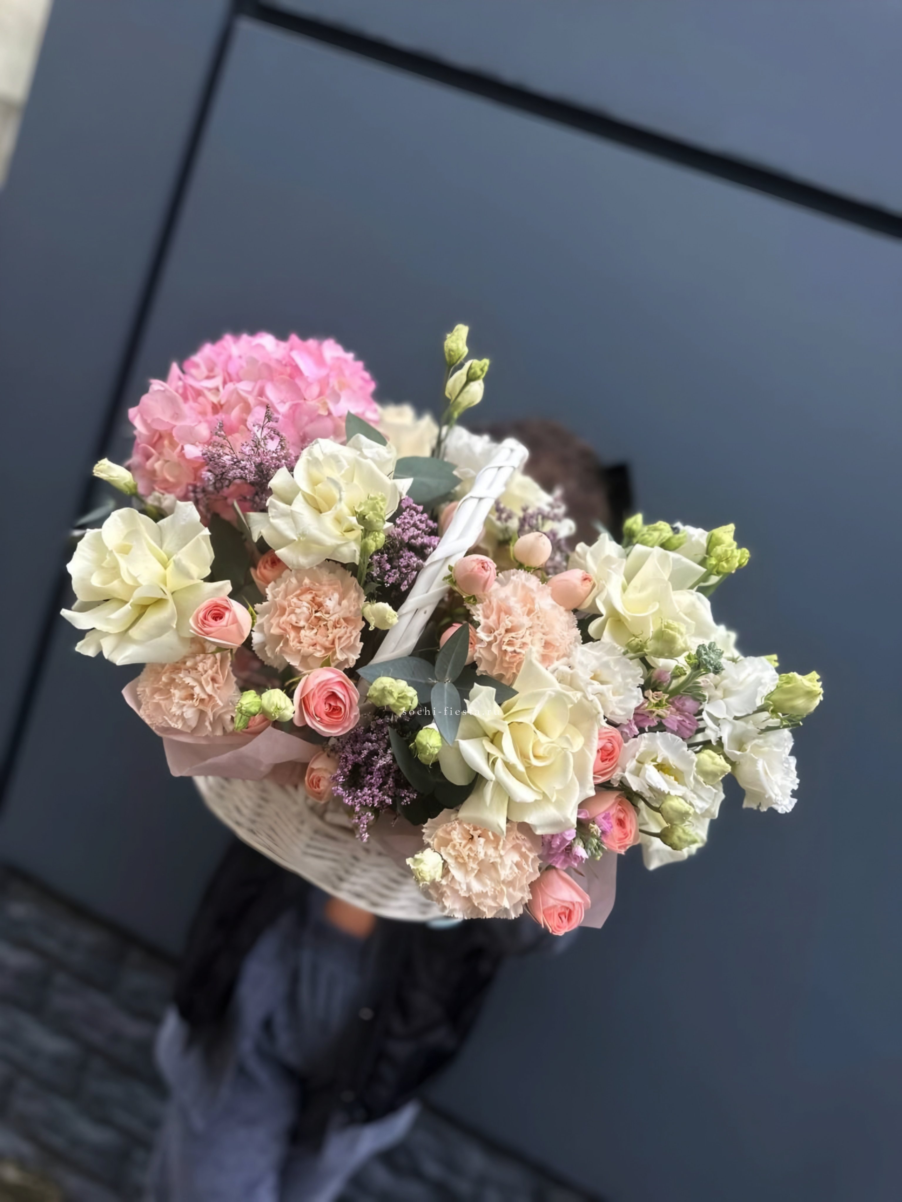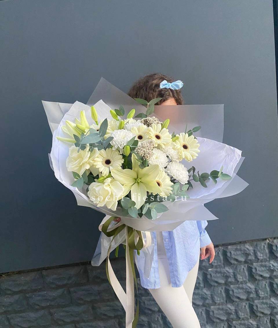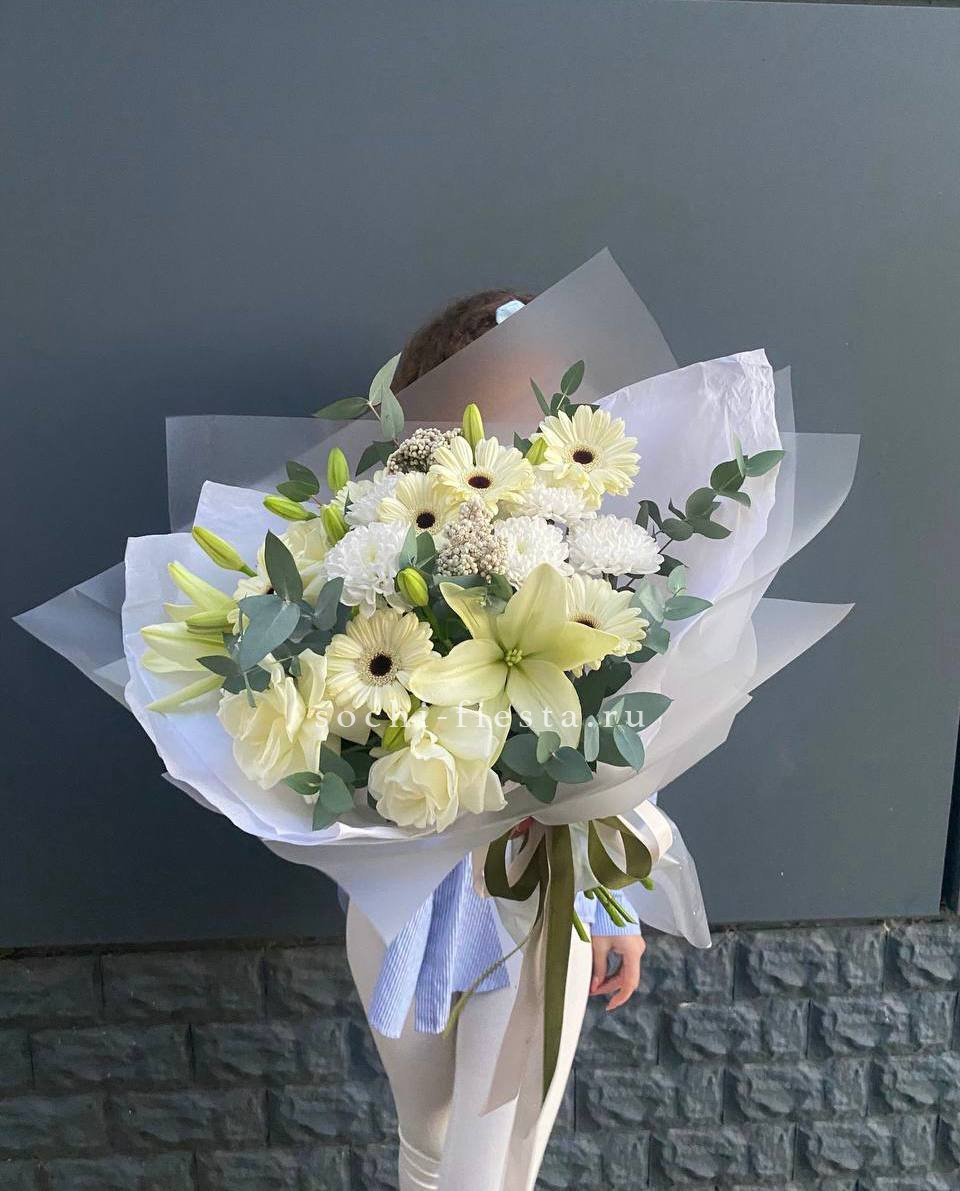 Пастельная гамма с мягкими переходами от кремового к лавандовому создаёт спокойное и цельное впечатление. Кустовые розы и эустома дополнены фактурными коробочками хлопка. Компактная форма удобна для размещения в любом интерьере.