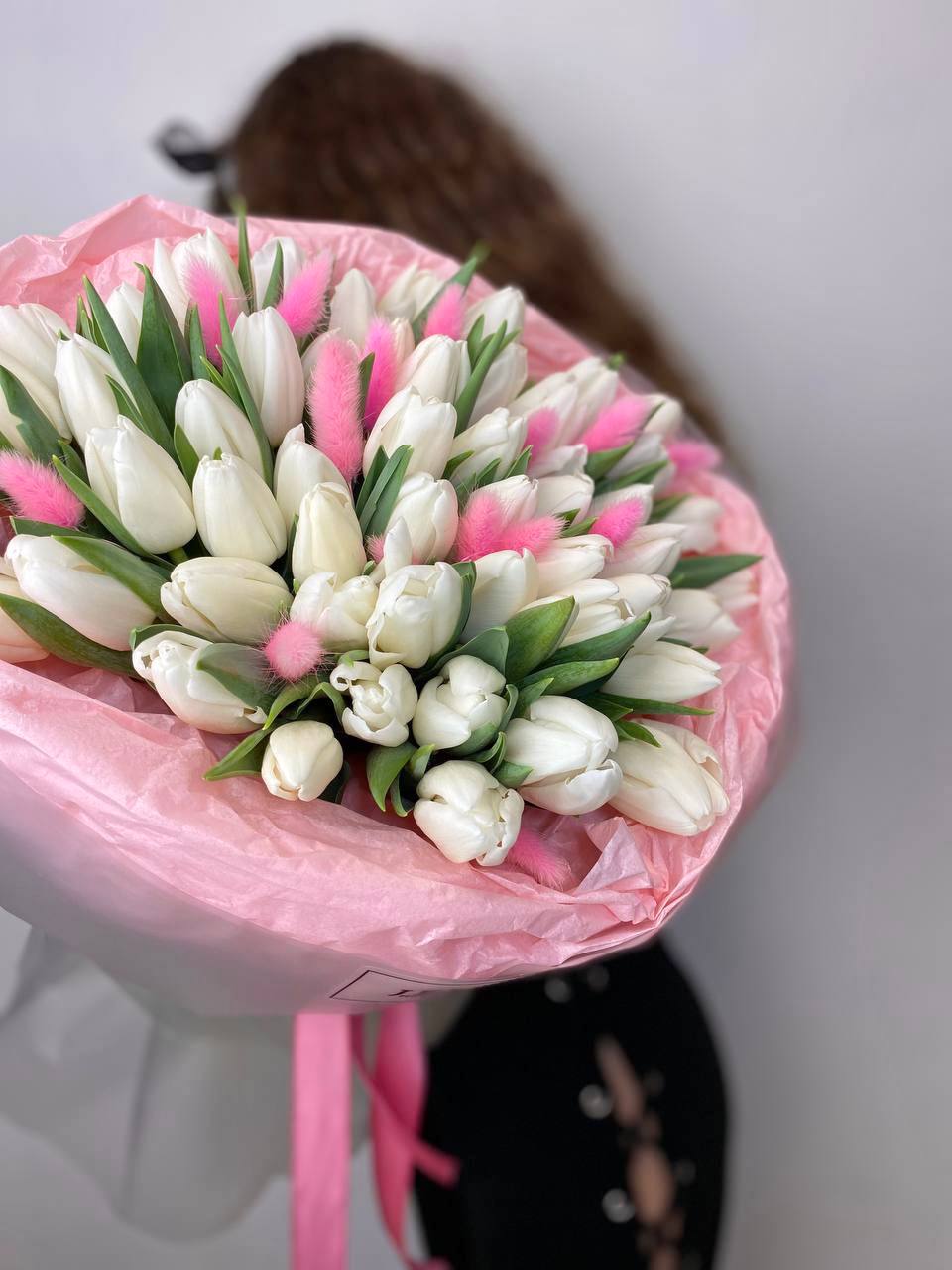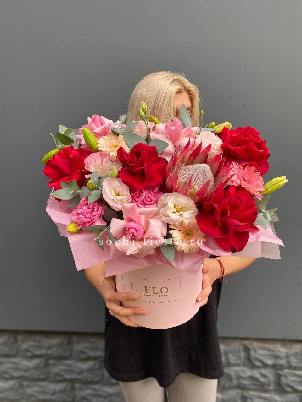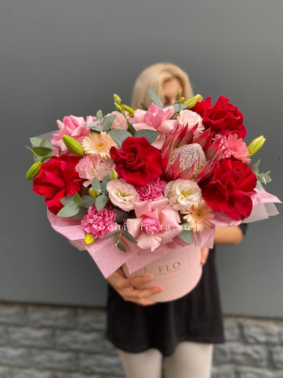 Яркие герберы и белоснежные лилии создают жизнерадостную композицию с чистым силуэтом. Озотамнус добавляет воздушности, а розы завершают образ свежестью и лёгкостью.
