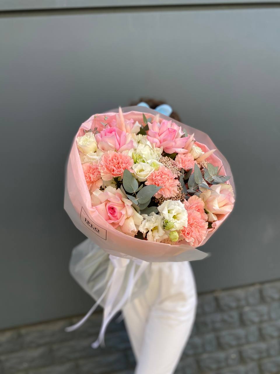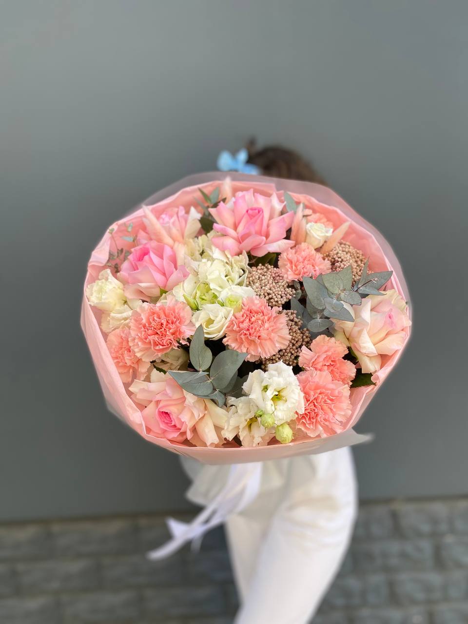 пионовидная роза, хамелациум (замена в несезон), эвкалипт, авторское оформление.