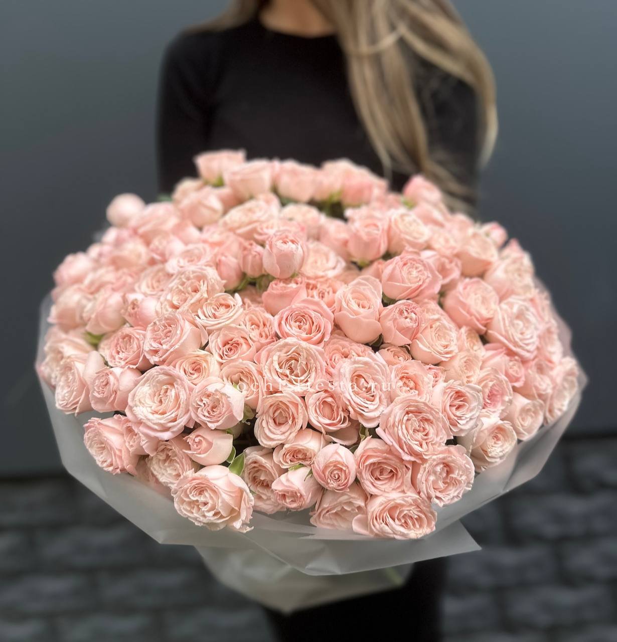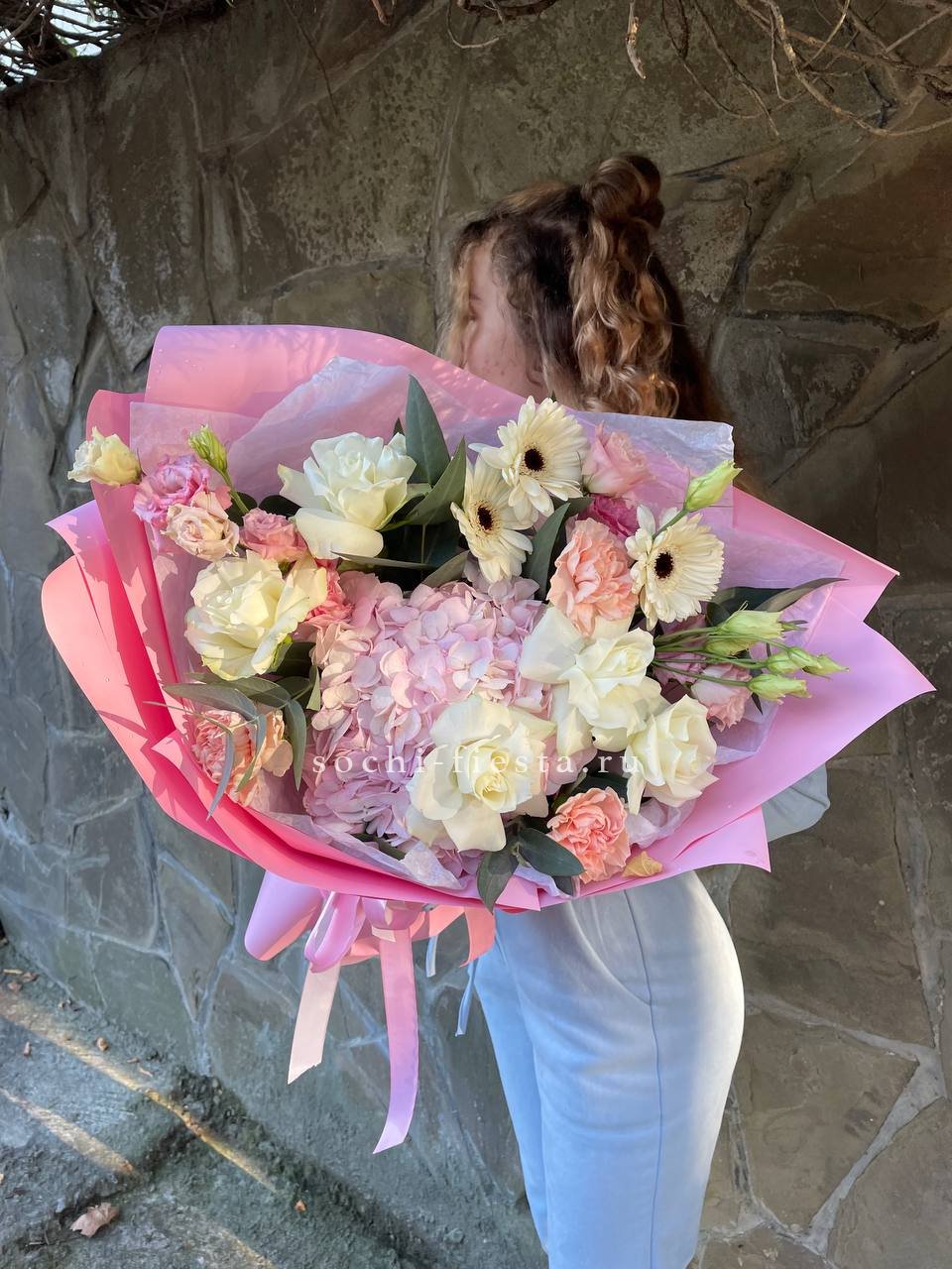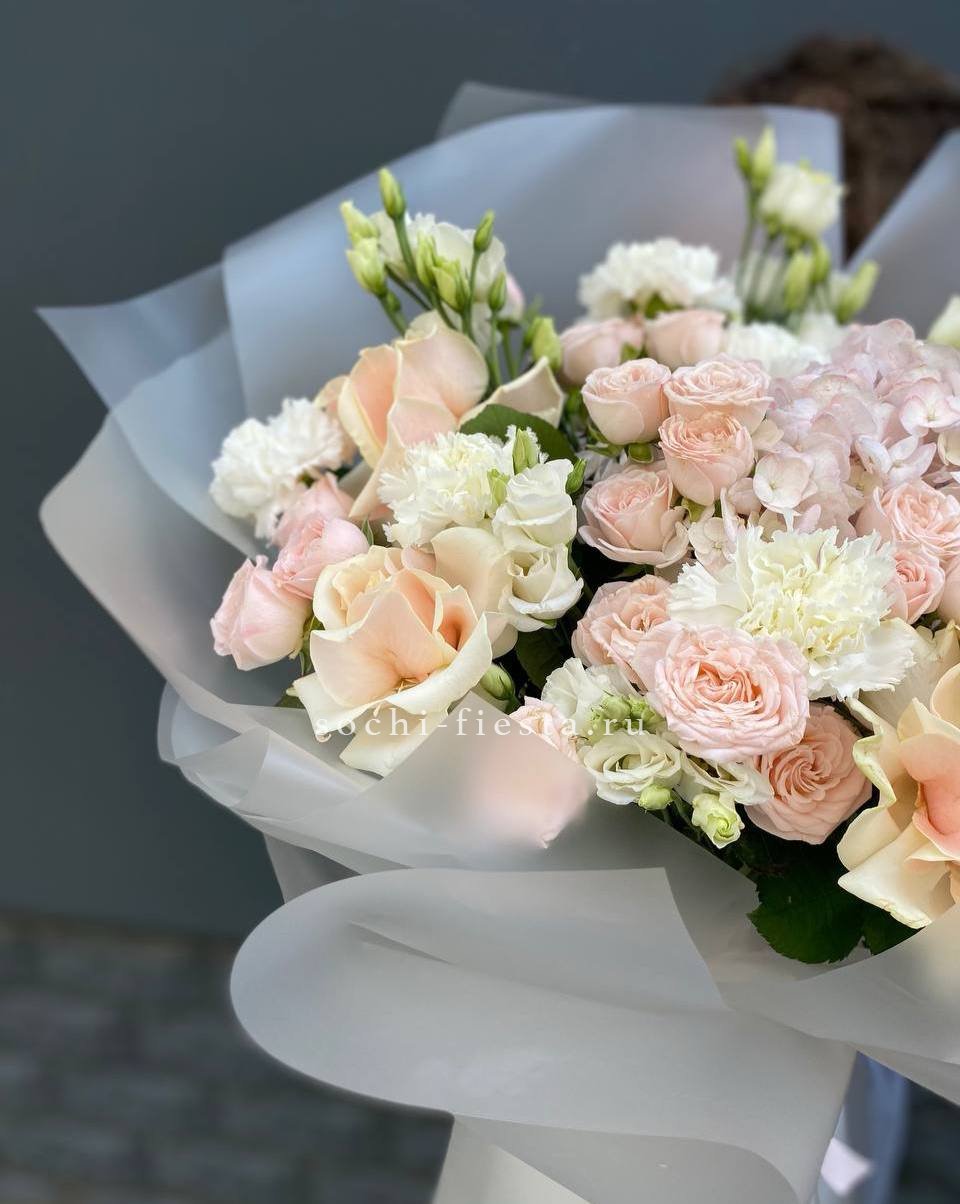 Пионовидные розы раскрываются густыми лепестками, хамелациум добавляет воздушности. Композиция держит форму и долго сохраняет свежесть.