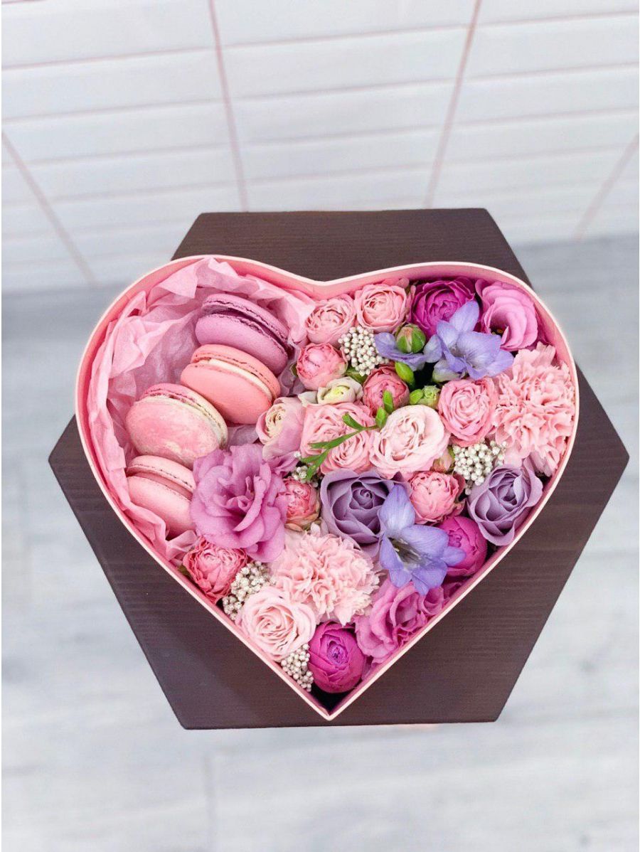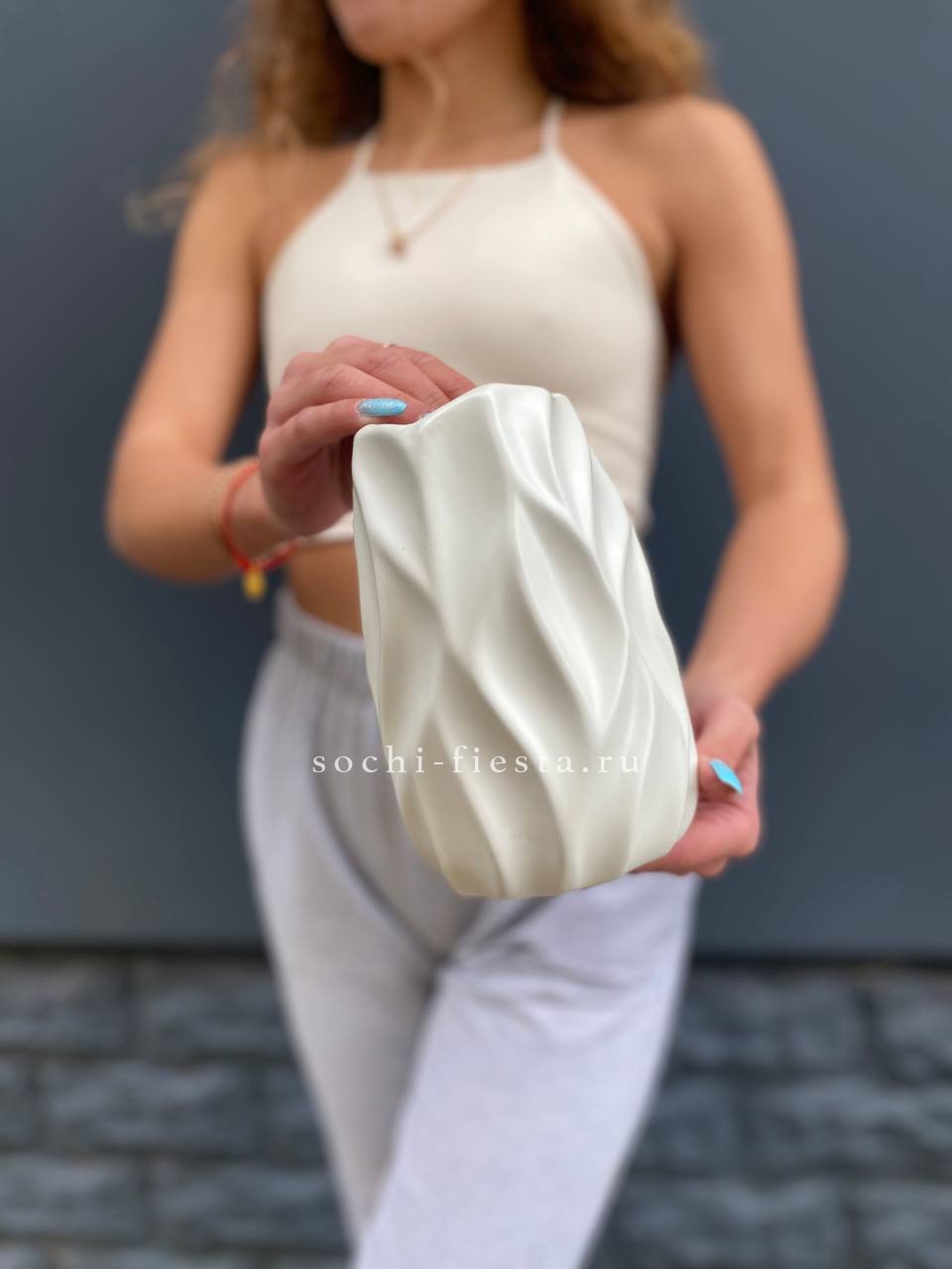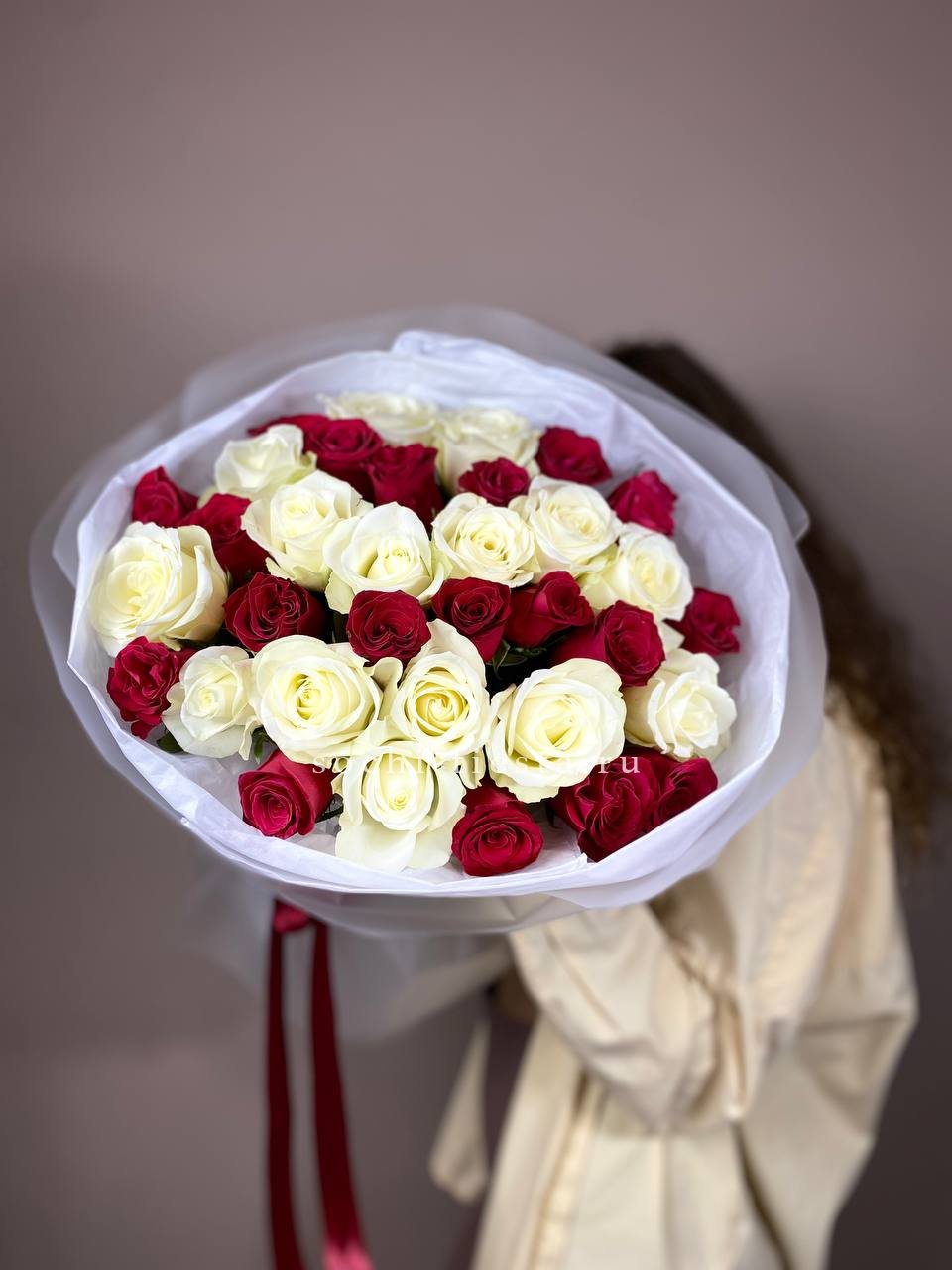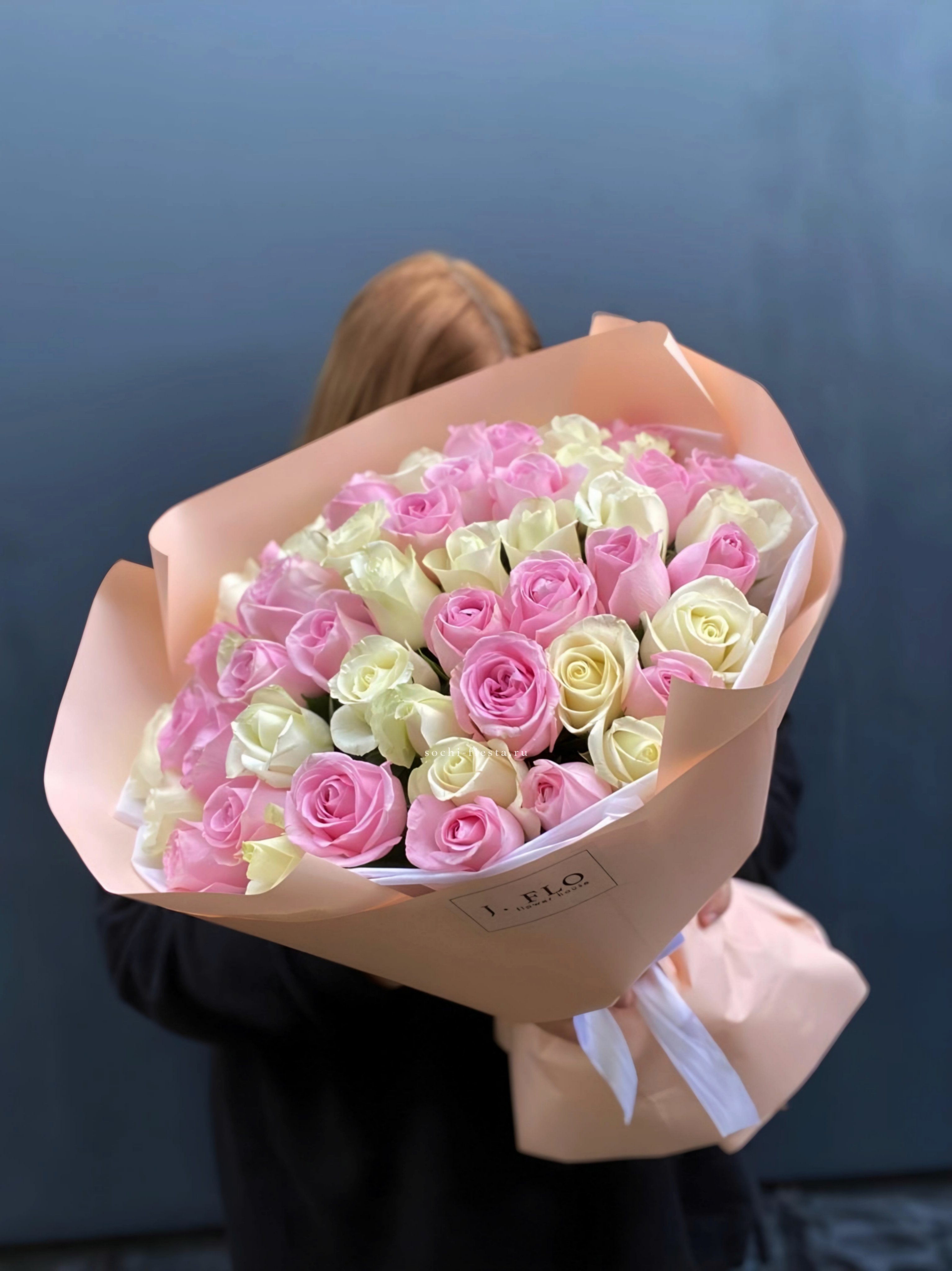 Пионовидные розы раскрываются густыми лепестками, хамелациум добавляет воздушности. Композиция держит форму и долго сохраняет свежесть.
