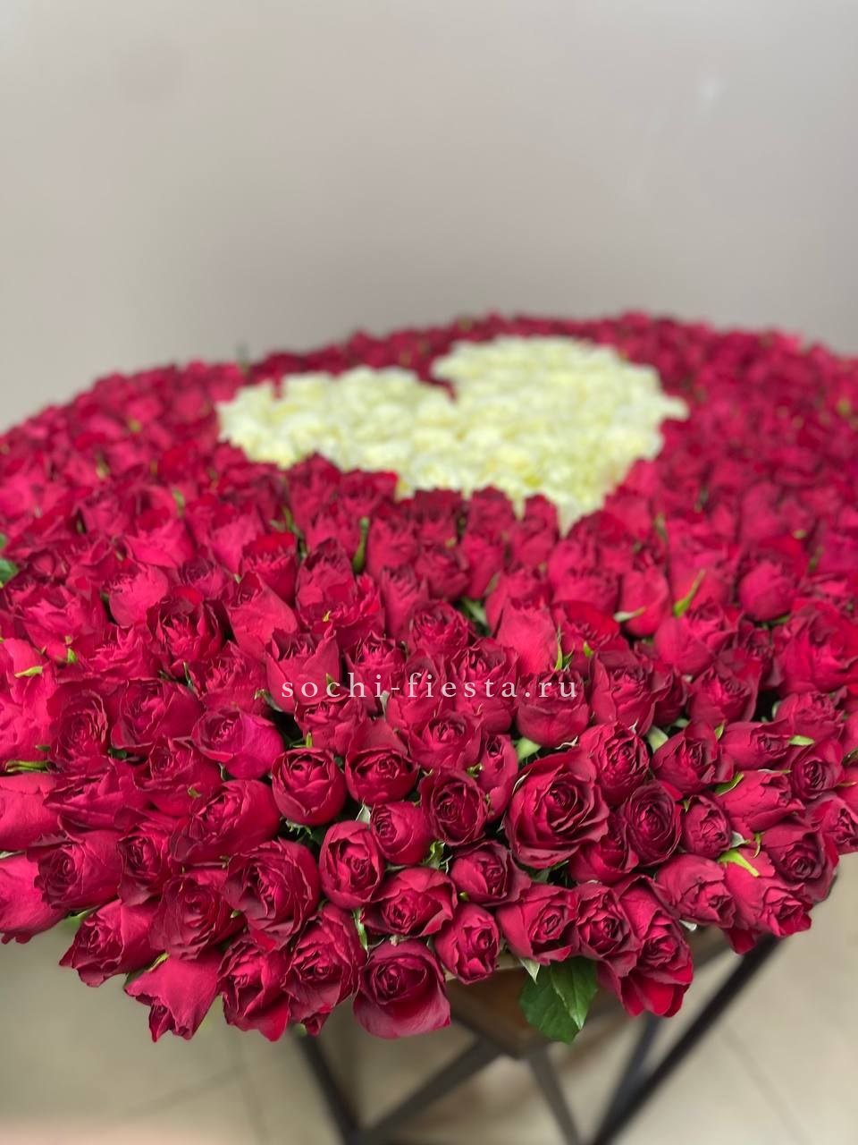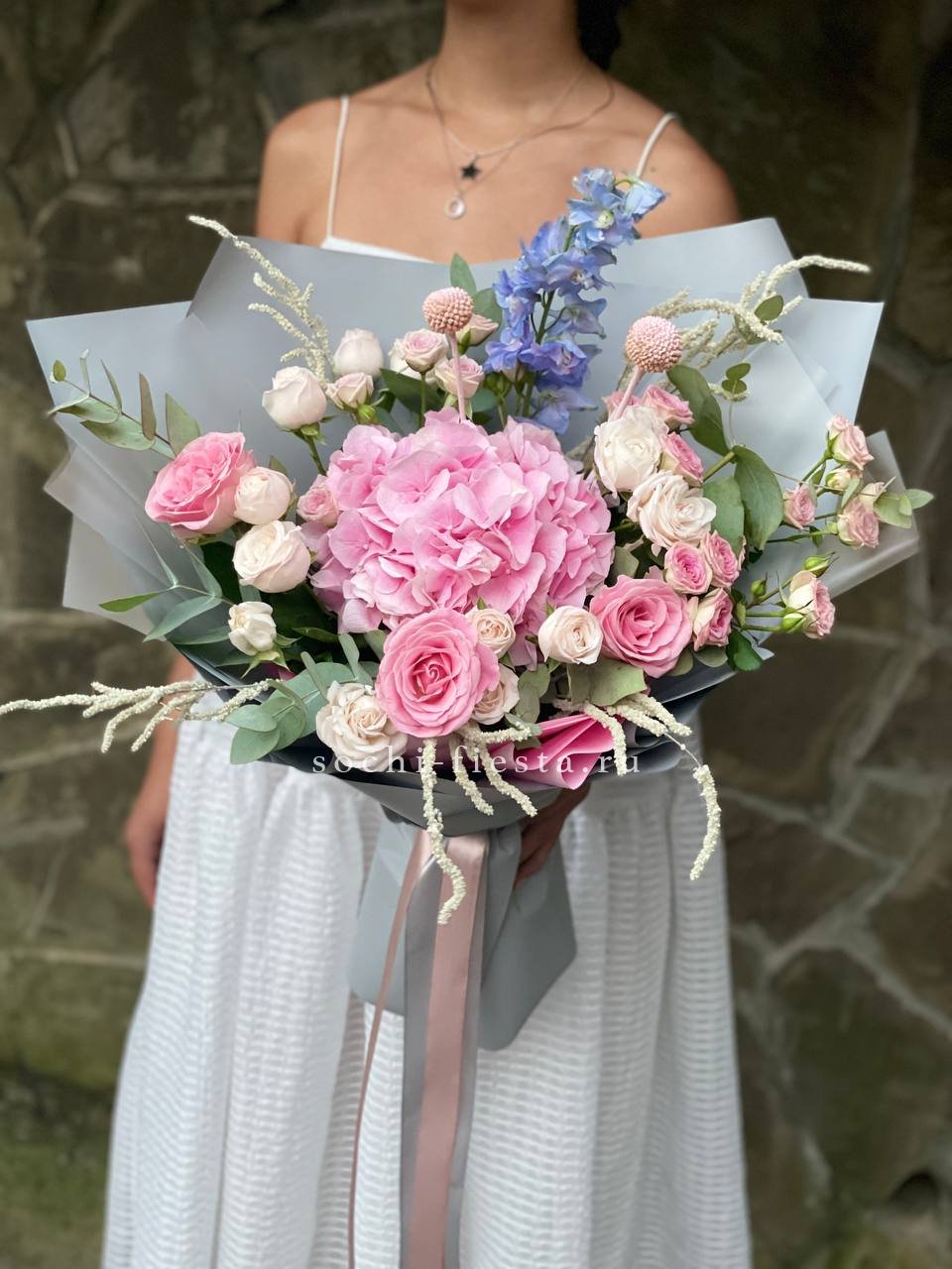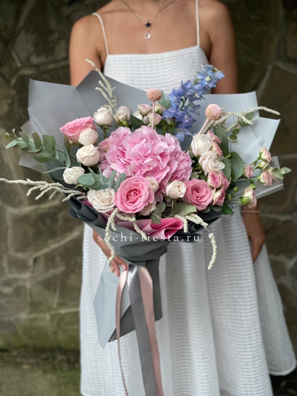белые розы, диантус, хризантема кустовая, эустома, эвкалипт, лента, авторское оформление.