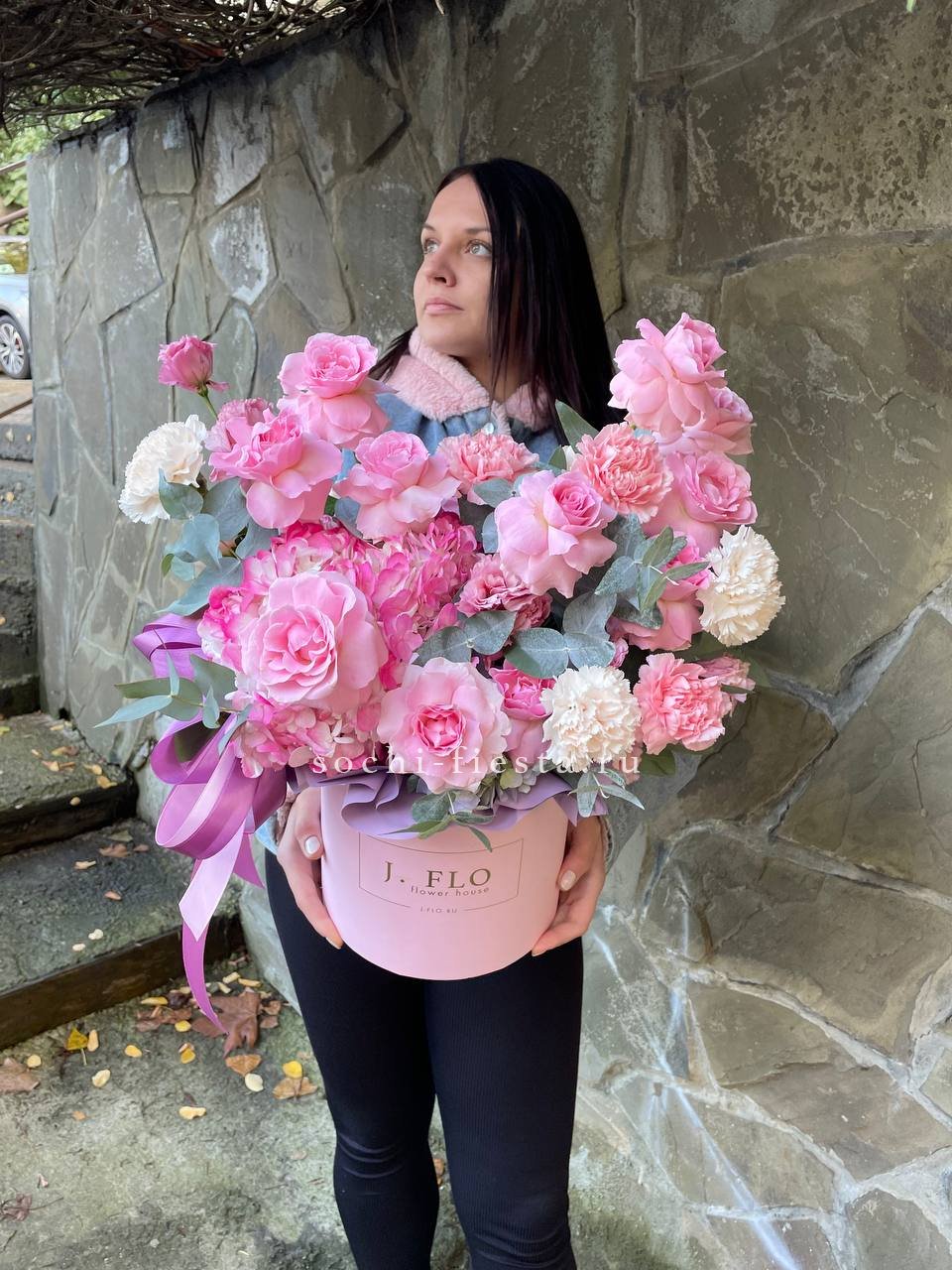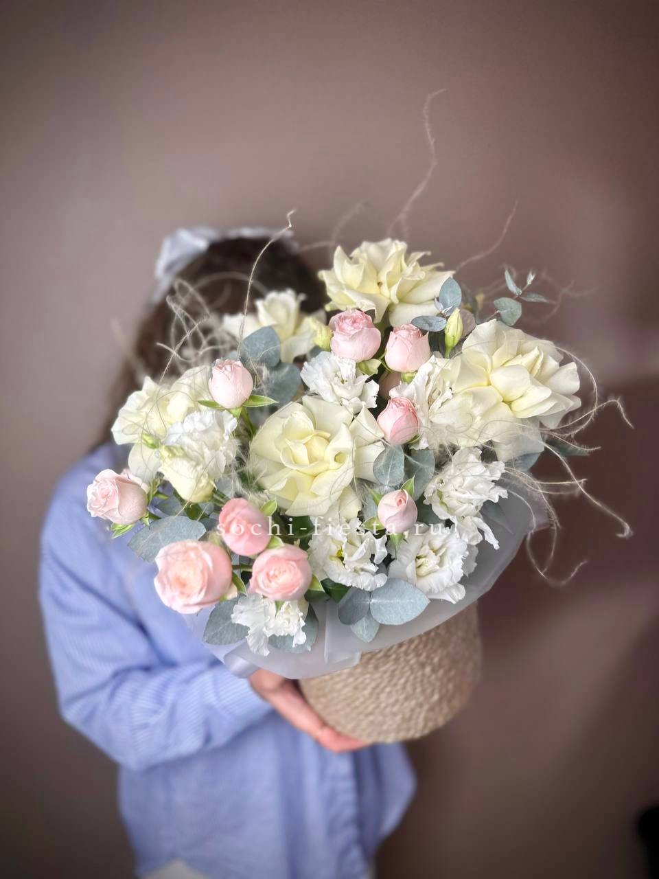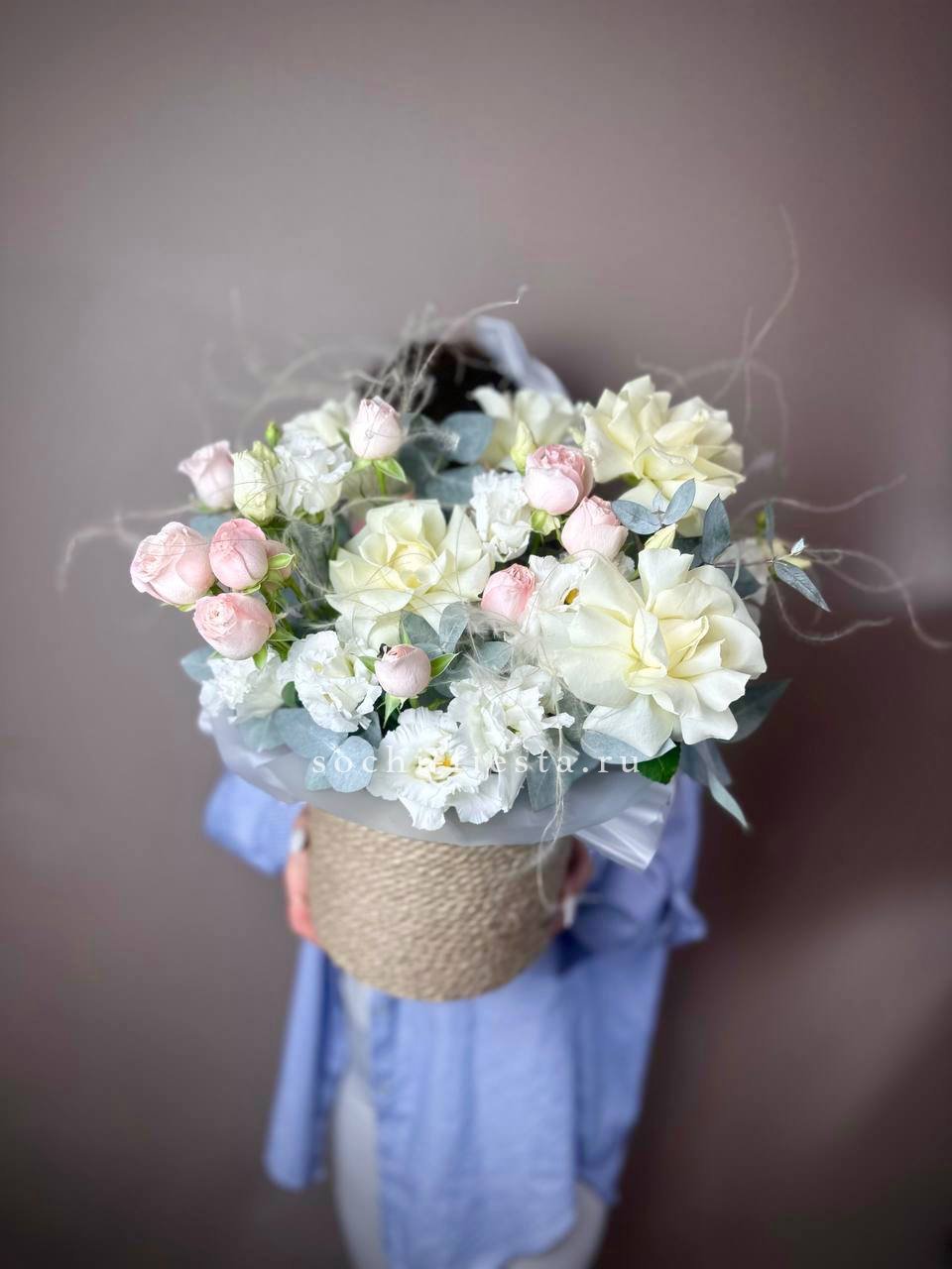 Белые розы и эустома раскрываются полными бутонами среди мелких соцветий диантуса и хризантем. Свежая зелень эвкалипта добавляет композиции глубину и завершённость.