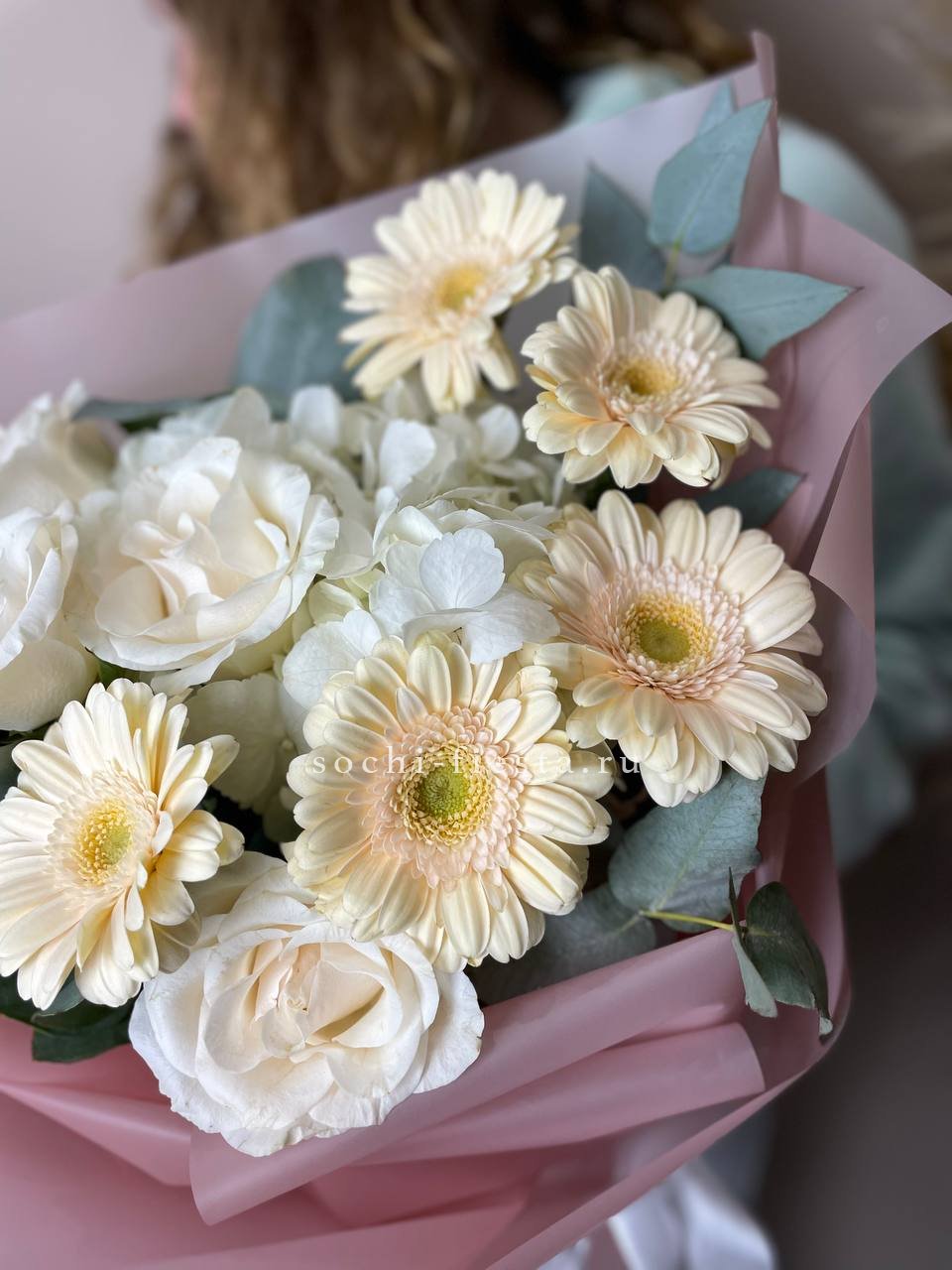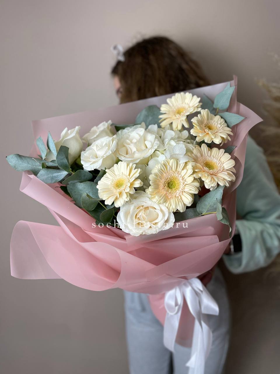 Розовые оттенки роз и эустомы переплетаются с яркой хризантемой в теплой композиции. Хлопок добавляет текстурной мягкости, а озотамус создает ажурную основу. Букет дарит радостное настроение и естественную красоту.