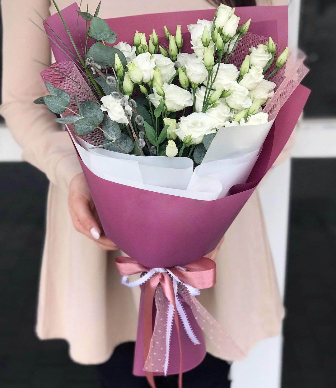 Пять веточек эустомы дополнены эвкалиптом и собраны в компактную композицию. Серебристая зелень добавляет глубину и свежесть между пышными бутонами. Лаконичный букет с продуманной структурой.