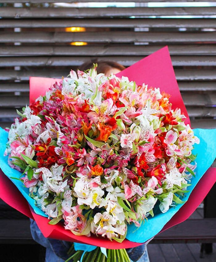 Сотня веток альстромерий создает объемную композицию с яркой фактурой. Каждая ветка раскрывается своим ритмом, наполняя пространство цветом и движением.
