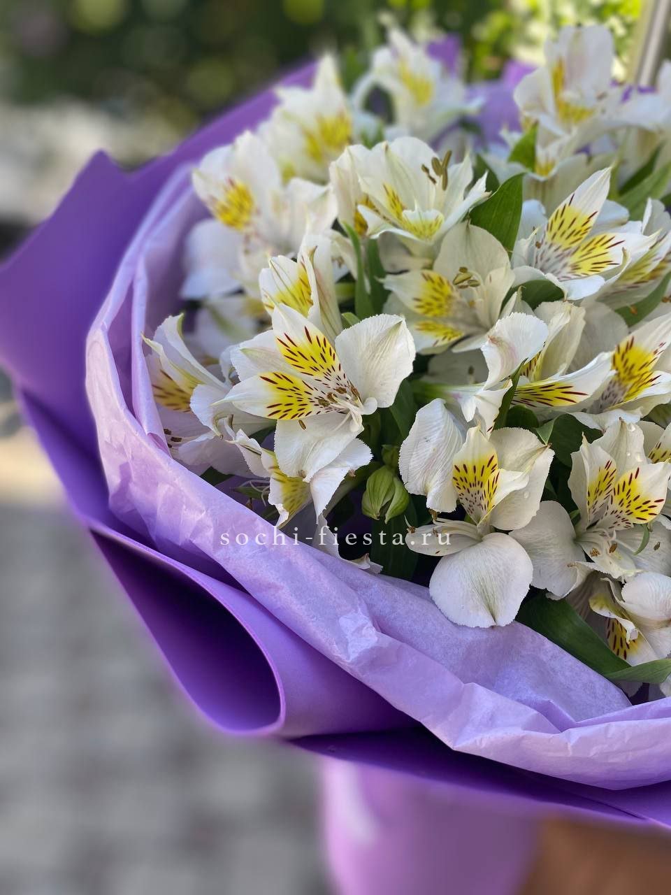 Альстромерия в дизайнерской упаковке раскрывается слоями, меняя оттенки от бутона к бутону. Лепестки с графичными штрихами добавляют глубину и рисунок всей композиции.