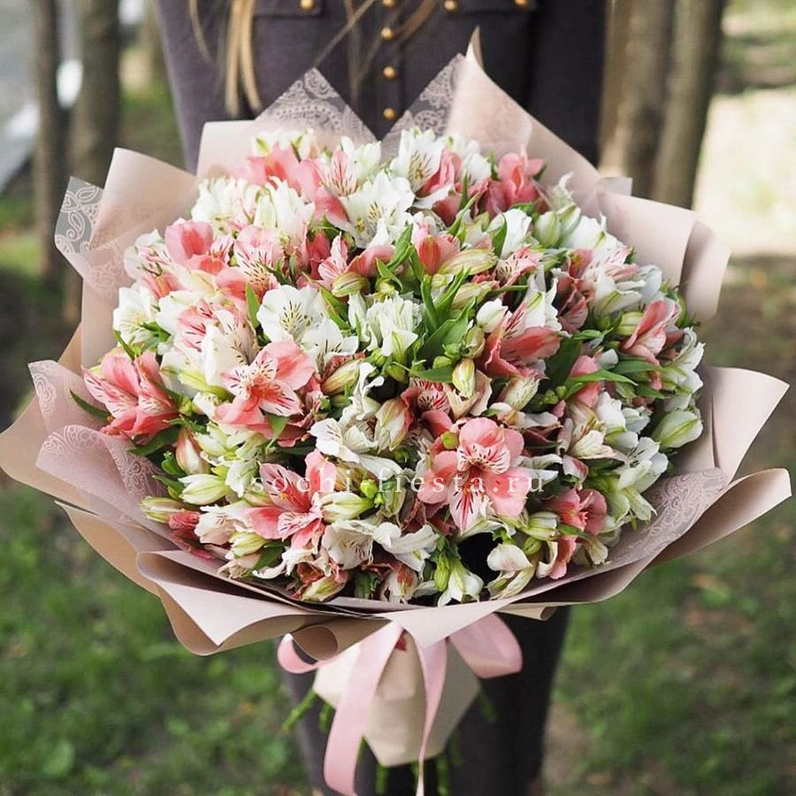 Монобукет из 51 альстромерии создаёт плотный силуэт с чёткими линиями и упругой структурой. Ветки собраны так, что композиция держит форму и выглядит графично в любом пространстве.