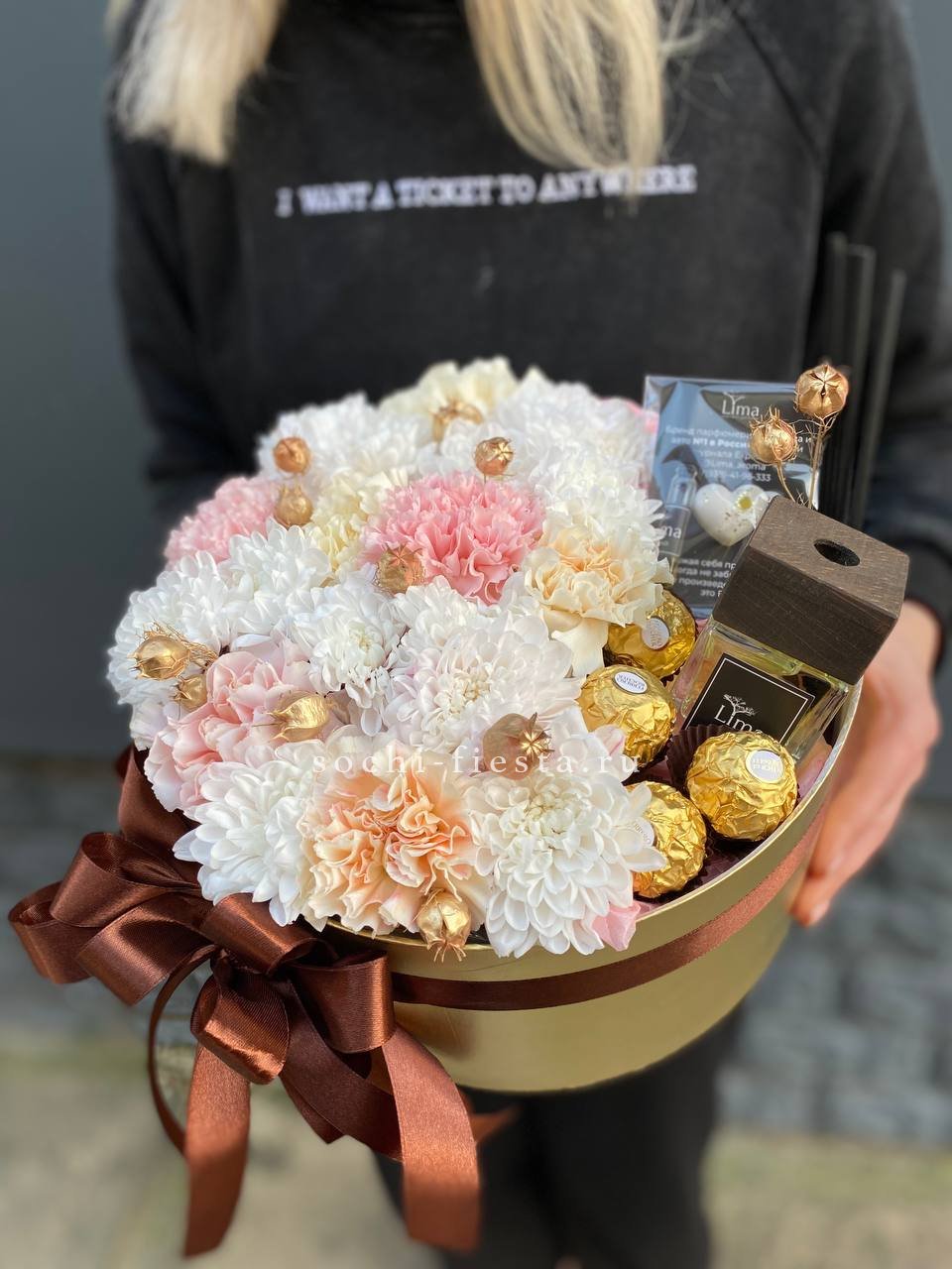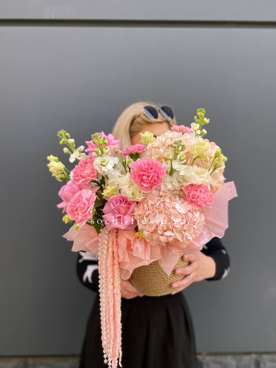 Пятнадцать соцветий гортензии образуют густую сферу с насыщенной глубиной цвета. Объёмная композиция заполняет пространство и притягивает внимание своей плотностью.