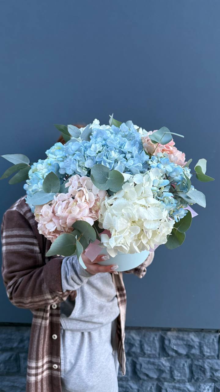 Три шапки белоснежной гортензии собраны в лаконичную композицию. Плотные соцветия создают графичный силуэт, который легко впишется в любое пространство.