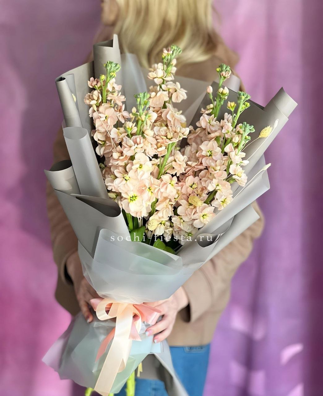 Семь веток маттиолы в пастельной гамме дают тот самый весенний аромат, который невозможно забыть. Соцветия плотные, с бархатистой текстурой, а упаковка оставляет их главными героями композиции.