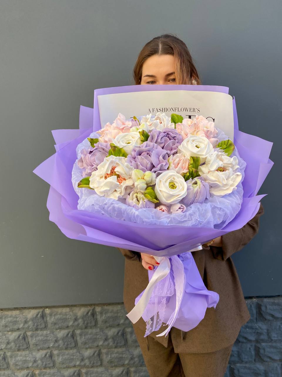 Одиннадцать тюльпанов в дизайнерском оформлении подойдут для весеннего жеста внимания. Цвет бутонов можно выбрать по вашему желанию.