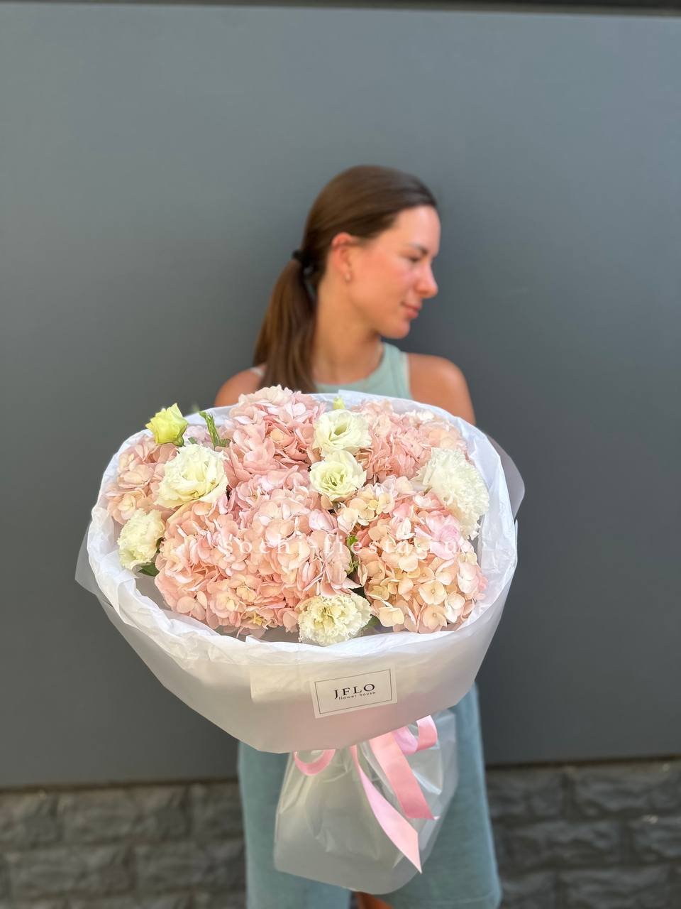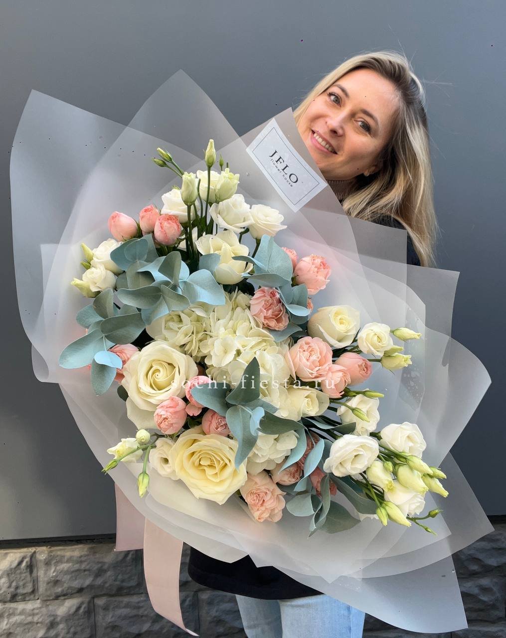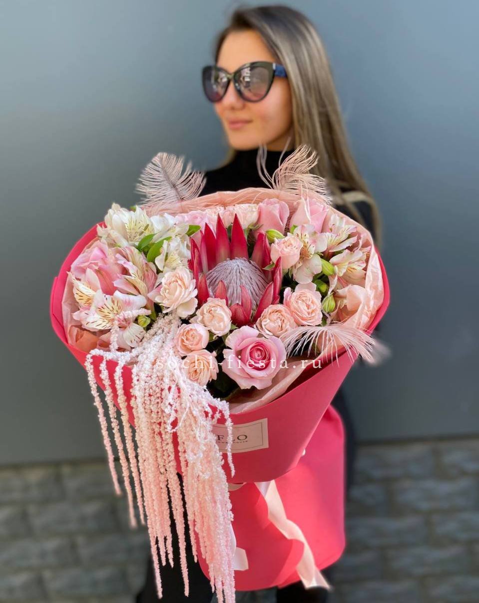 Голубые хризантемы встречаются с розовыми розами и герберами в свободной композиции. Лимониум добавляет воздушности, а декоративная бабочка завершает образ.