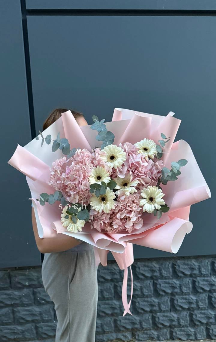 Воздушное облако из девятнадцати шаров создает мягкую цветовую волну от пудрового до молочного. Композиция легко вписывается в пространство и держит форму несколько дней подряд.