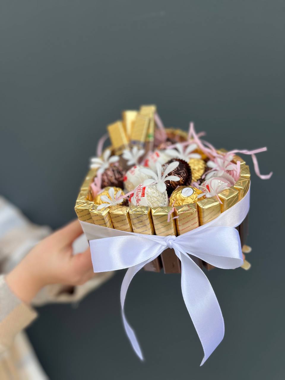 В коробке-сердце собраны конфеты Merci, Ferrero Rocher и Raffaello с декоративными цветами. Сочетание разных текстур шоколада и фундука создает многослойное впечатление от подарка.