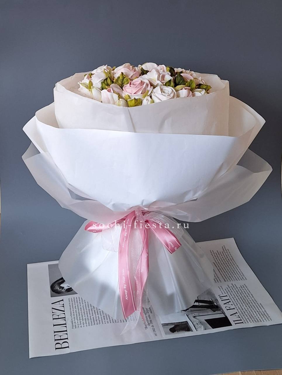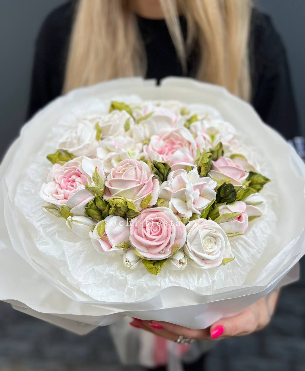 Воздушные лепестки из зефира собраны в объемную композицию. Натуральные оттенки и мягкая текстура делают этот букет необычным дополнением к celebration.