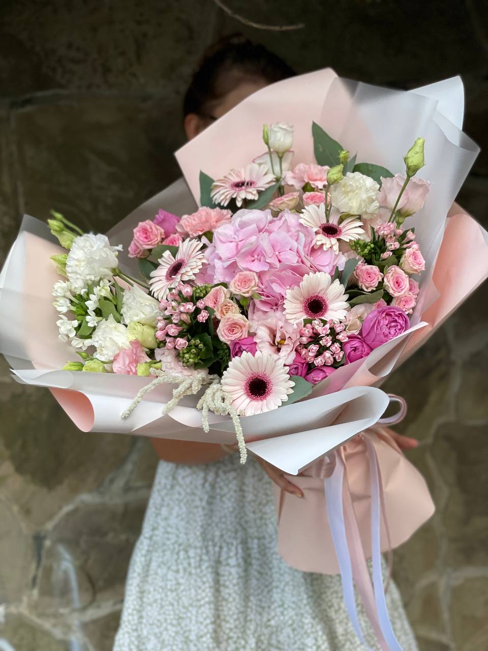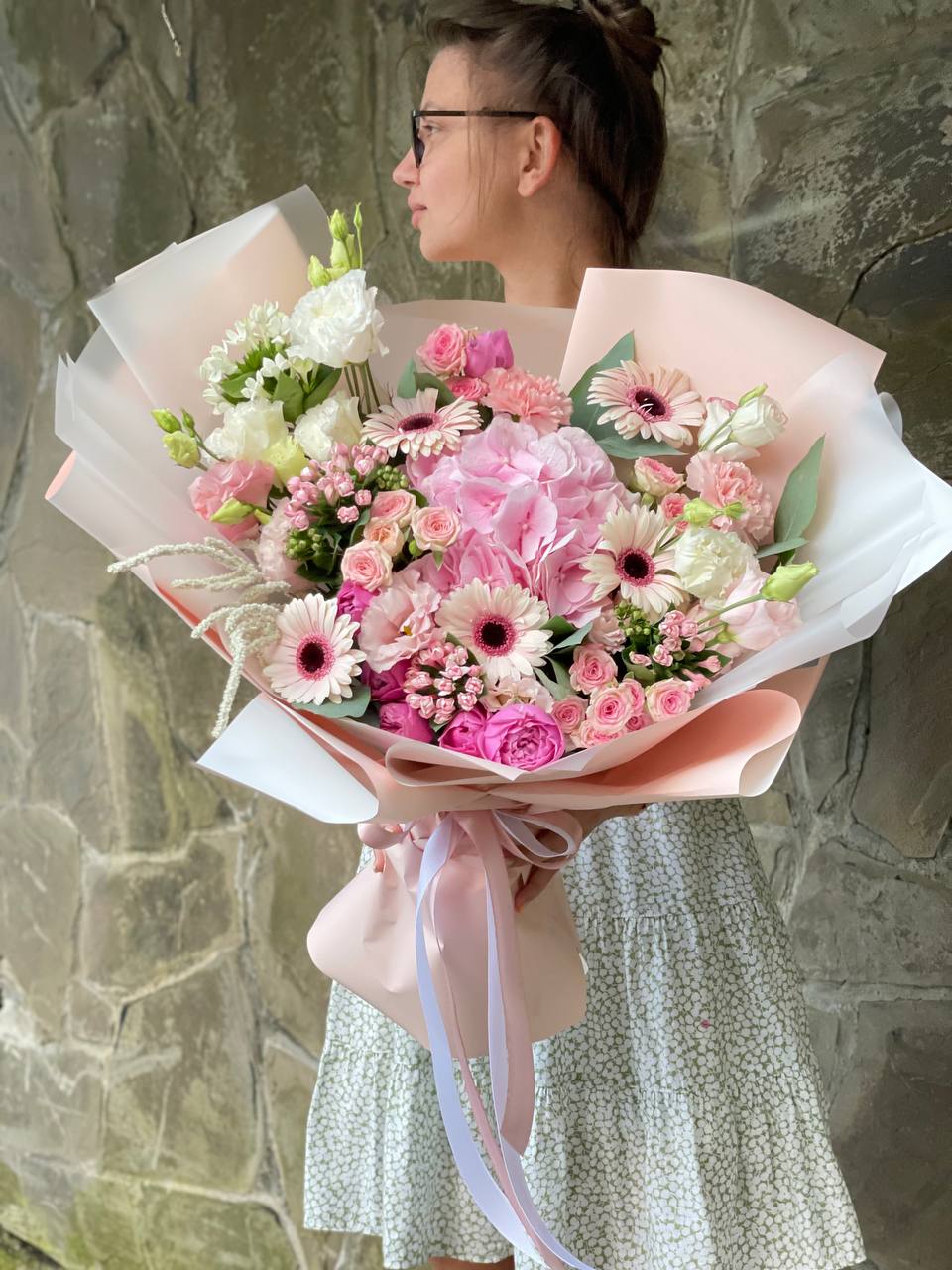 Пионовидные бутоны мисти баблс раскрываются мягкими волнами, создавая объёмную текстуру рядом с классическими белыми розами. Букет построен на игре плотности: пышные головки чередуются с точёными силуэтами, собирая взгляд к центру композиции.