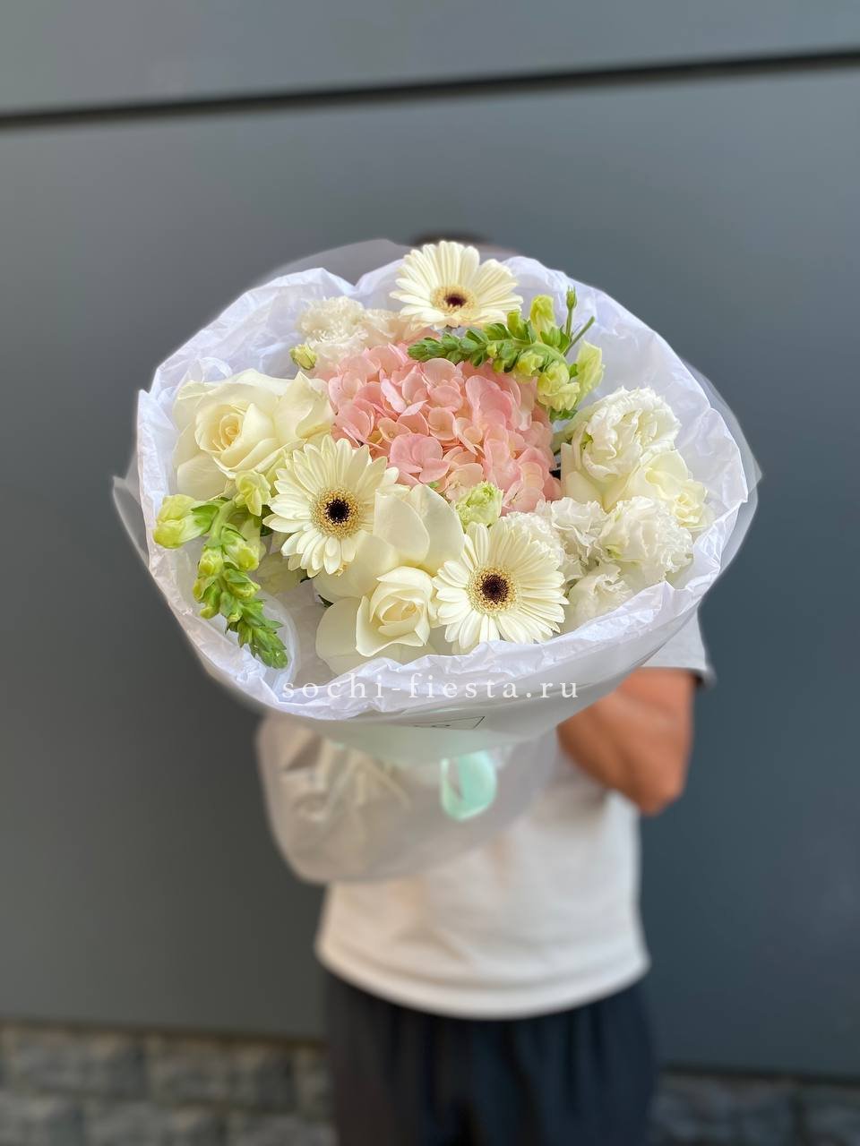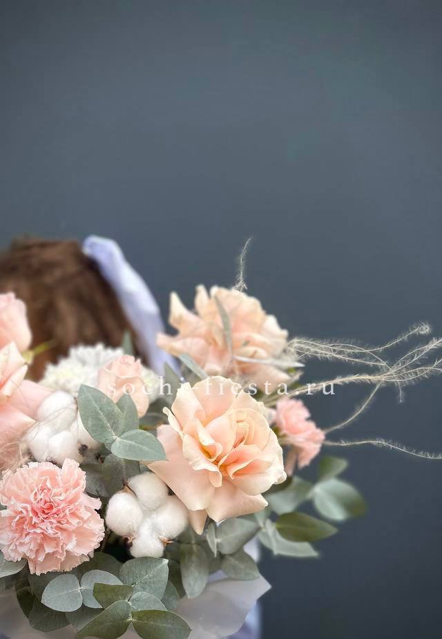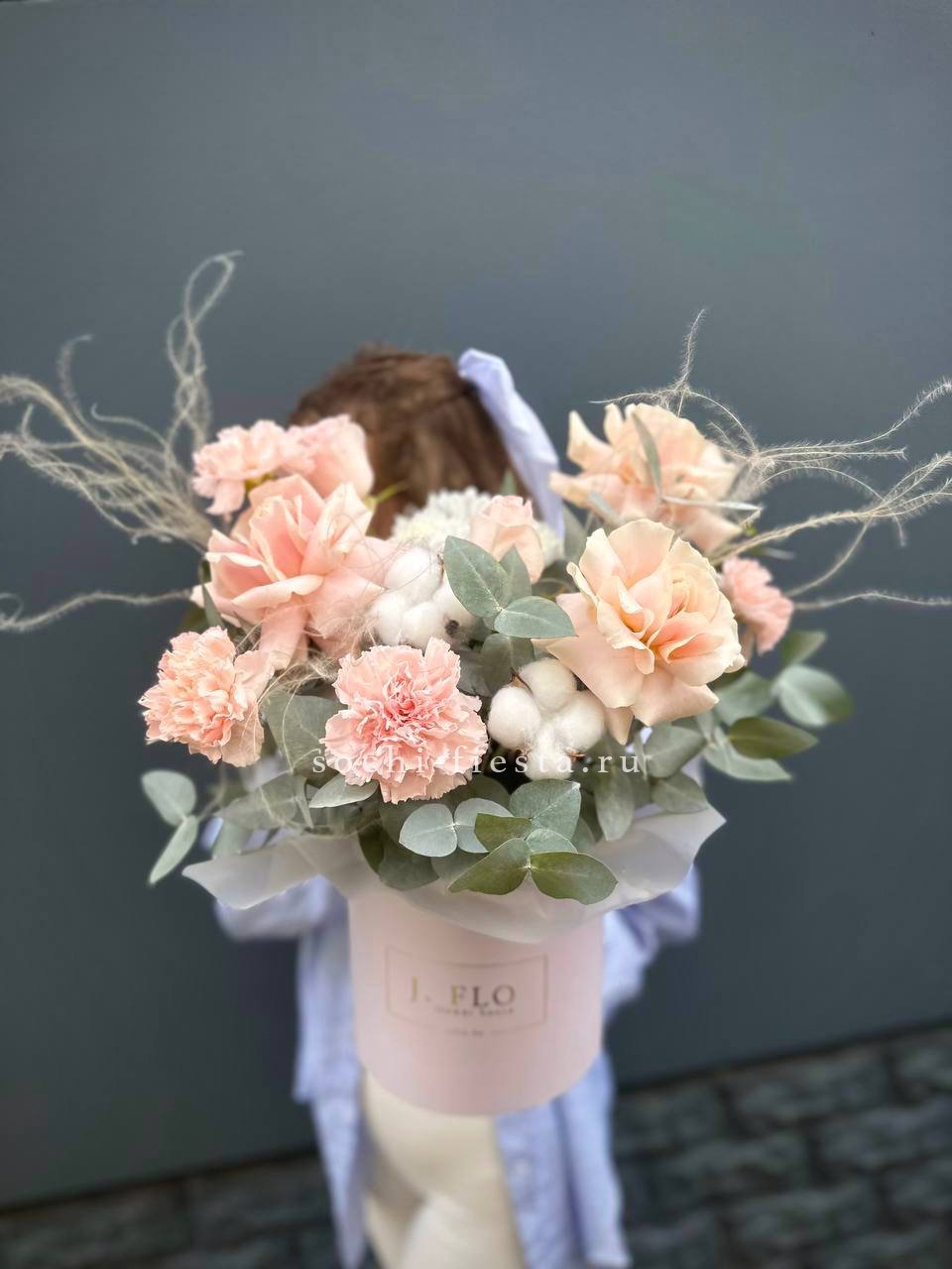 Тридцать одна роза в коробке-сердце создаёт объёмное облако из белых и пудровых бутонов. Плотная сборка и мягкие переходы оттенков формируют цельный романтичный образ.