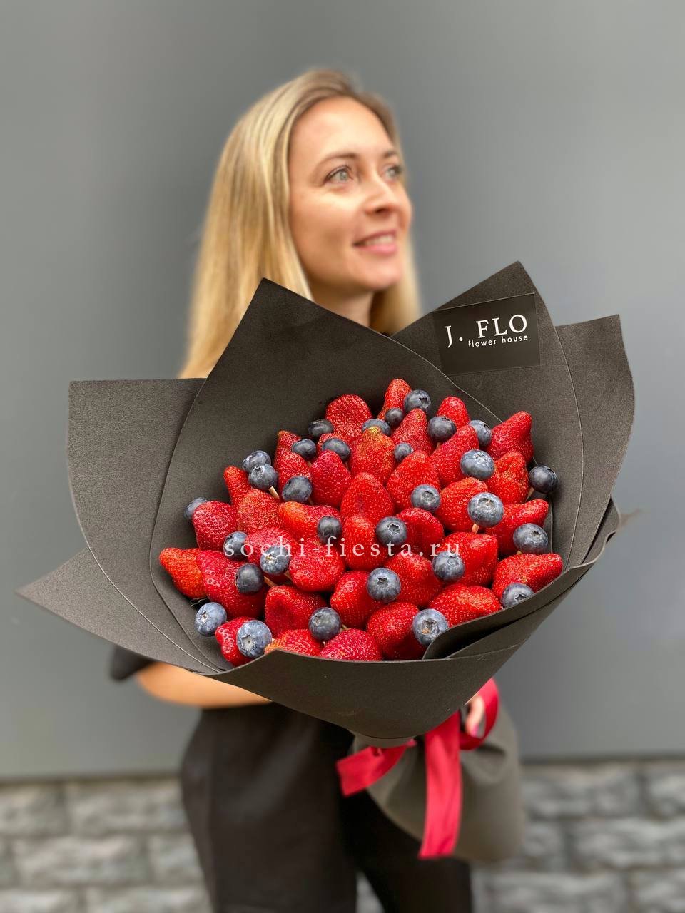 1000 г. ароматной клубники, 200 г. голубики, лента, оформление.