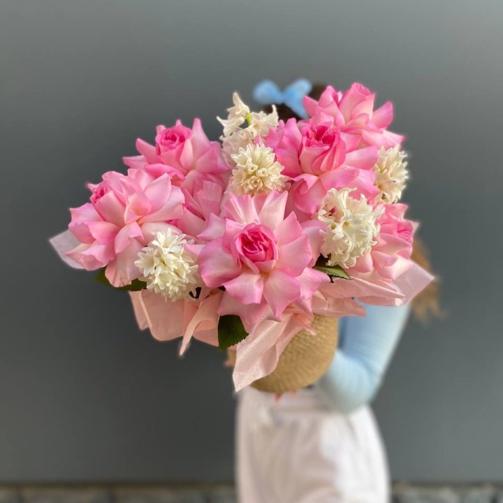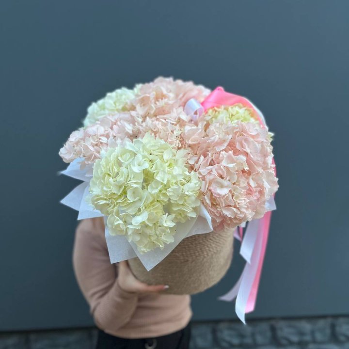 Наполнение подбирается под сезон. Зимой — амариллис, розы, ранункулюсы. Весной — тюльпаны, ранункулюсы, фрезия. Летом — пионы в мае-июне, гортензия в июле-августе. Осенью — хризантемы и декоративные травы.