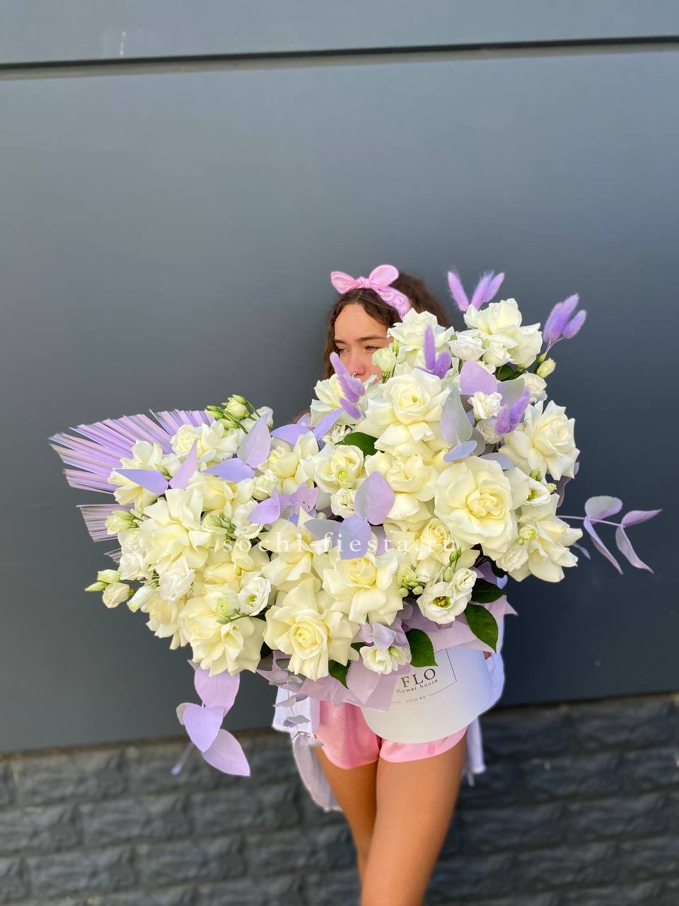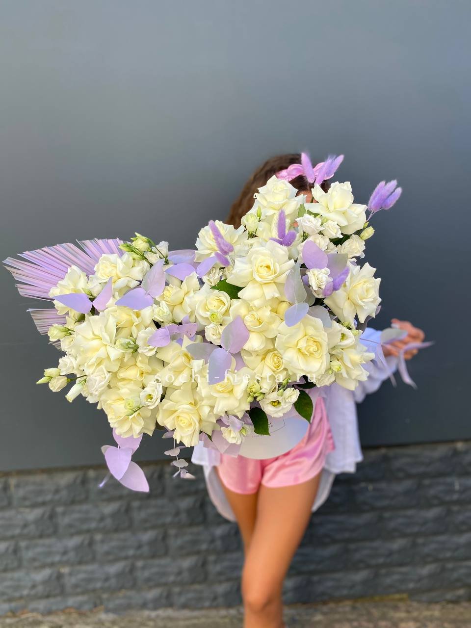 бокс 20D, белая французская роза, эустома, эвкалипт.