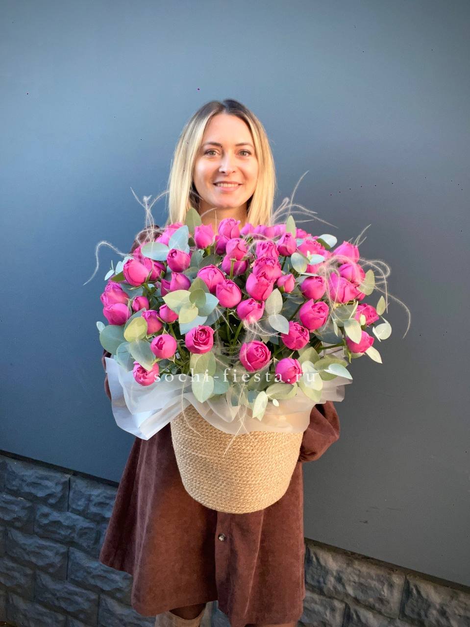 Пионовидные розы в джутовом кашпо