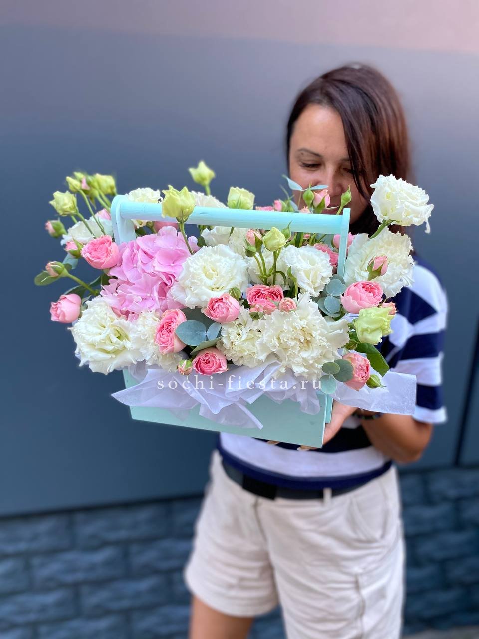 эустома, диантус, роза, кустовая роза, эвкалипт(фисташка), деревянный ящик, лента.