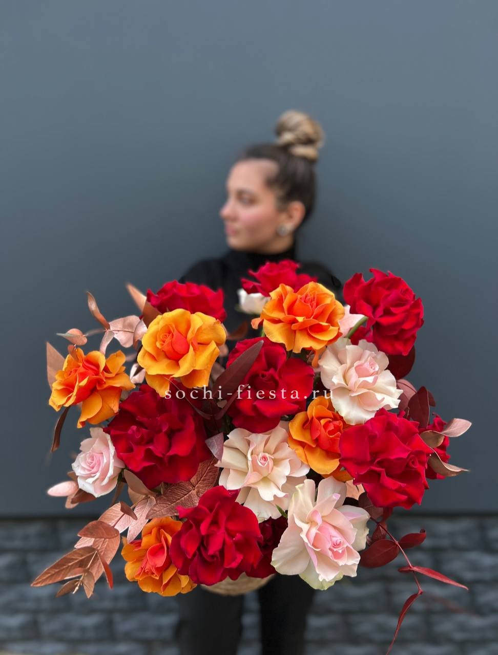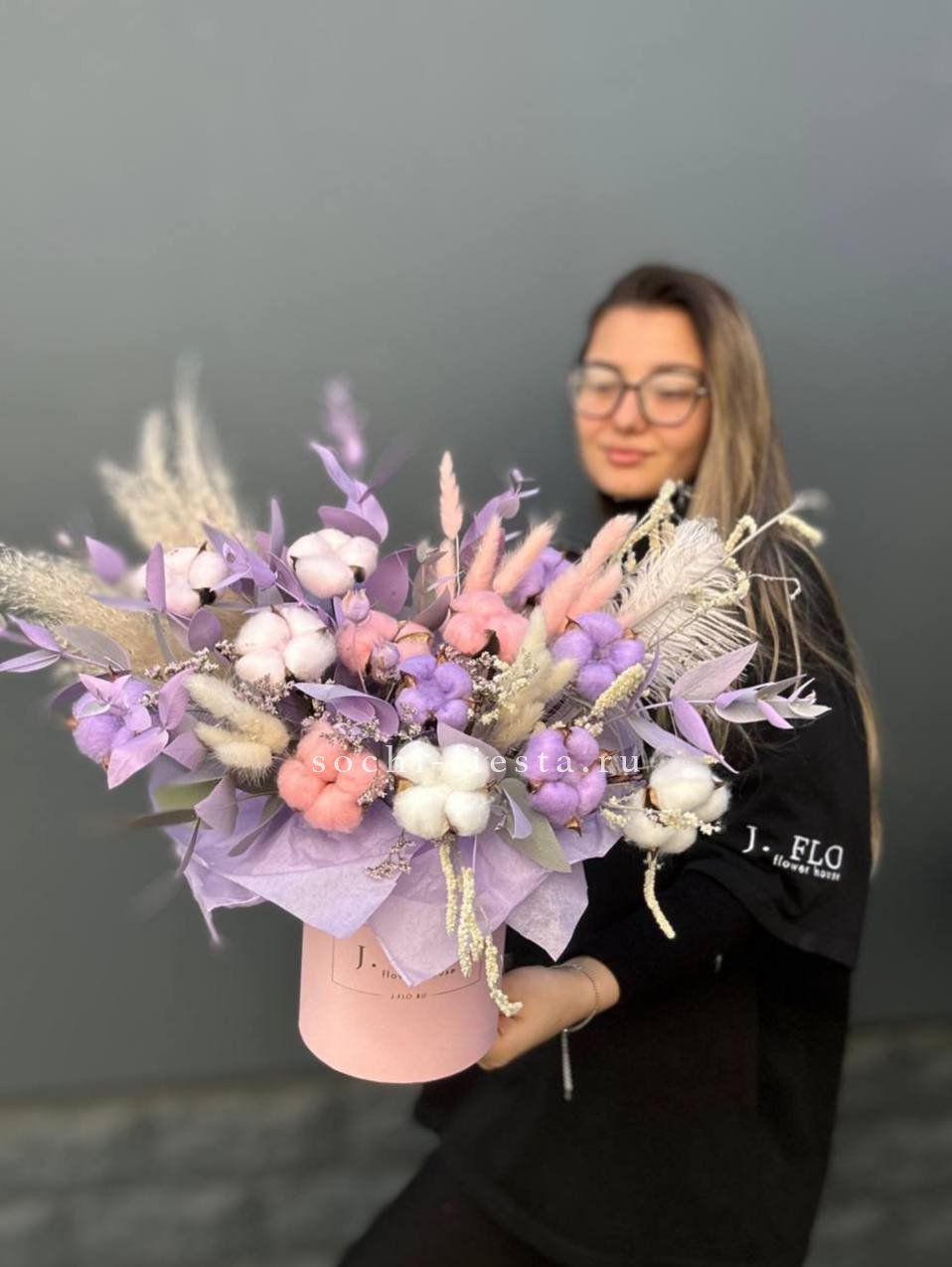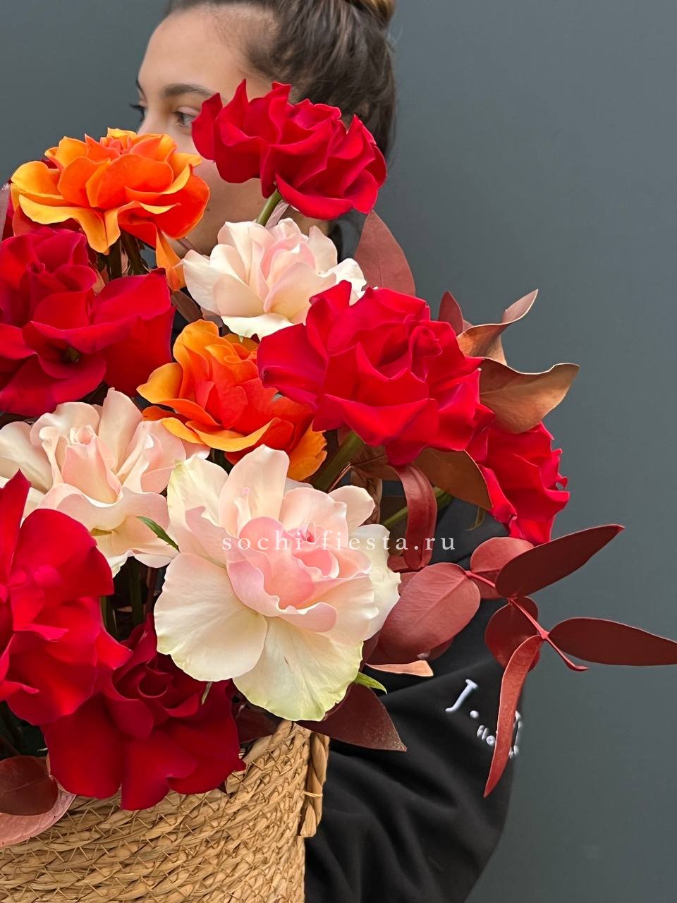 Французские розы собраны в плотную округлую форму и дополнены серебристыми ветками эвкалипта. Натуральное джутовое кашпо придает композиции естественность и законченность.