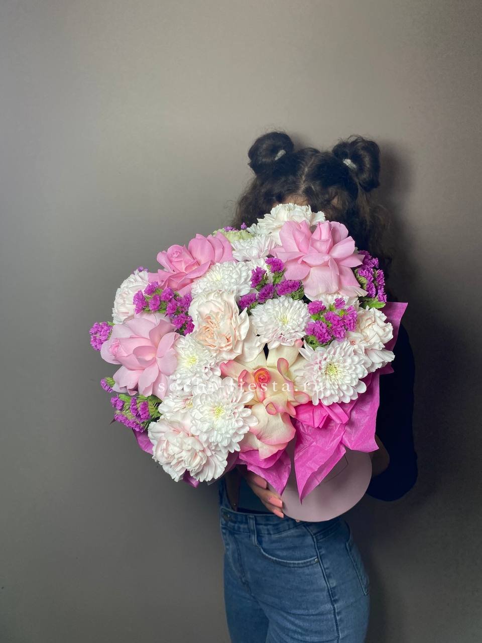 Яркие соцветия роз и хризантем в обрамлении воздушной статицы создают праздничную композицию с насыщенной палитрой. Идеальный подарок для выражения самых теплых чувств в важный день.