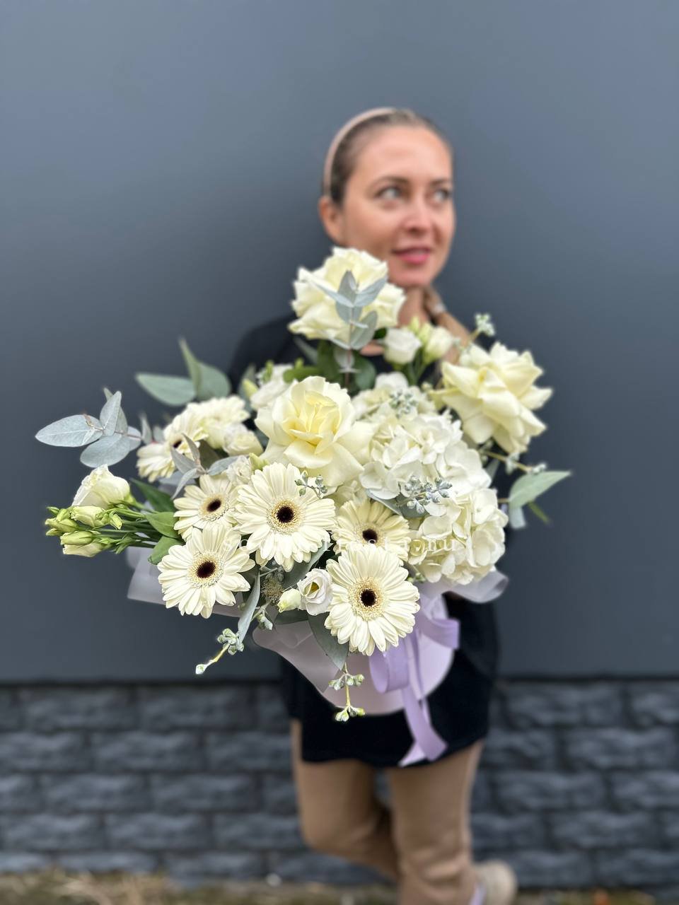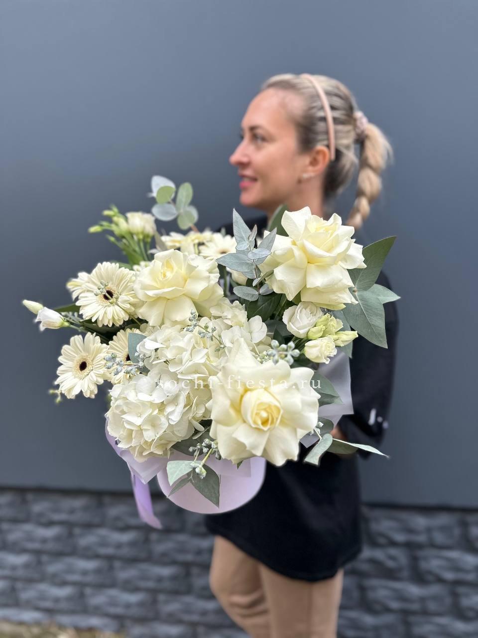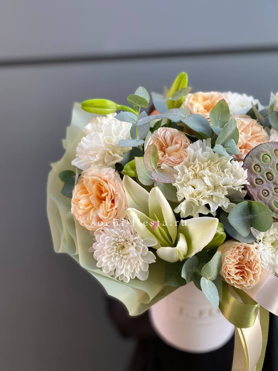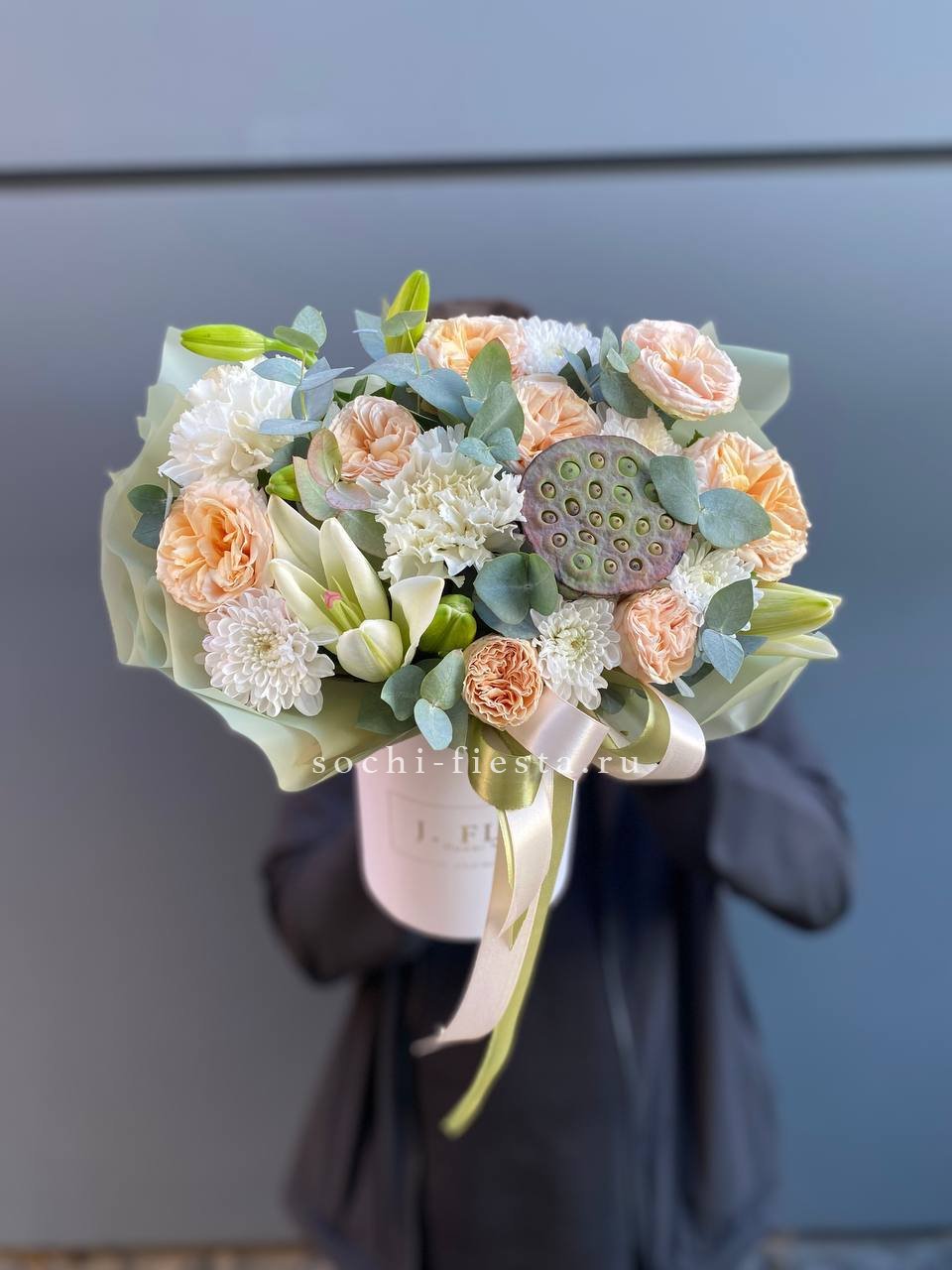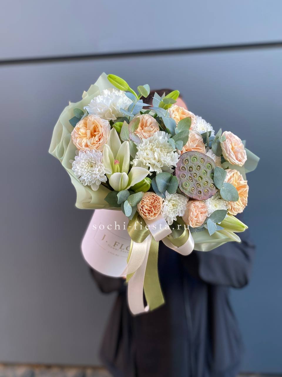 Белые лилии и кустовая роза встречаются с лотосом и диантусом в небольшом боксе. Эвкалипт добавляет свежести легкой водной палитре.