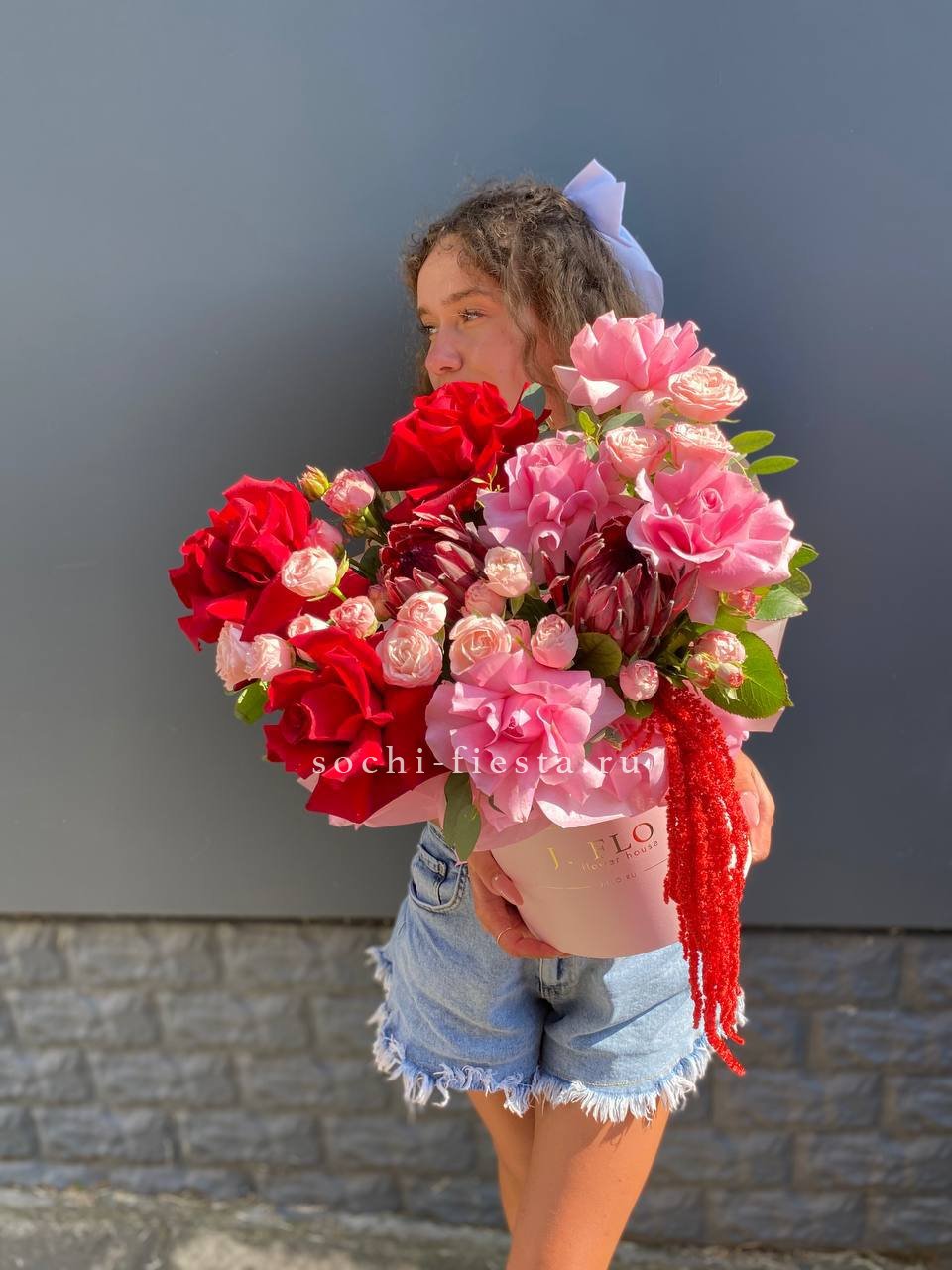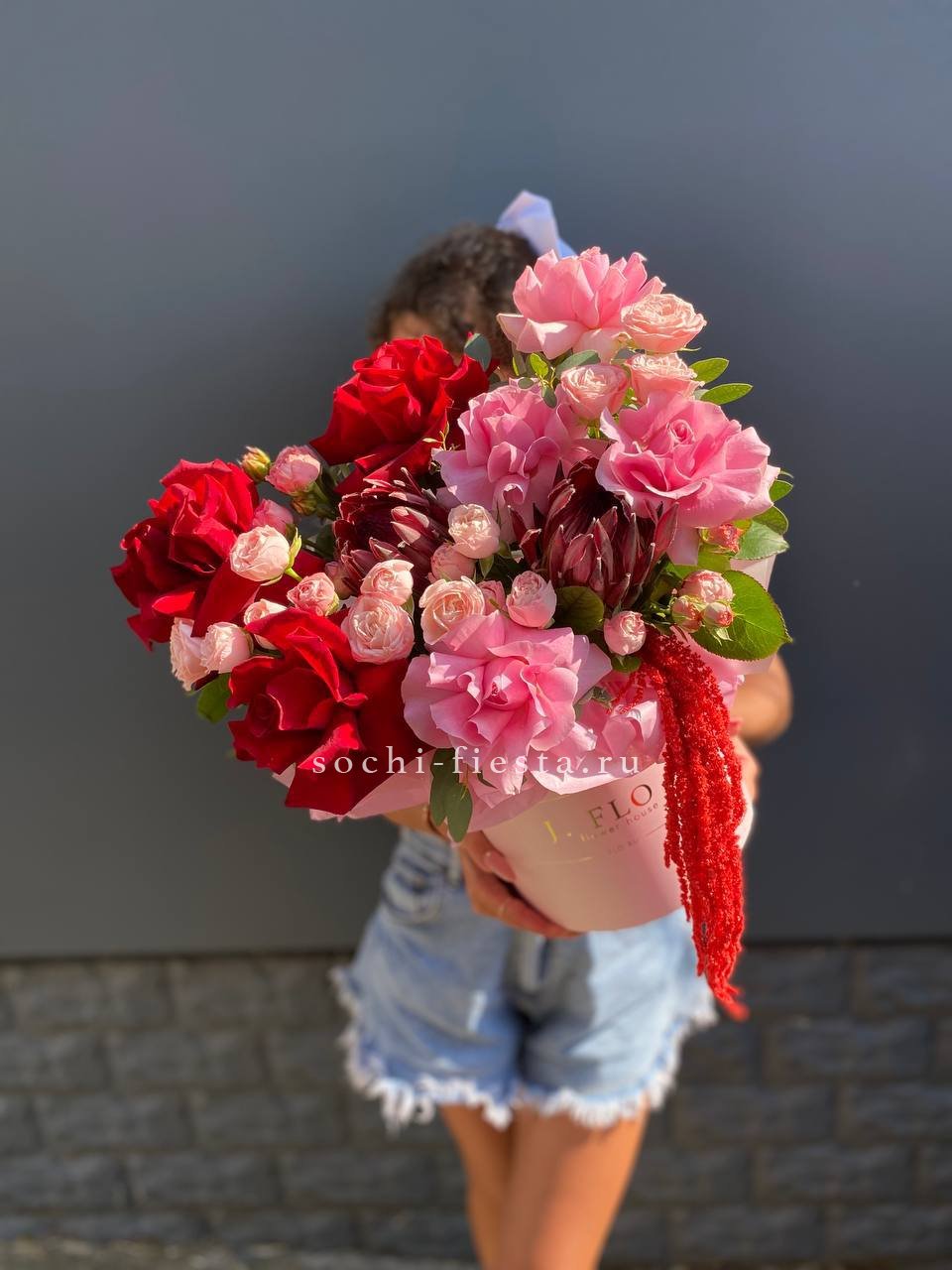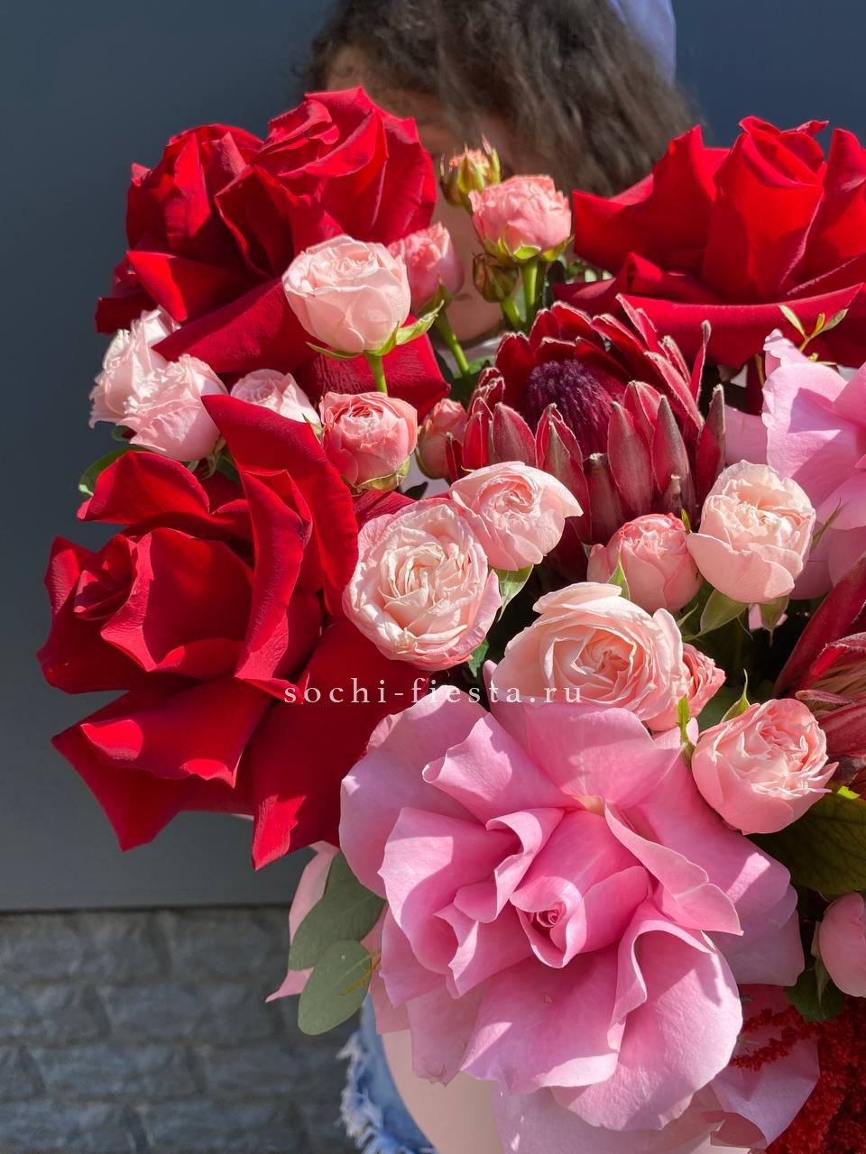 Букет выполнен в насыщенной красно-розовой гамме, создавая контрастное и выразительное сочетание, которое может символизировать сильные чувства или страсть. Это современный авторский букет, который выглядит роскошно и эффектно, подходящий для особых случаев и подарков.