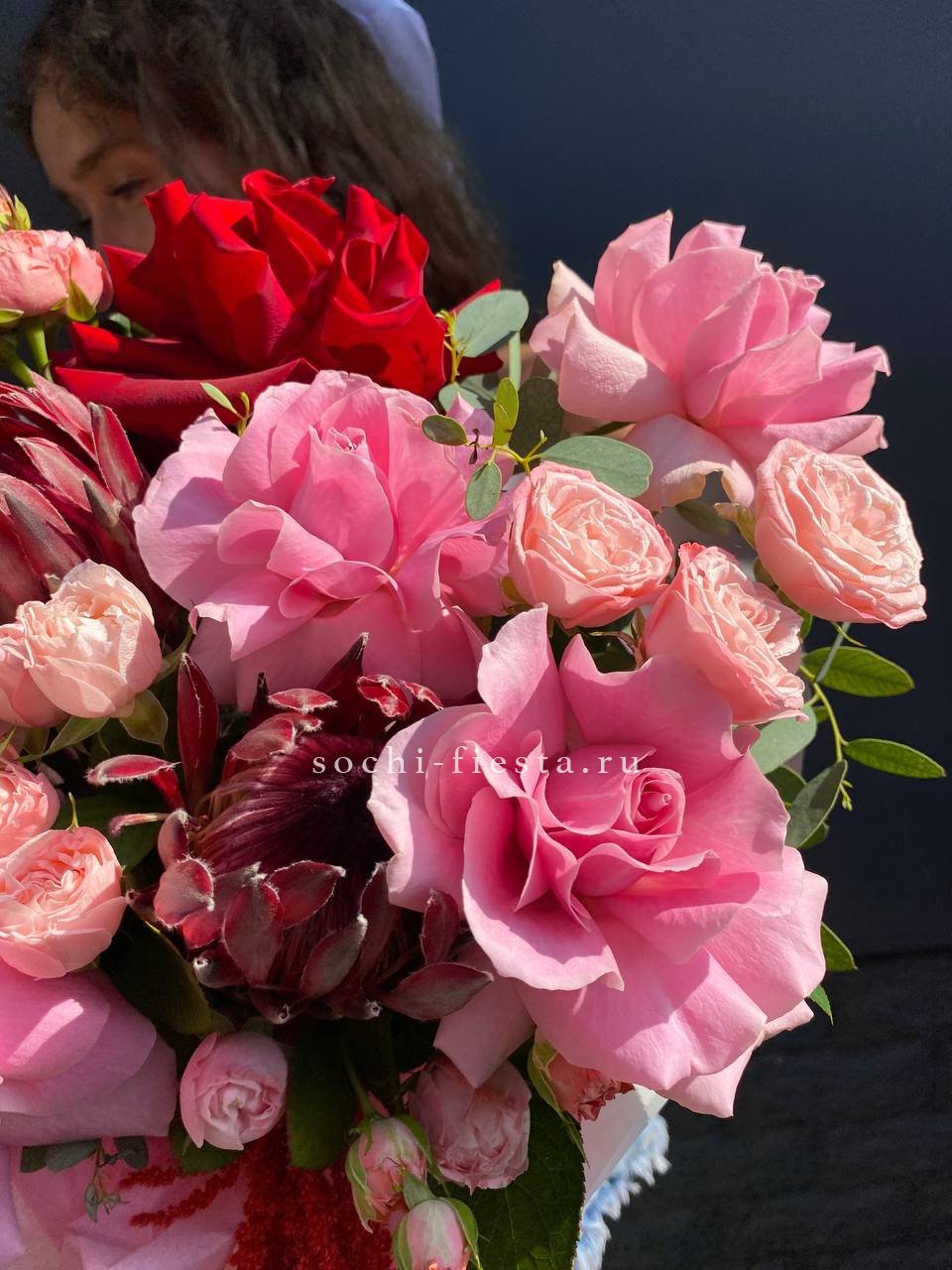протеи, розовые розы, красные розы, кустовые розы, амарант, тишью, цилиндр D16.