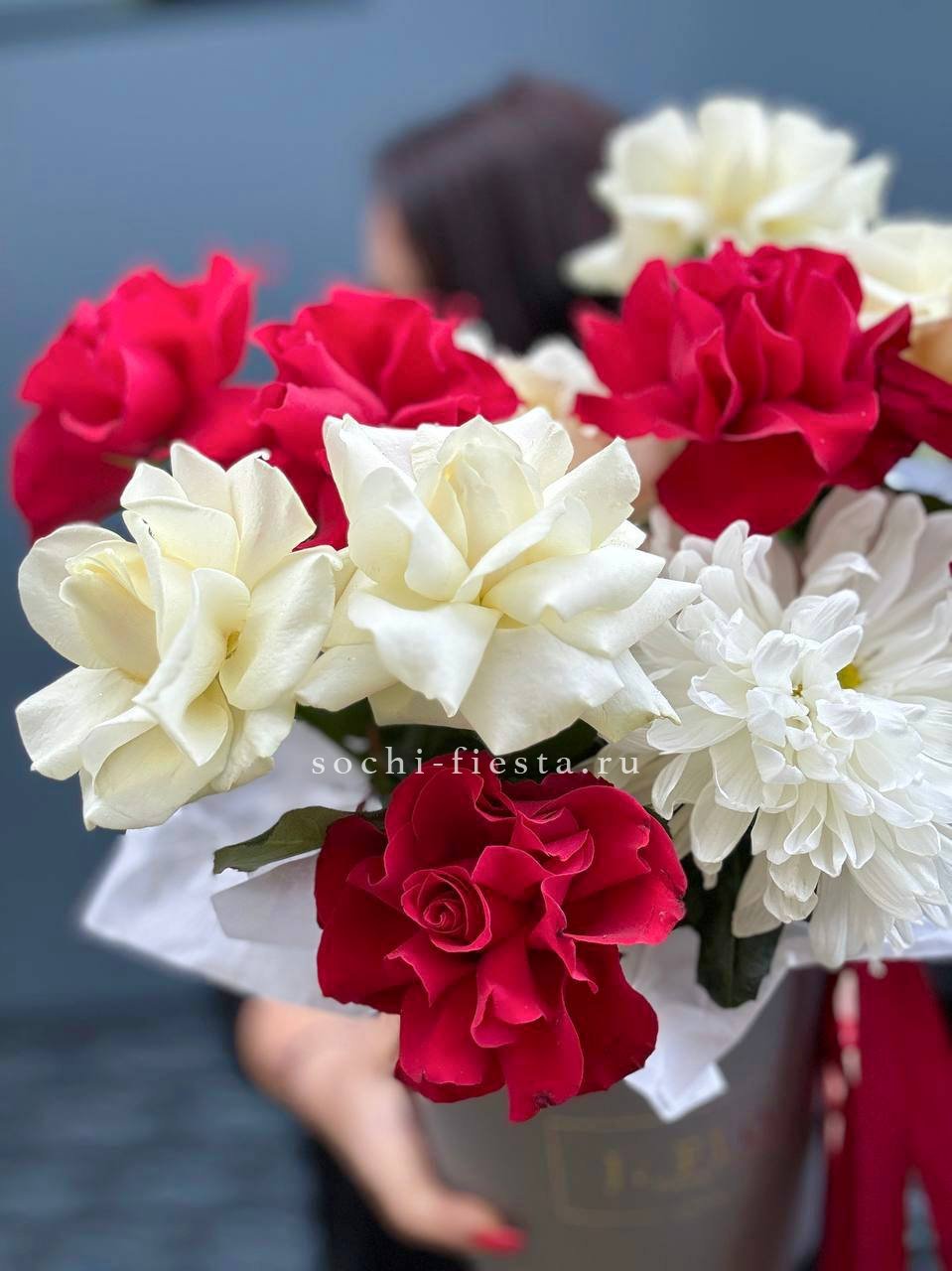 белые розы, красные розы, хризантема, цилиндр D16, лента.