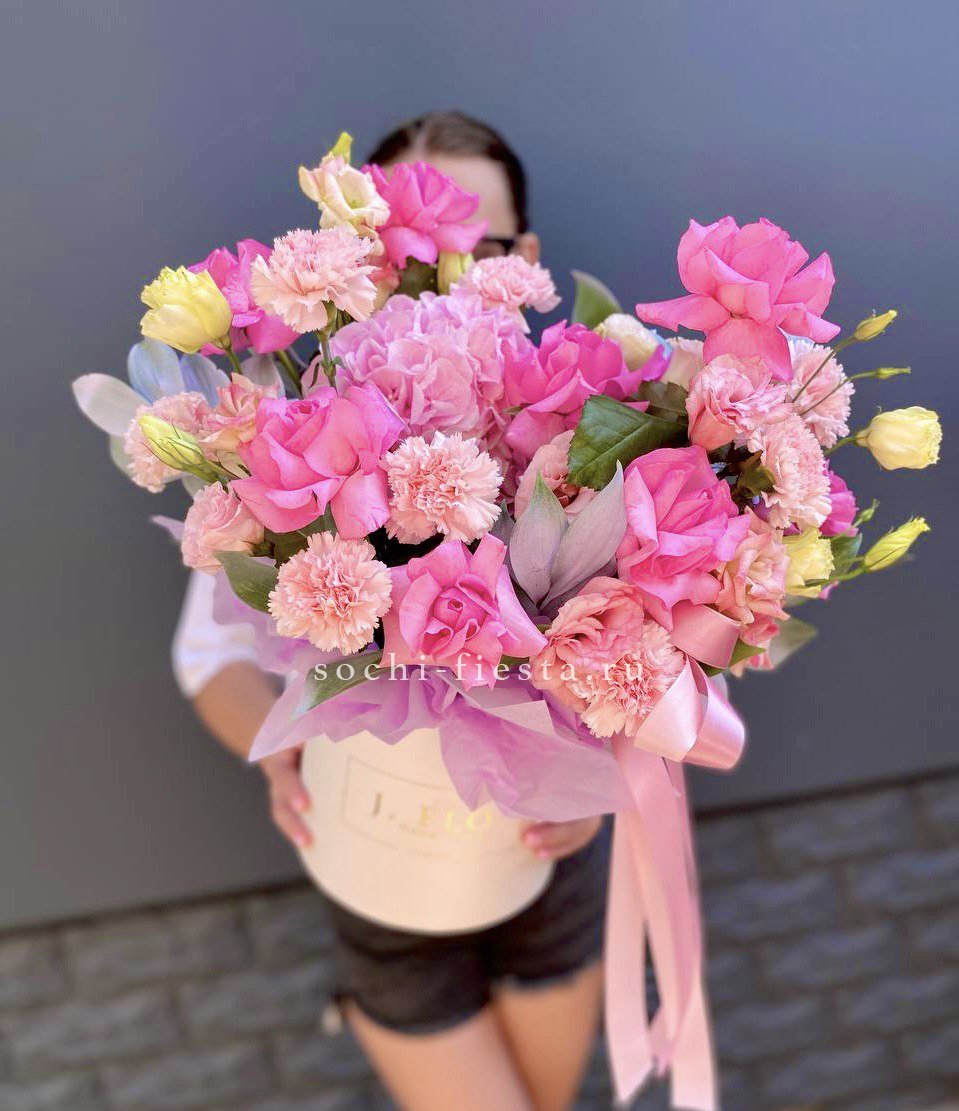 Пионовидные кустовые розы собраны плотно, создавая объёмную композицию с живой текстурой. Лимониум и эвкалипт добавляют воздушности, а цилиндр собирает всё в компактную форму.