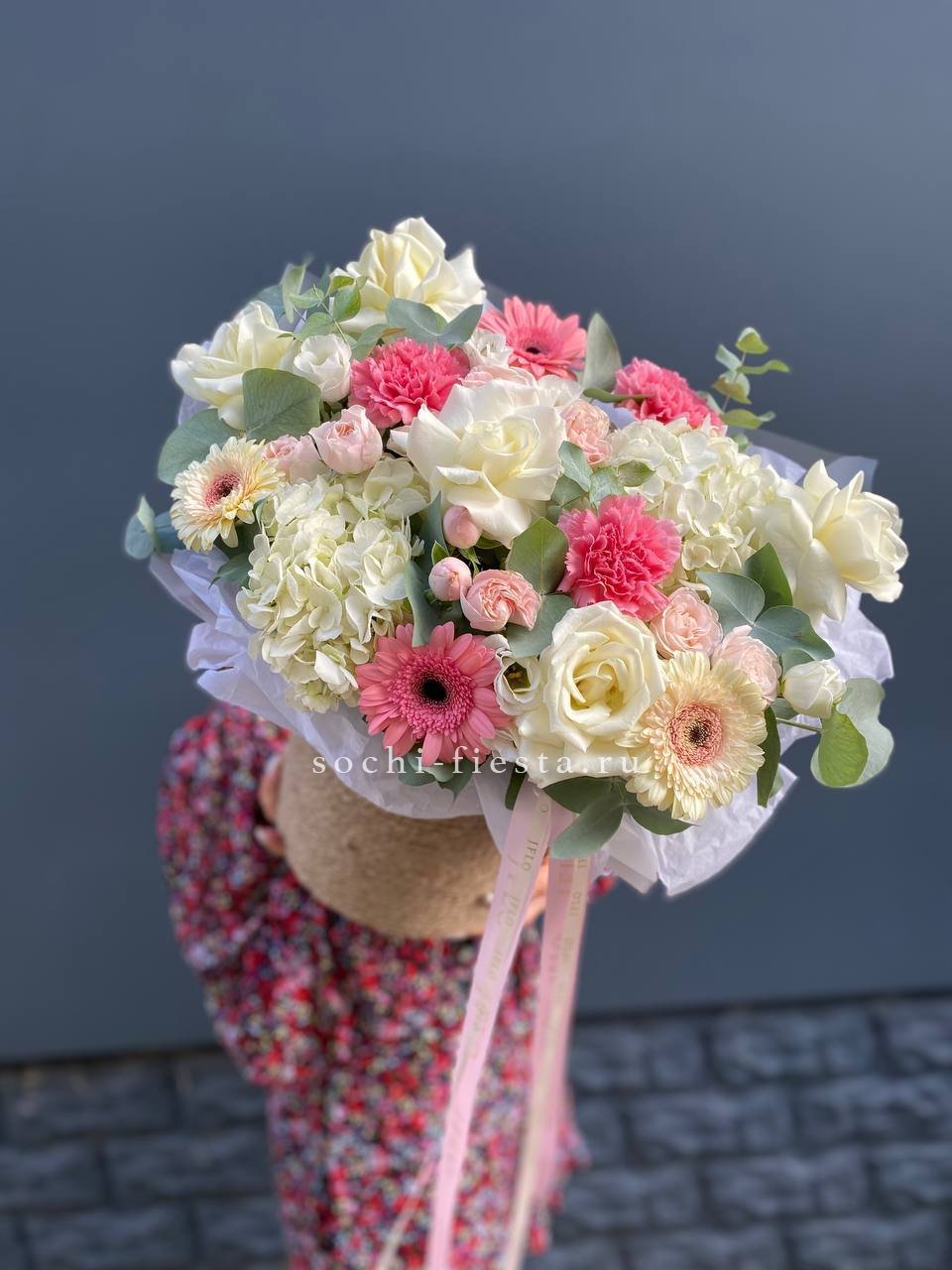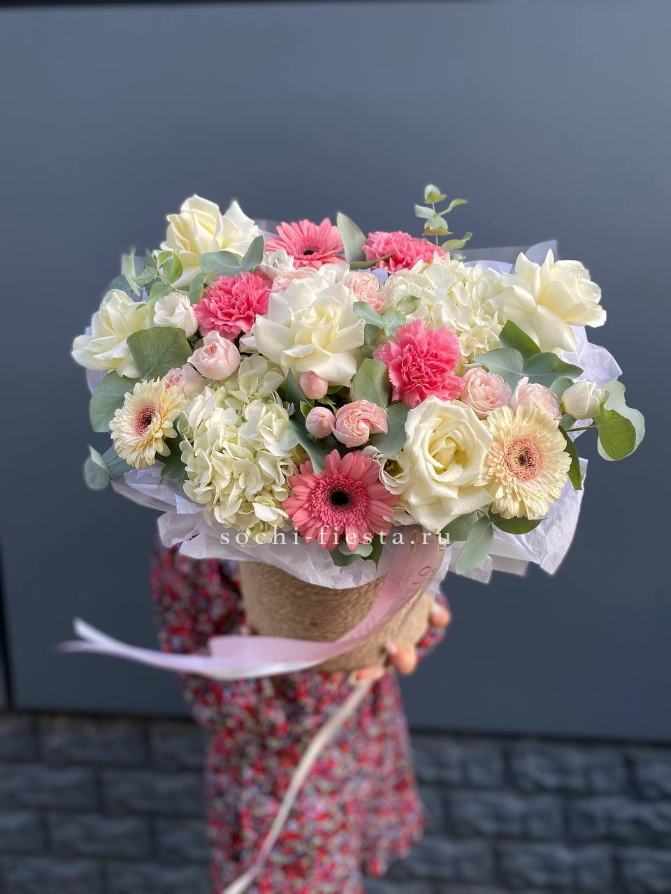 Пионовидные кустовые розы формируют плотный купол с мягкими переходами оттенков. Каждый бутон раскрывается слоями, создавая объёмную текстуру. Эвкалипт добавляет свежести композиции в цилиндре.