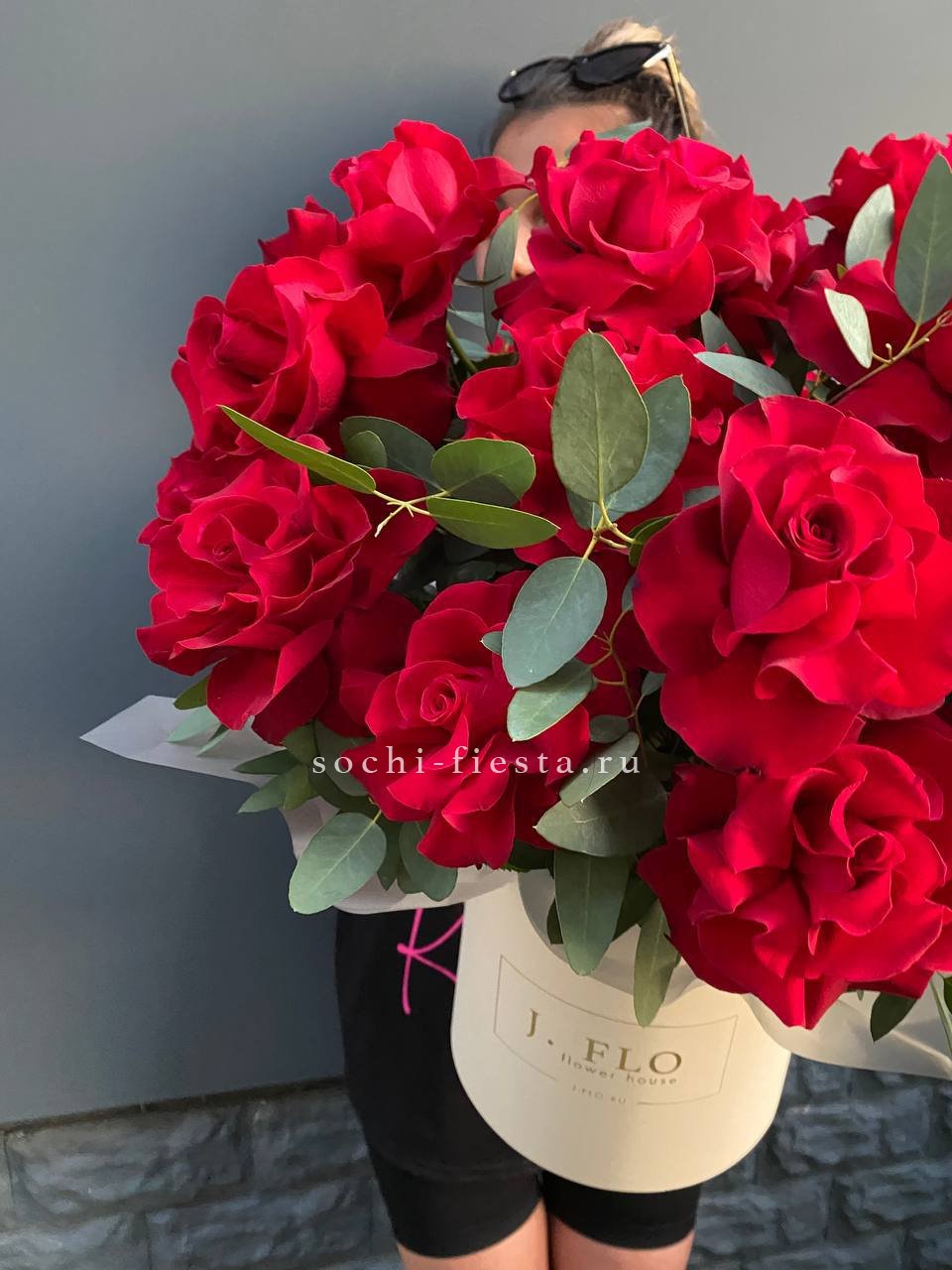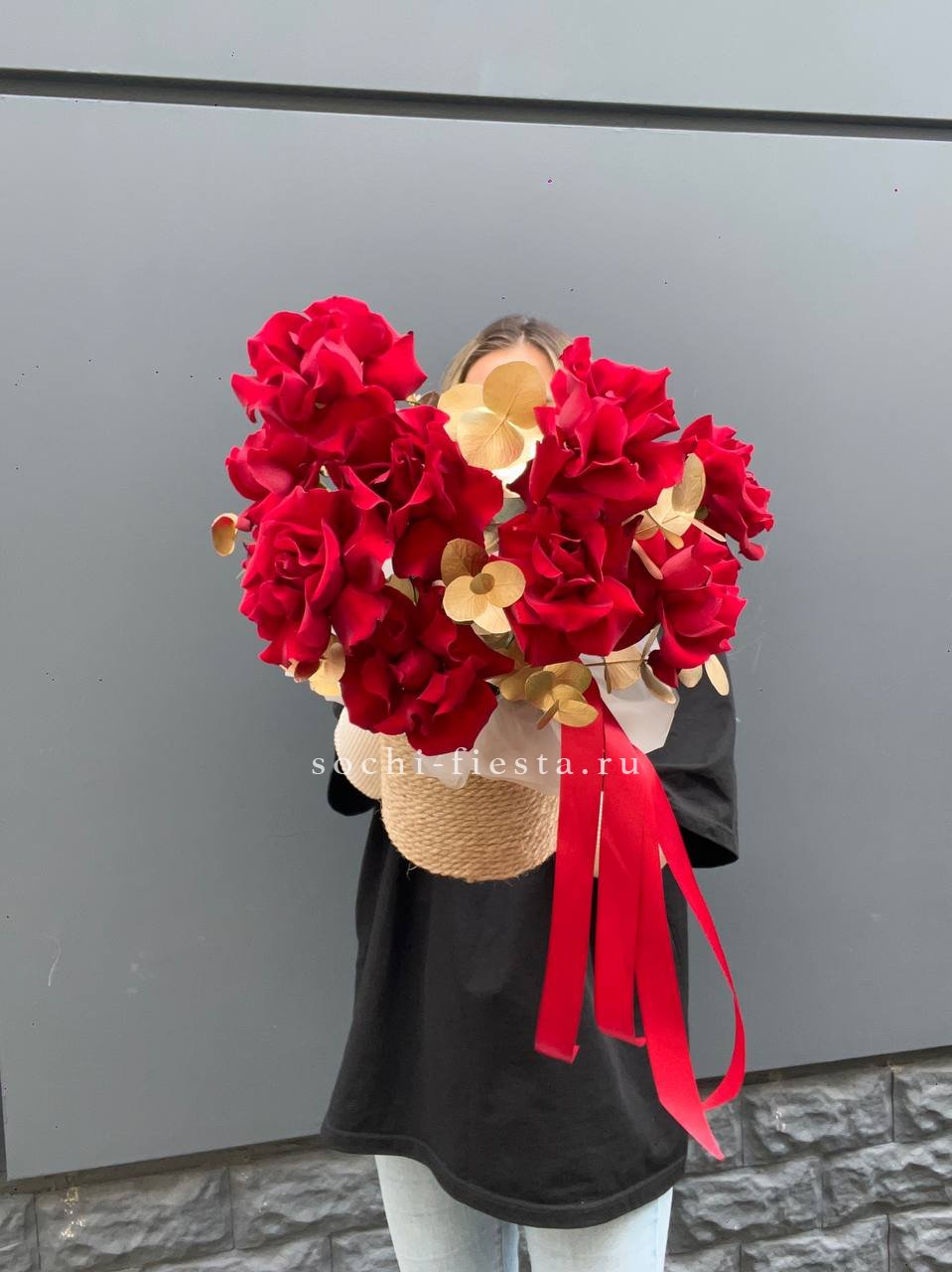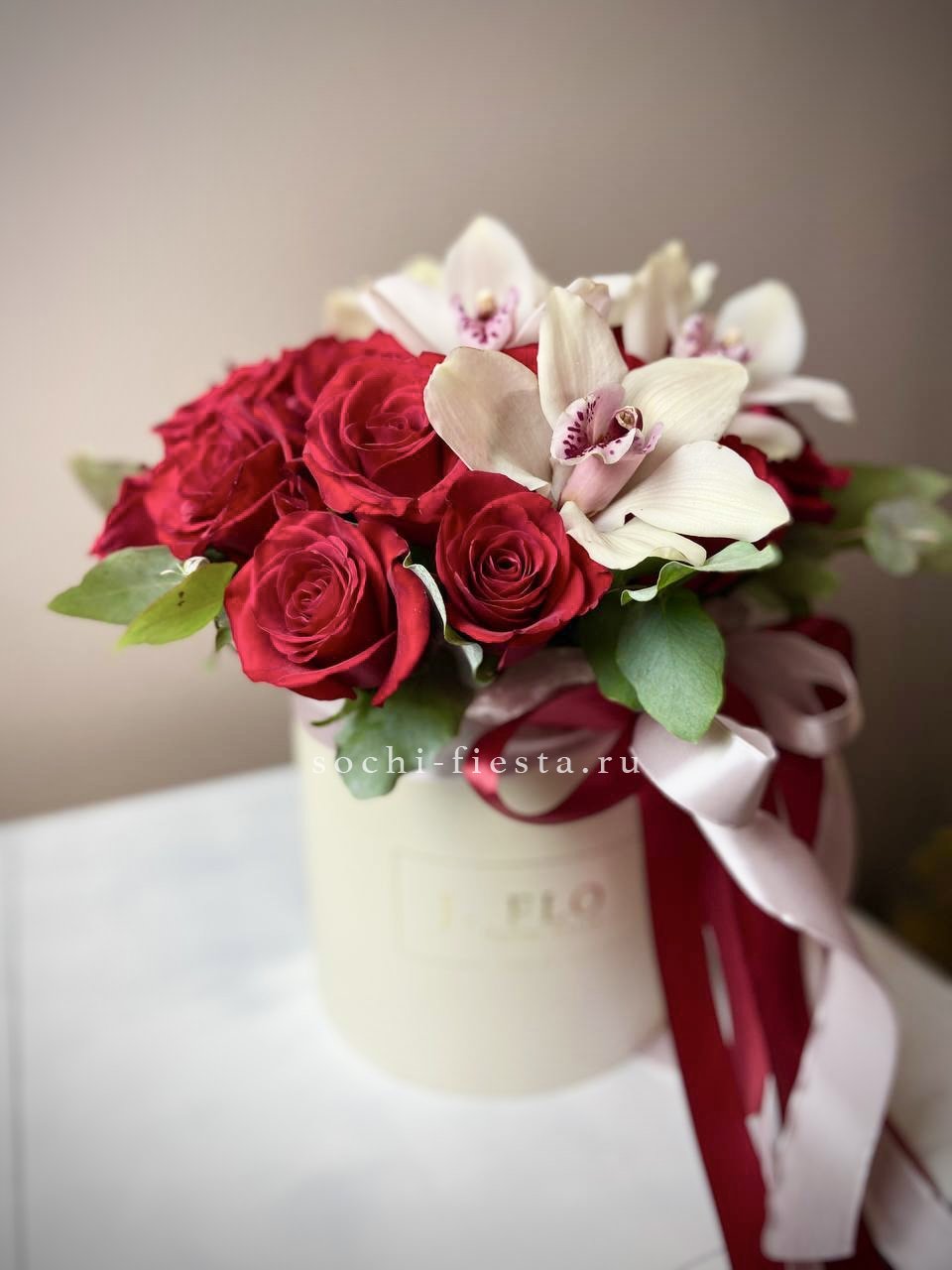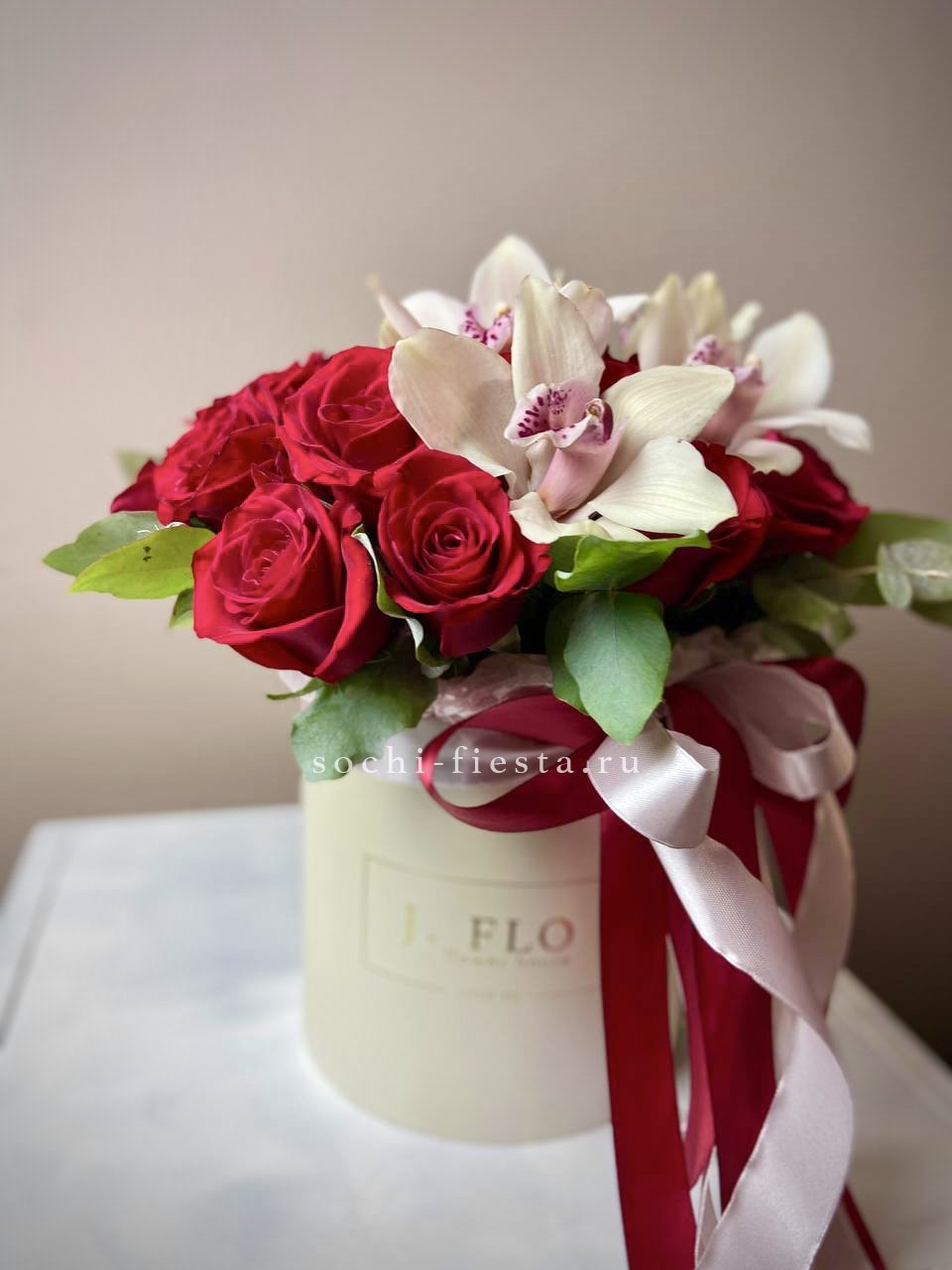 белые розы, красные розы, джумилия, цилиндр D20, лента.
