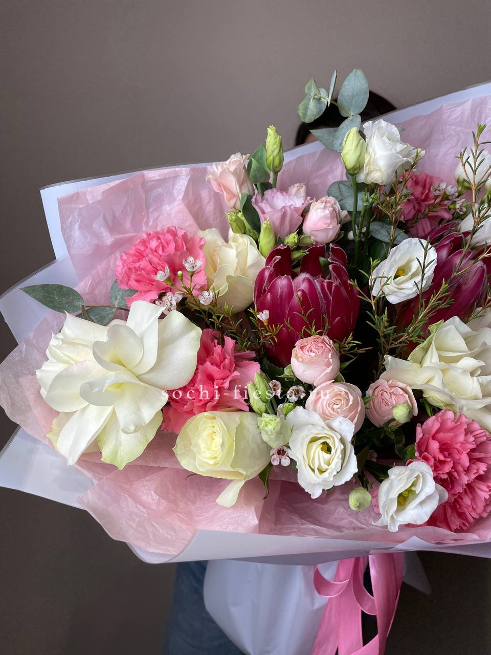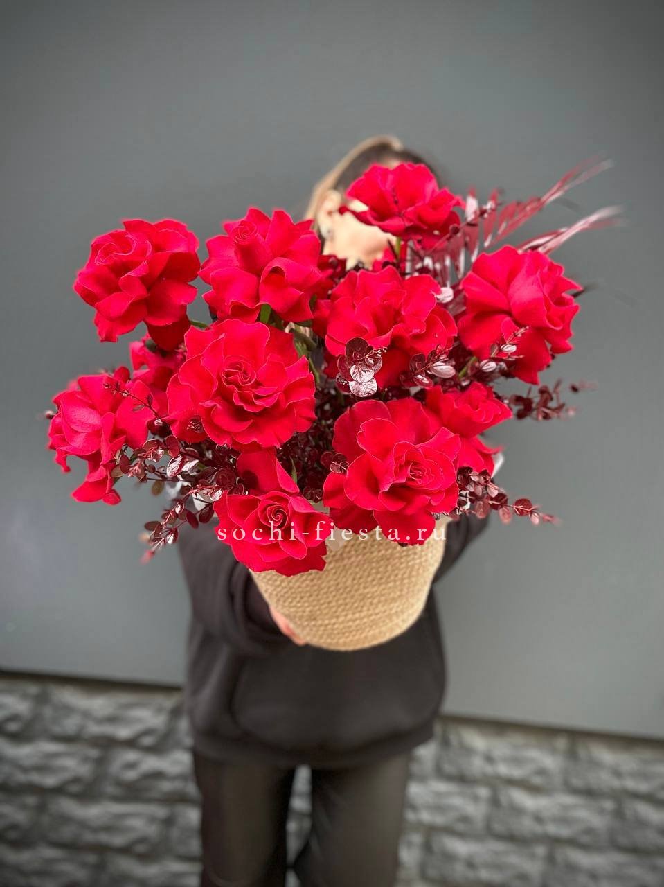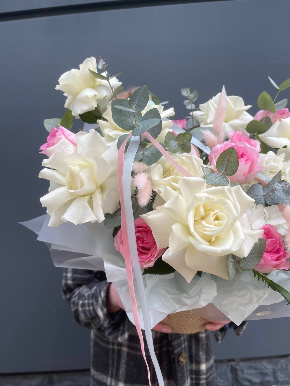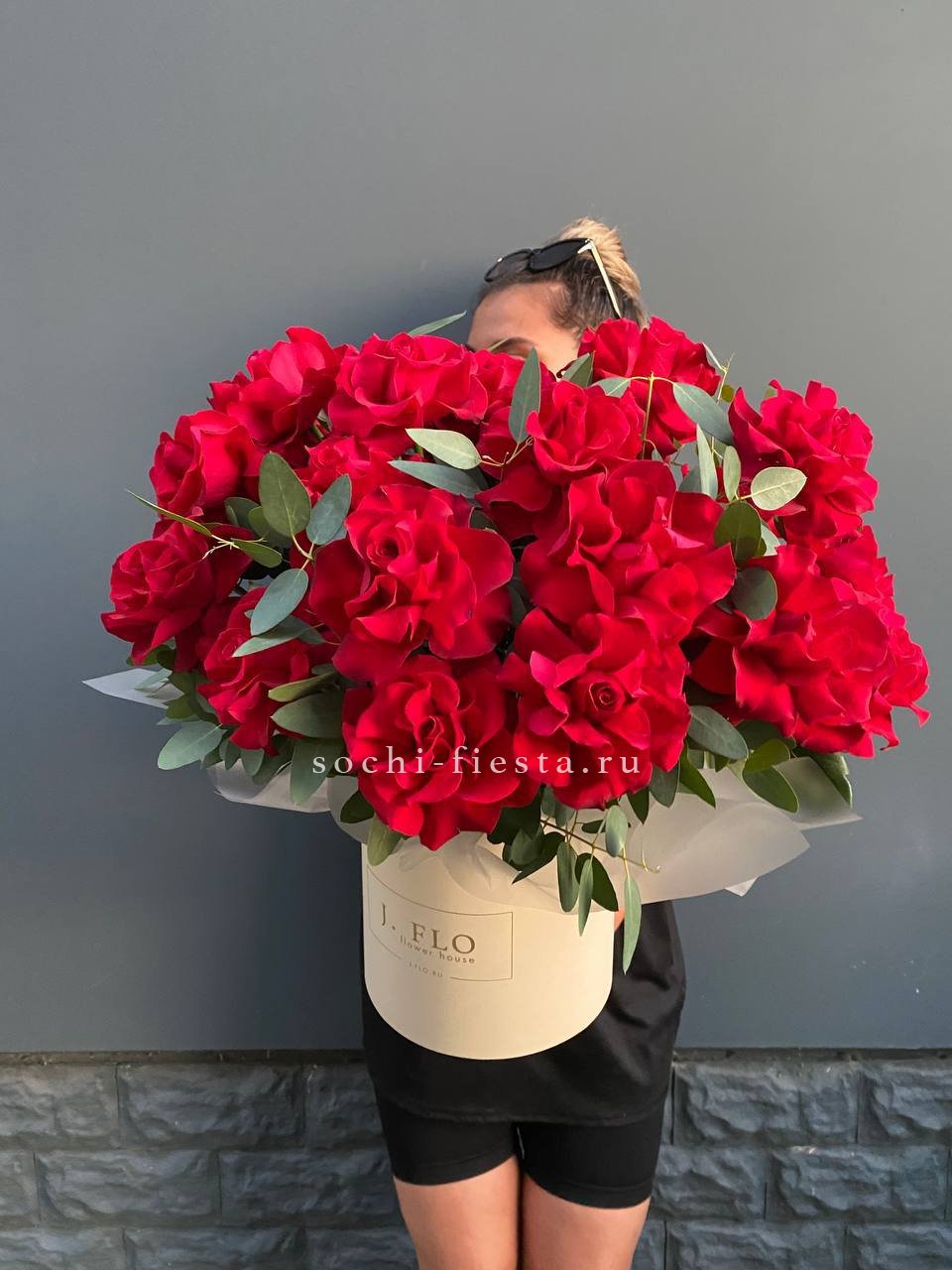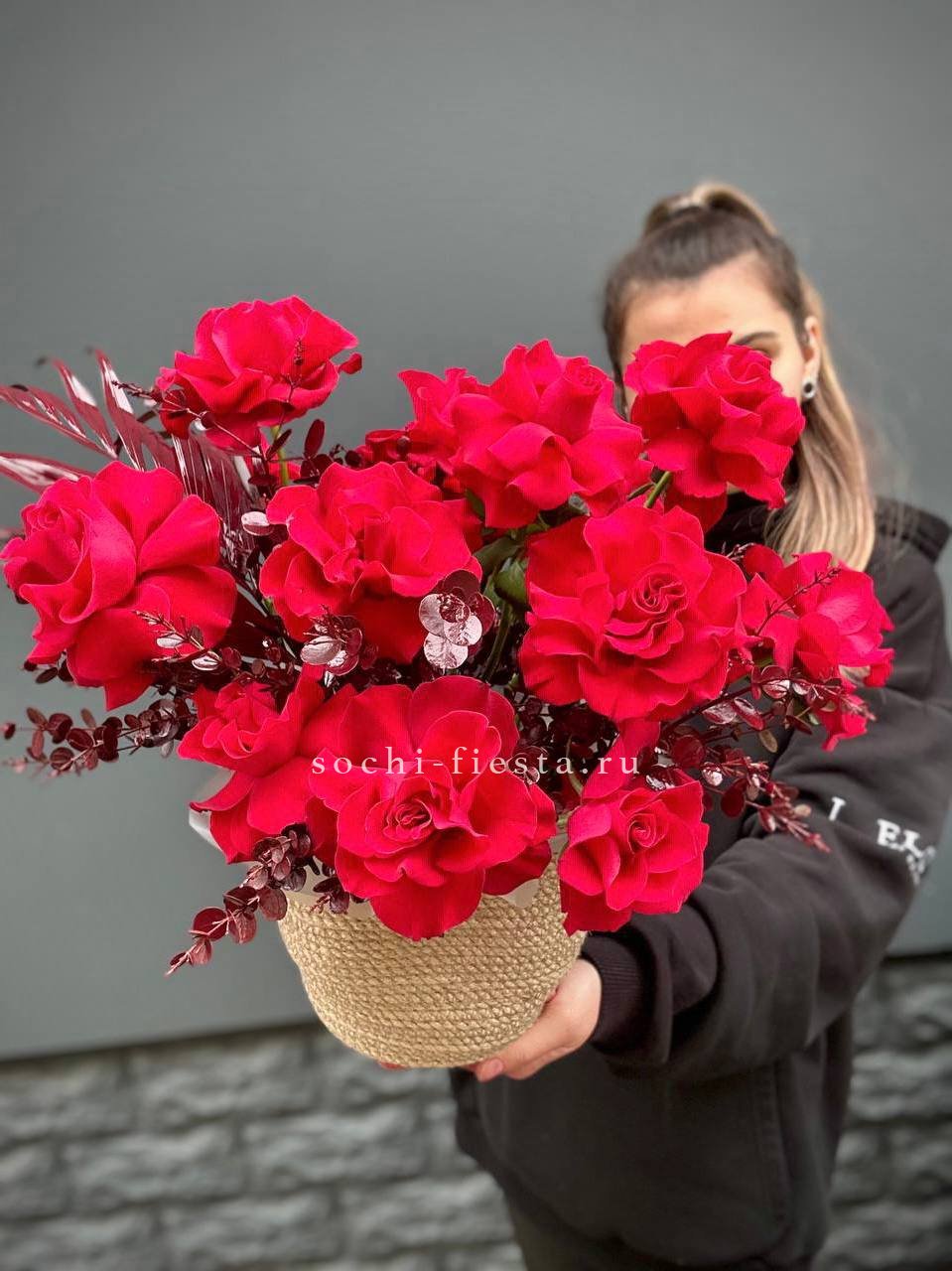 белые розы, красные розы, джумилия, цилиндр D20, лента.