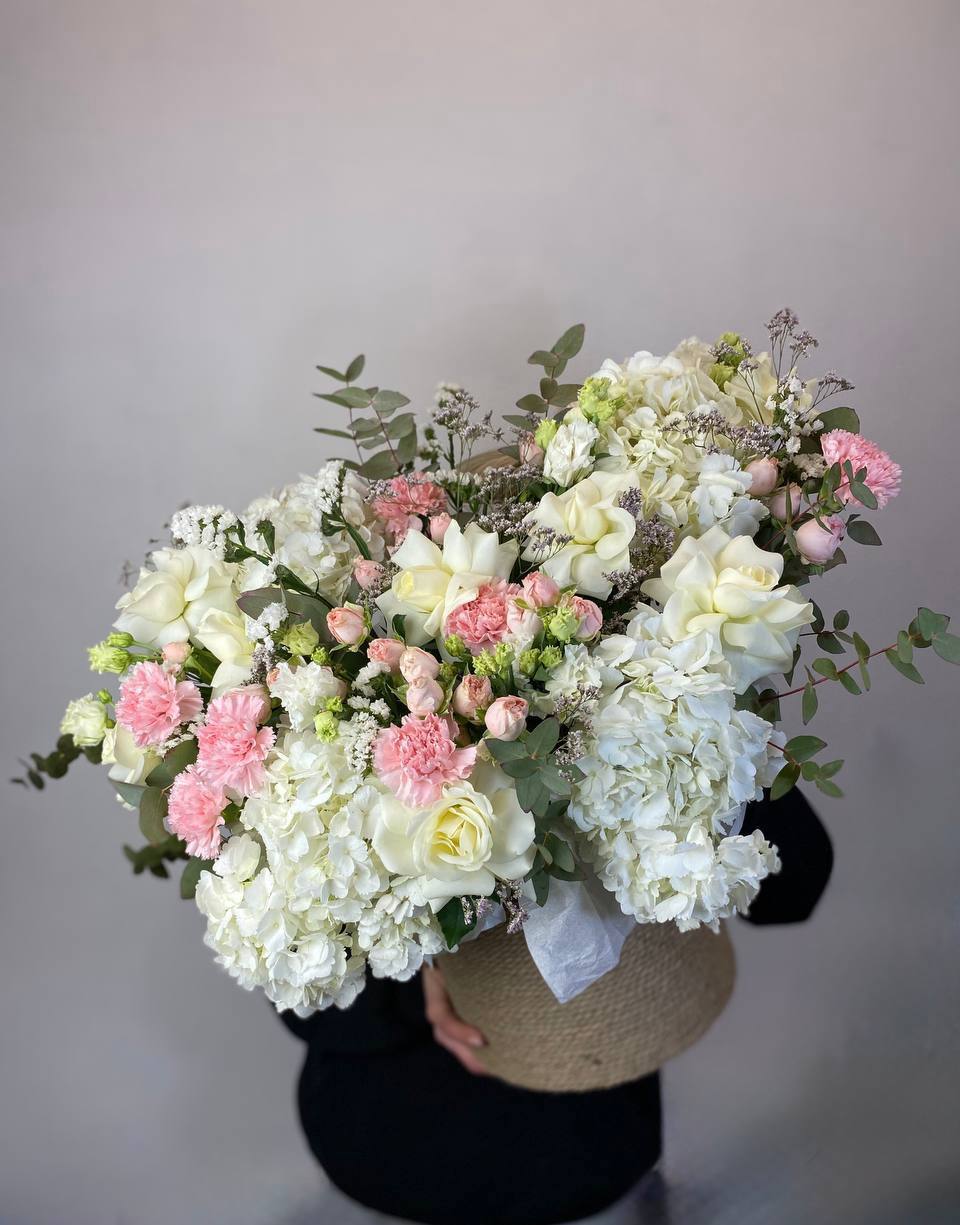 Белоснежные розы и воздушная гортензия создают объёмную композицию с мягкими переходами оттенков. Эустома и диантус добавляют фактурности, а лимониум заполняет пространство между крупными бутонами. Джутовое кашпо завершает природный образ.