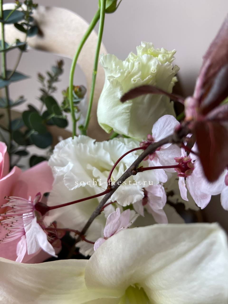 розовая роза, пионовидная роза, диантус, гортензия, эвкалипт, лента, сумка-кашпо.