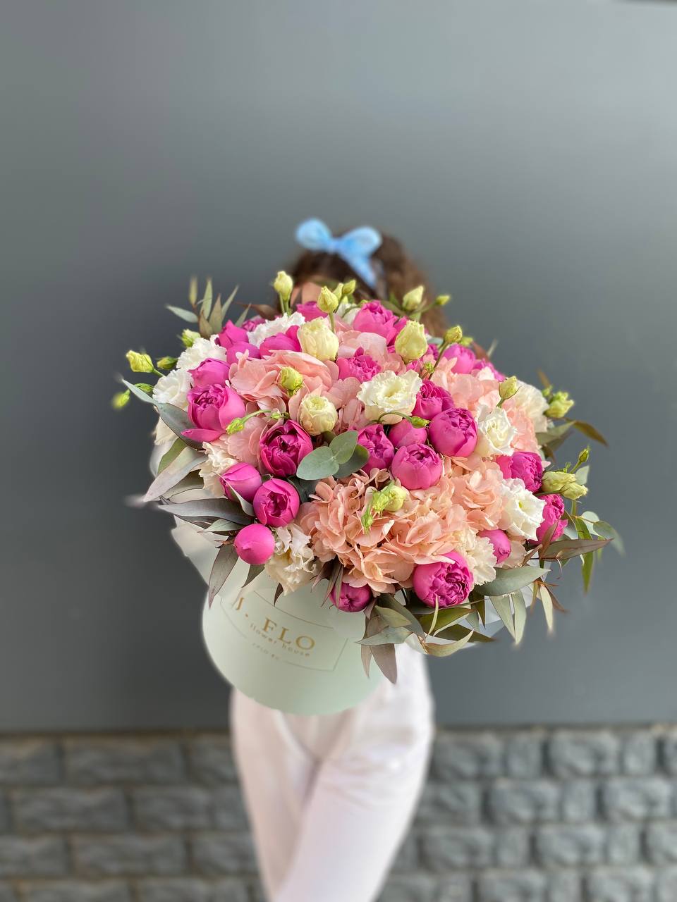 Пышные головки пионовидных роз задают объём, а мелкие соцветия диантуса разбивают плотность. Гортензия добавляет воздушную текстуру, эвкалипт смягчает линии. Композиция в сумке-кашпо выглядит свободно и живо.