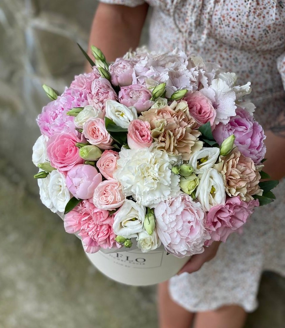 Гортензии задают плотную основу, герберы и диантусы вносят ритм, а альстромерии с эустомой создают движение вверх. Разнообразие форм и оттенков выстраивает многослойную картину в одной сумке.